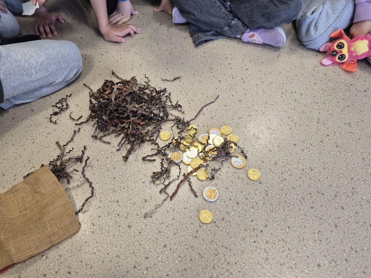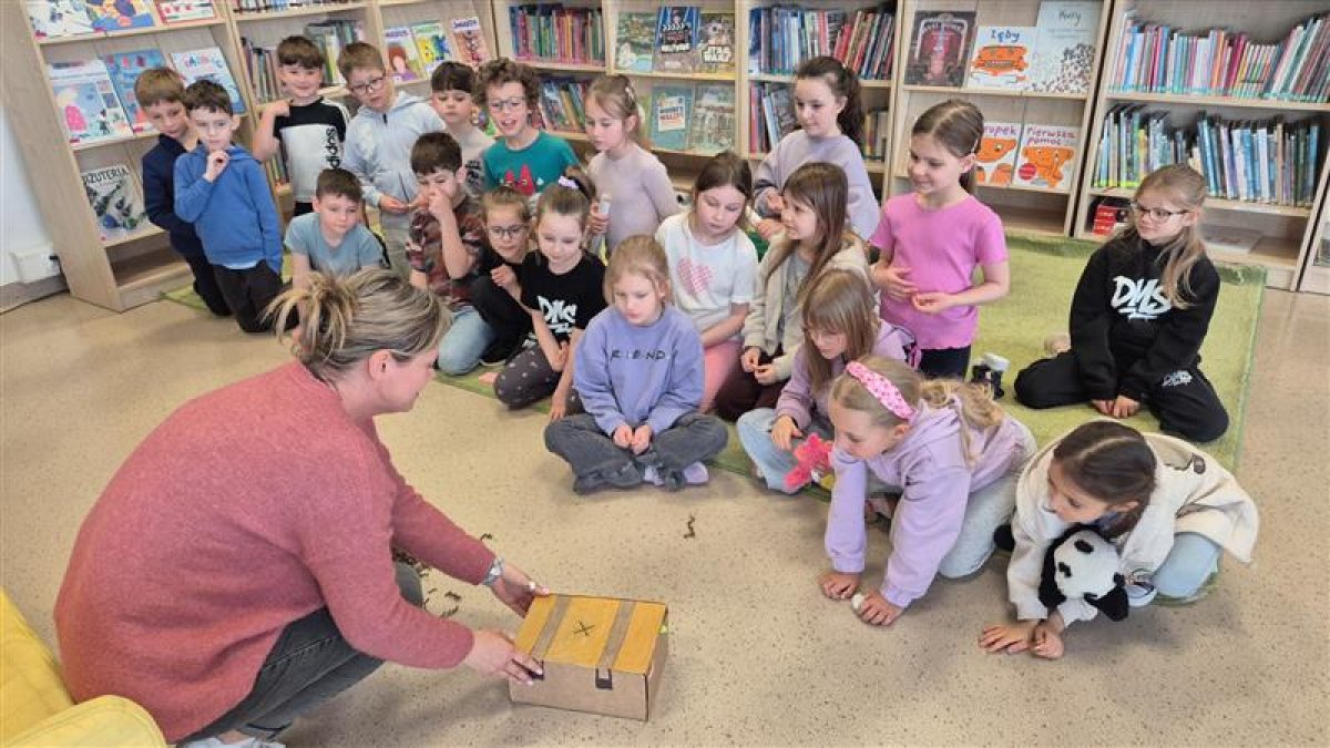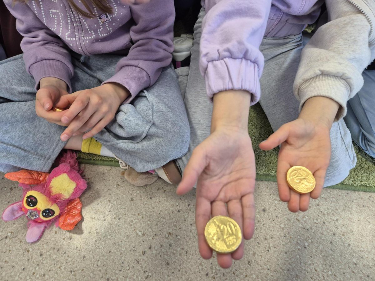 14 kwietnia uczniowie klasy 1a, wspierani przez starszych kolegów, doskonale poradzili sobie z odszukaniem wszystkich niespodzianek. Nagrodą było wysłuchanie fragmentów książki czytanej przez szkolną bibliotekarkę, słodkie „złote monety” oraz możliwość wykonania pamiątkowych zdjęć.