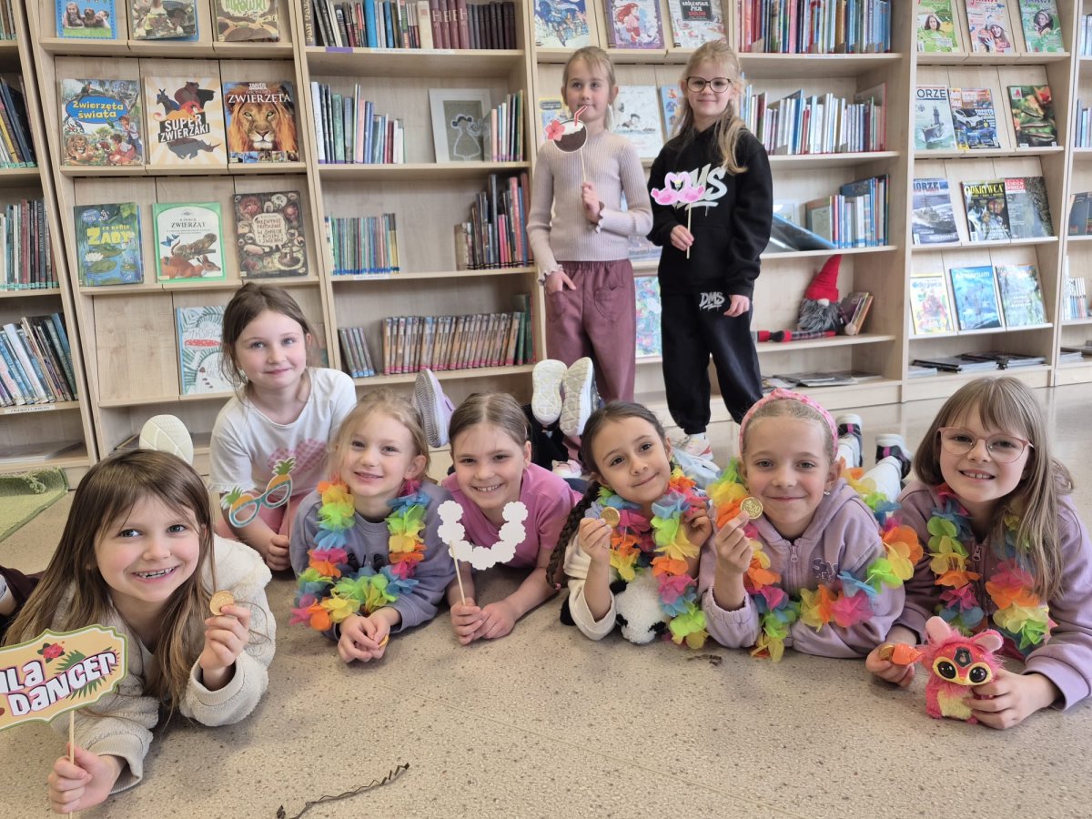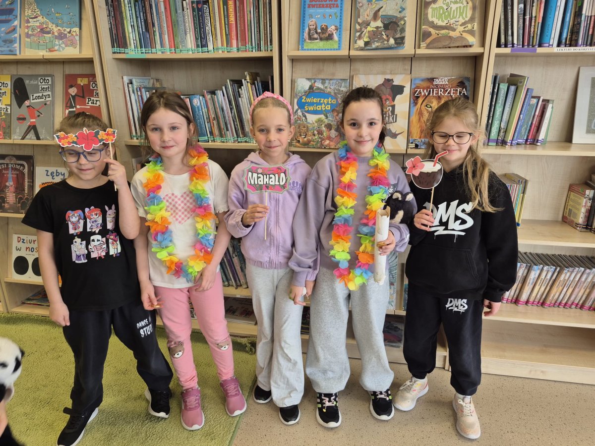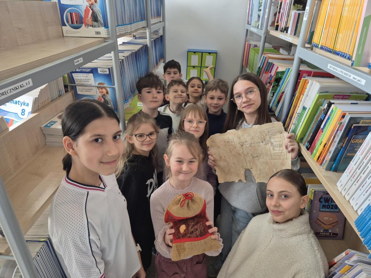 Uczniowie klasy 5b otrzymali również ważne zadanie – przygotowanie zajęć bibliotecznych dla młodszych kolegów z klasy 1a. Starsi uczniowie opracowali mapy prowadzące do ukrytych w bibliotece i czytelni „skarbów”: książki „Wyspa wolności. O króliczkach, które nie słuchały rodziców” Érica-Emmanuela Schmitta (autora powieści „Oskar i pani Róża”), złotych monet oraz gadżetów do wykonania „wyspiarskich” fotografii.