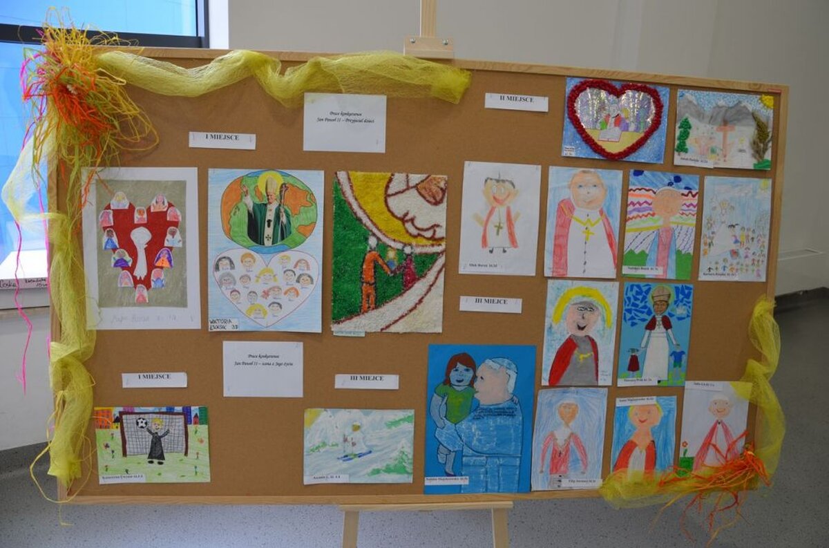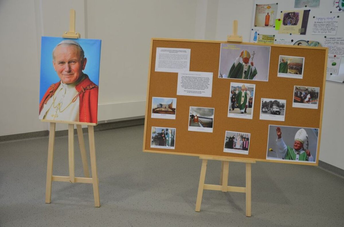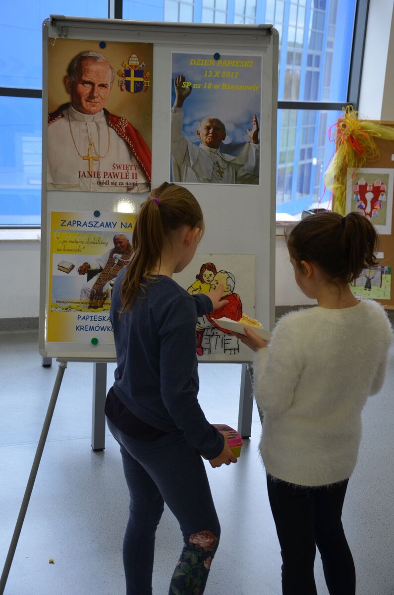 Dnia 13 października 2017 roku w naszej szkole odbył się po raz pierwszy Szkolny Dzień Papieski. Była to kolejna okazja do pochylenia się przez nas nad osobą i nauczeniem św. Jana Pawła II naszego wielkiego Rodaka. Przygotowaniem do tego dnia były liczne konkursy głownie plastyczne pt. Jan Paweł II – Przyjaciel dzieci oraz Jan Paweł II – scena z Jego życia. Do komisji konkursowej wpłynęło 48 prac plastycznych. Zwycięskie plakaty można było zobaczyć w holu naszej szkoły. Wszystkim małym artystom gratulujemy i dziękujemy za prace. Podczas przerw każdy z nas mógł zatrzymać się przy pięknej prezentacji multimedialnej przedstawiającej życie Jana Pawła II oraz przesłanie jakie pozostawił dla młodzieży.