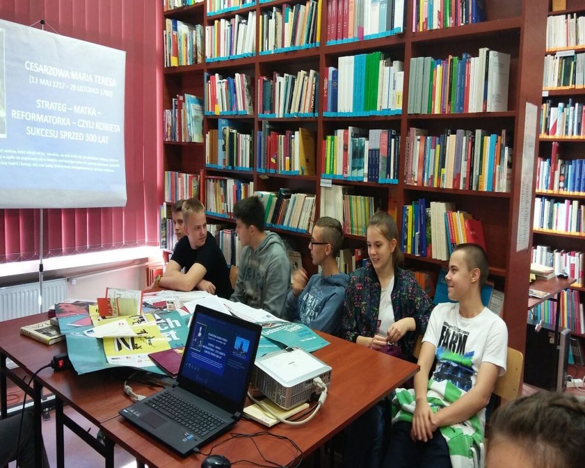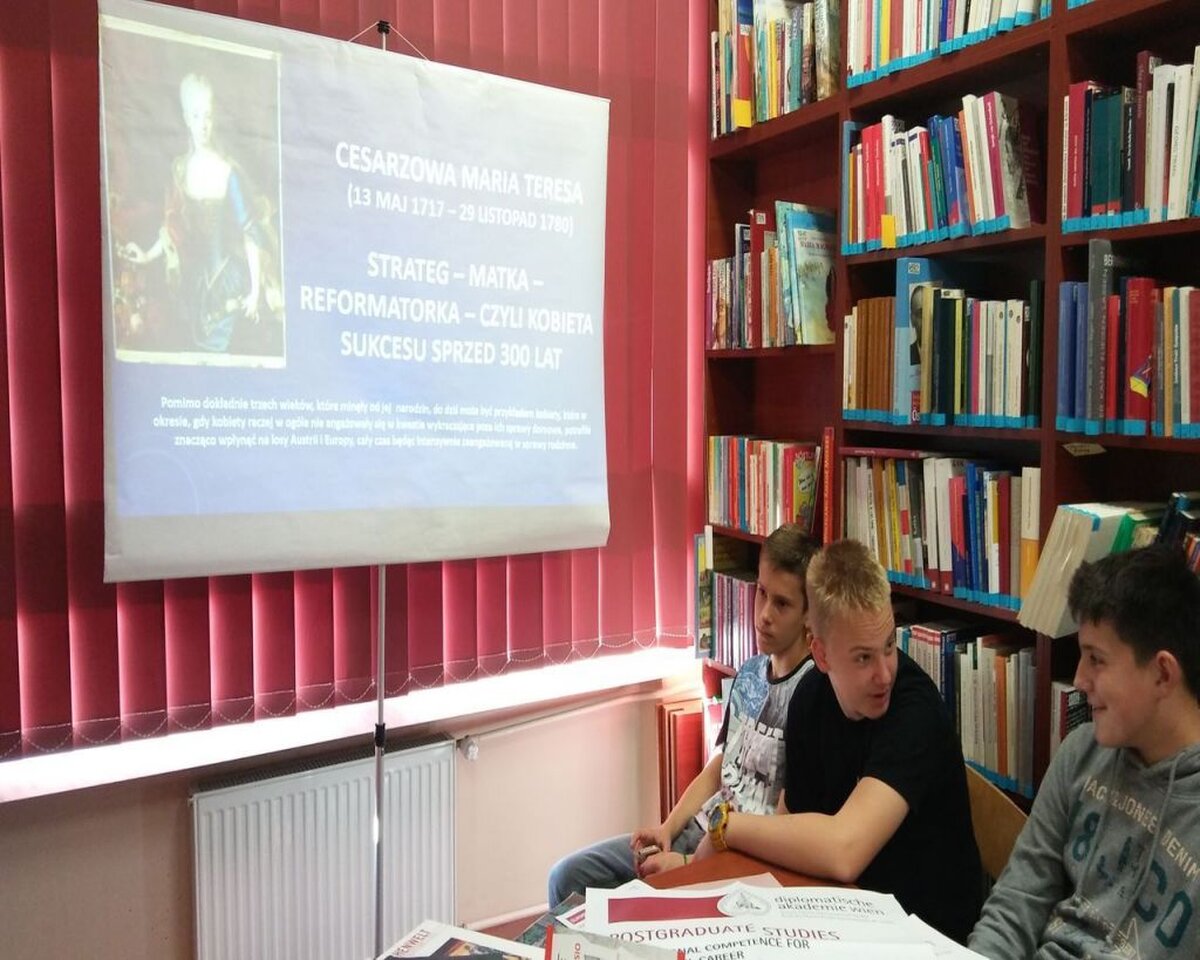 Pani dr Ewa Cwanek - Florek, autorka licznych książek, przeprowadziła specjalnie dla naszych gimnazjalistów warsztaty językowe pt. "Cesarzowa Maria Teresa-strateg-matka-reformatorka-czyli kobieta sukcesu sprzed 300 lat".