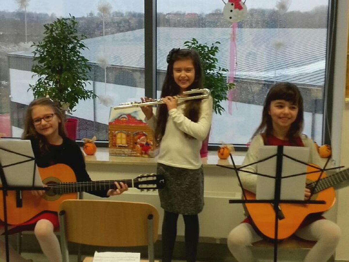 Ostatni tydzień przed Świętami Bożego Narodzenia był w naszej szkole szczególny. Najpierw pojawiły się piękne, zimowe dekoracje. W klasach i na szkolnych korytarzach rozbłysły światełka choinek, na zimowych saniach wjechała Pani Zima. Ale najpiękniej rozkwitła bożonarodzeniowa szopka ze żłóbkiem pośród sianka.