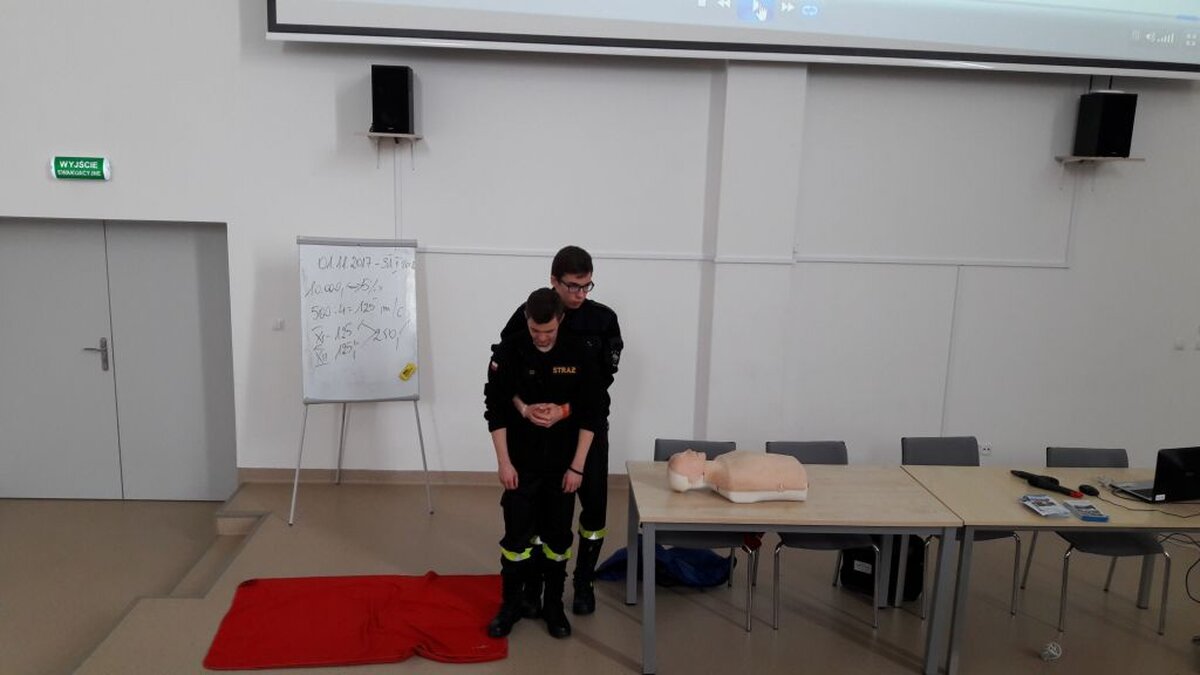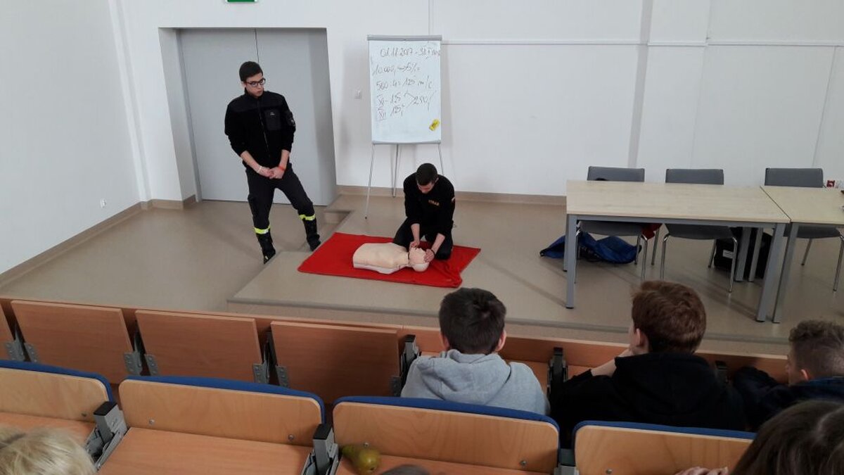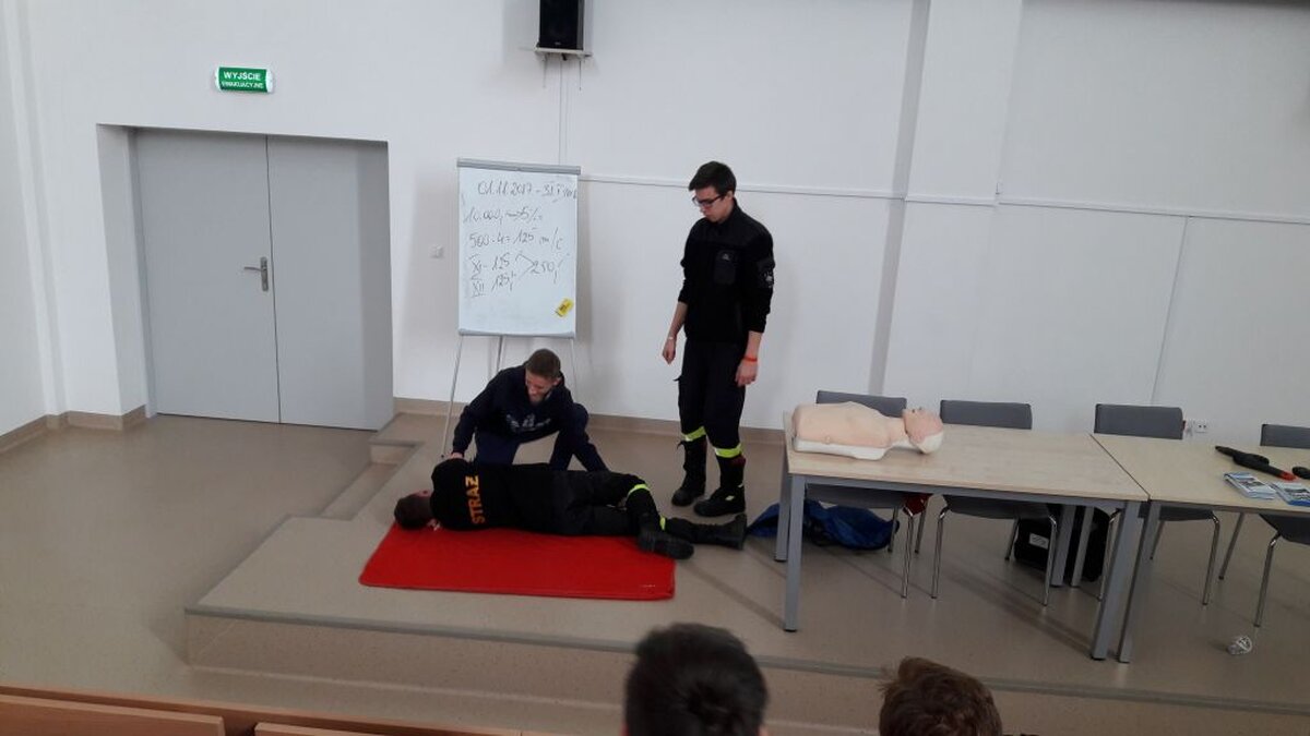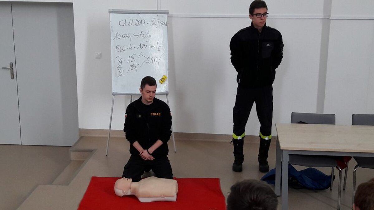 W dniu 26.03.2018 uczniowie klasy 3B gimnazjum uczestniczyli w ciekawej lekcji wychowawczej. Odwiedzili nas uczniowie Zespołu Szkół Techniczno – Weterynaryjnych w Trzcianie. Celem ich wizyty był pokaz pierwszej pomocy. Opowiedzieli oni i zademonstrowali jak należy postępować w różnych przypadkach w których zagrożone jest ludzkie życie. Uczniowie sami mogli ułożyć „poszkodowanego” w pozycji bezpiecznej bocznej czy wykonać zabieg resuscytacji. Nasi gimnazjaliści zapoznali się także z ofertą edukacyjną Zespołu Szkół Techniczno – Weterynaryjnych w Trzcianie. Kto wie, może wśród naszych uczniów są przyszli strażacy czy weterynarze?