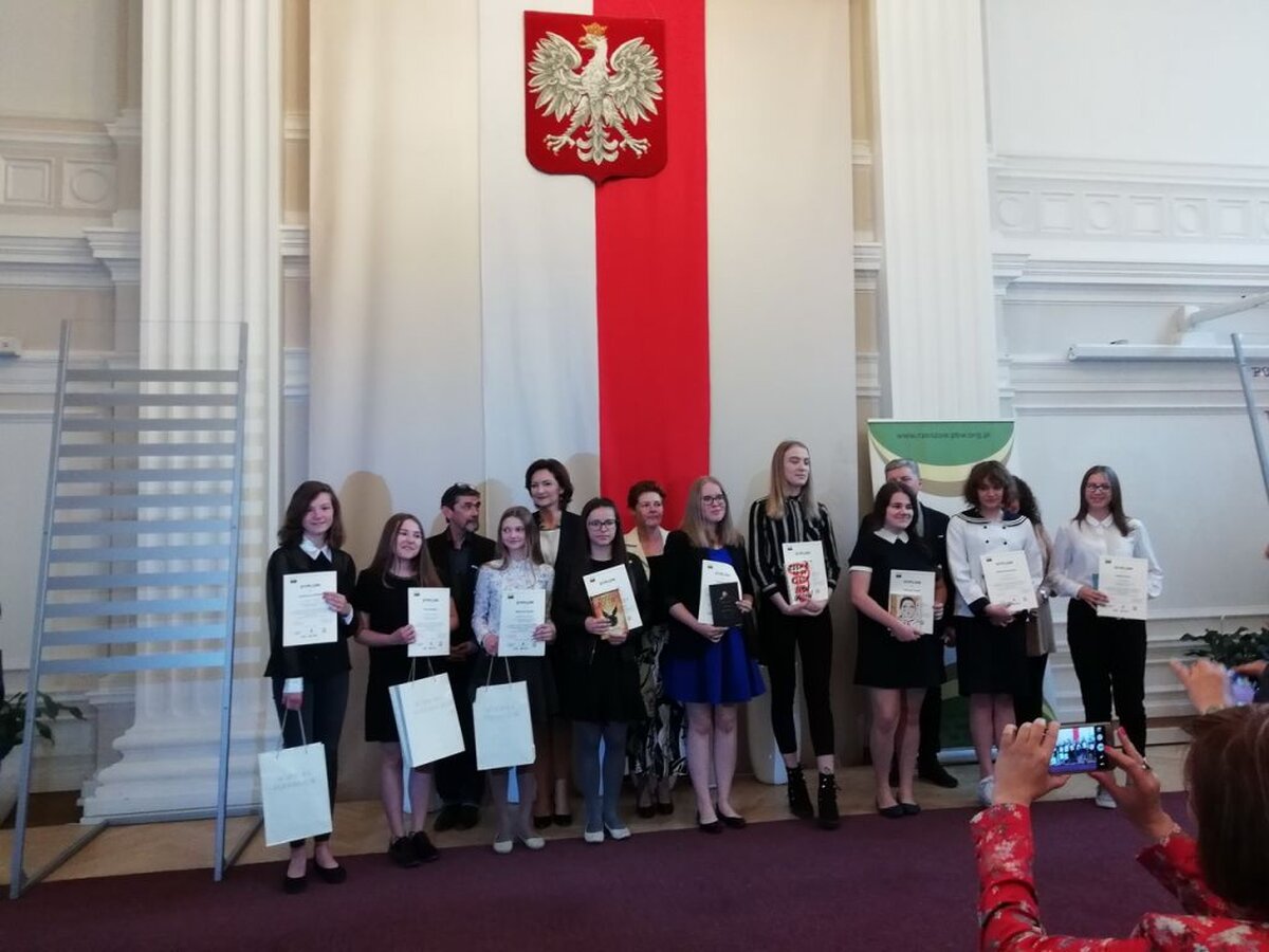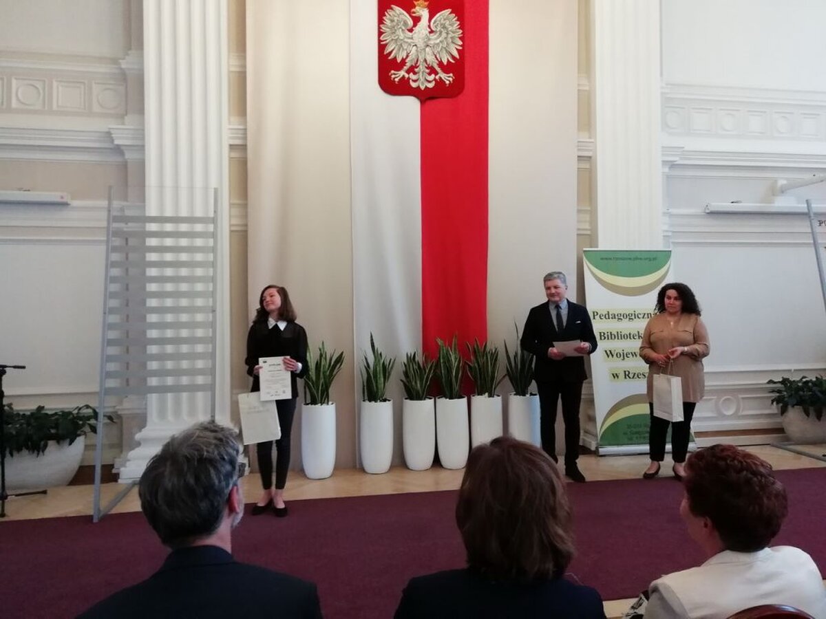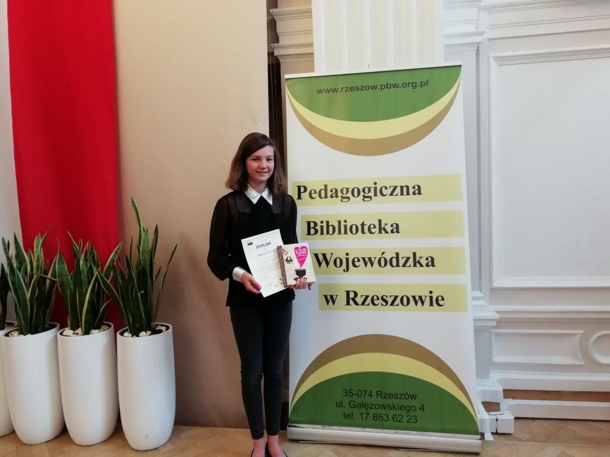 W dniu 26.04.2018r., w Sali Kolumnowej Urzędu Wojewódzkiego odbyła się uroczysta gala wręczenia nagród Laureatom i Wyróżnionym w tegorocznej edycji konkursu. W tym zacnym gronie znalazła się Kasia Bielak /opiekun dydaktyczny Anna Mikrut/, uczennica klasy II DG, która zajęła I miejsce i z dumą reprezentowała naszą szkołę. A było to niemałe przeżycie ponieważ mistrzowie słowa odebrali nagrody z rąk Pani Ewy Leniart-Wojewody Podkarpackiej, Pani Lucyny Brymory-Dyrektor Pedagogicznej Biblioteki Wojewódzkiej w Rzeszowie, Pana Bogusława Śnieżka-Kierownika w Departamencie Edukacji, Nauki i Sportu w Podkarpackim Urzędzie Marszałkowskim, Pana Stanisława Fundakowskiego-zastępcy Podkarpackiego Kuratora Oświaty, Pana Jana Niemaszka-dziennikarza, aktora i reżysera w Polskim Radiu Rzeszów oraz nauczycielek bibliotekarek PBW W Rzeszowie.