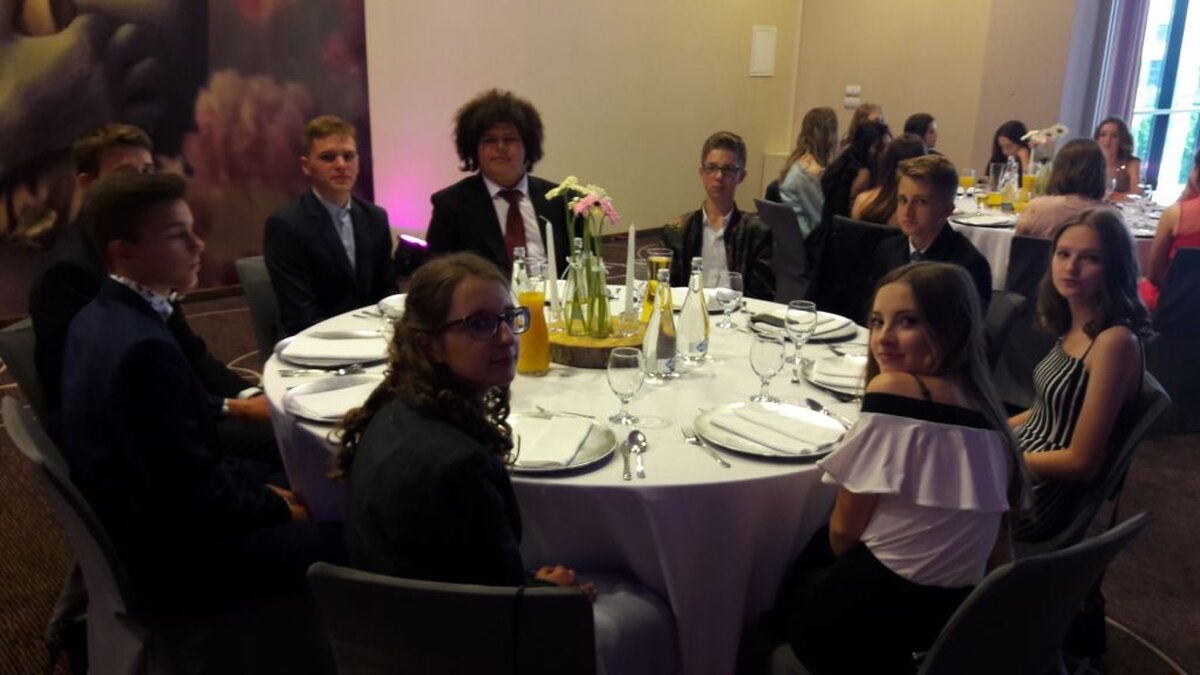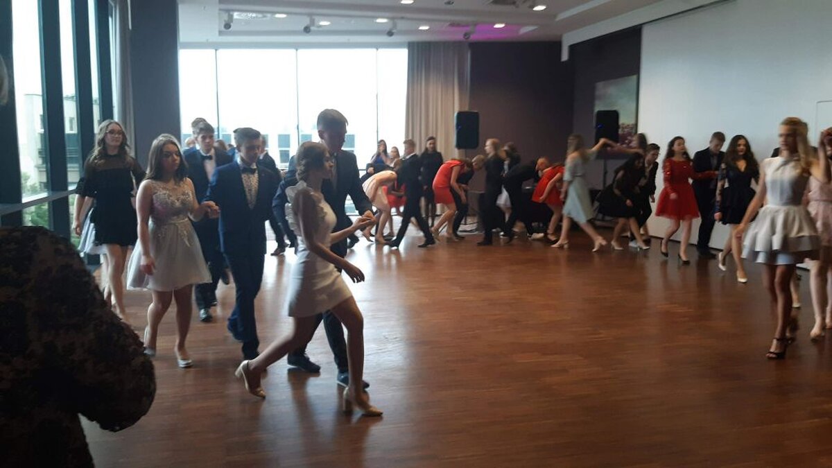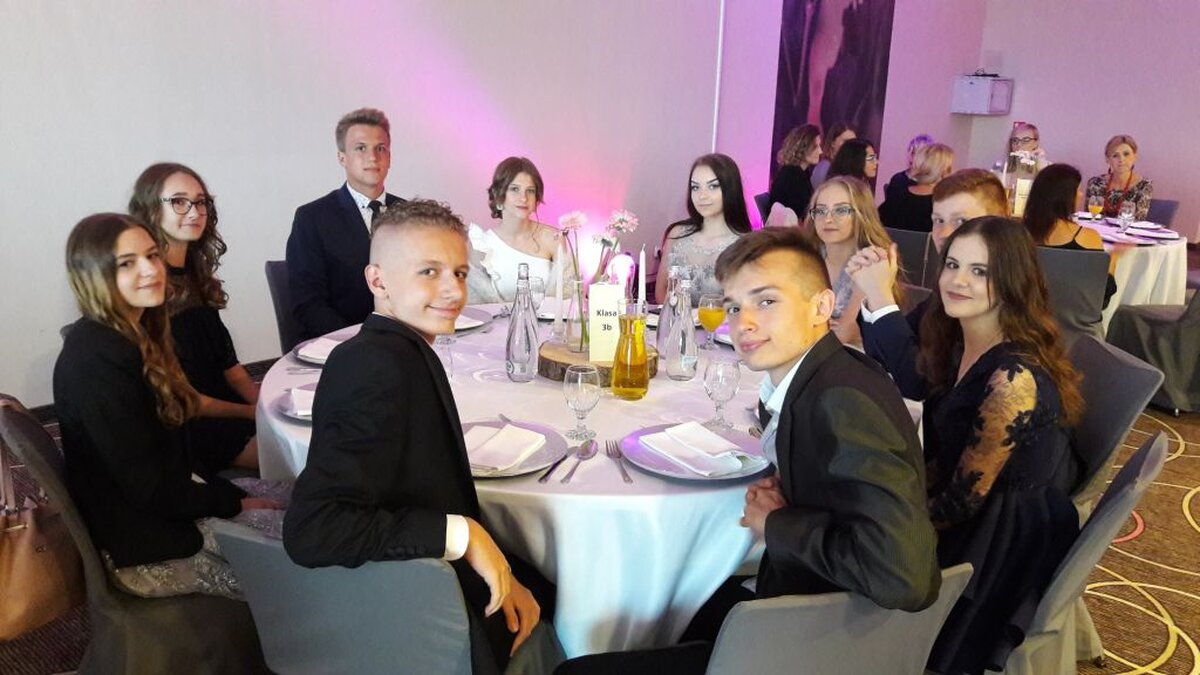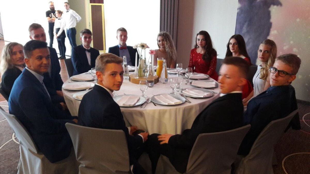 Uroczystość rozpoczęła się polonezem, który uczniowie zatańczyli przed Dyrekcją, swoimi wychowawcami, nauczycielami i rodzicami. Za ten piękny taniec otrzymali od nich gromkie brawa. Potem nastąpił uroczysty obiad, a następnie rozpoczęła się szampańska zabawa. Były muzyczne dedykacje dla wychowawców i grona pedagogicznego oraz wspólne fotografie. Wszystkim dopisywały humory i tylko czasem w oku zakręciła się łezka na myśl, że to ostatnia taka zabawa w tym gronie.