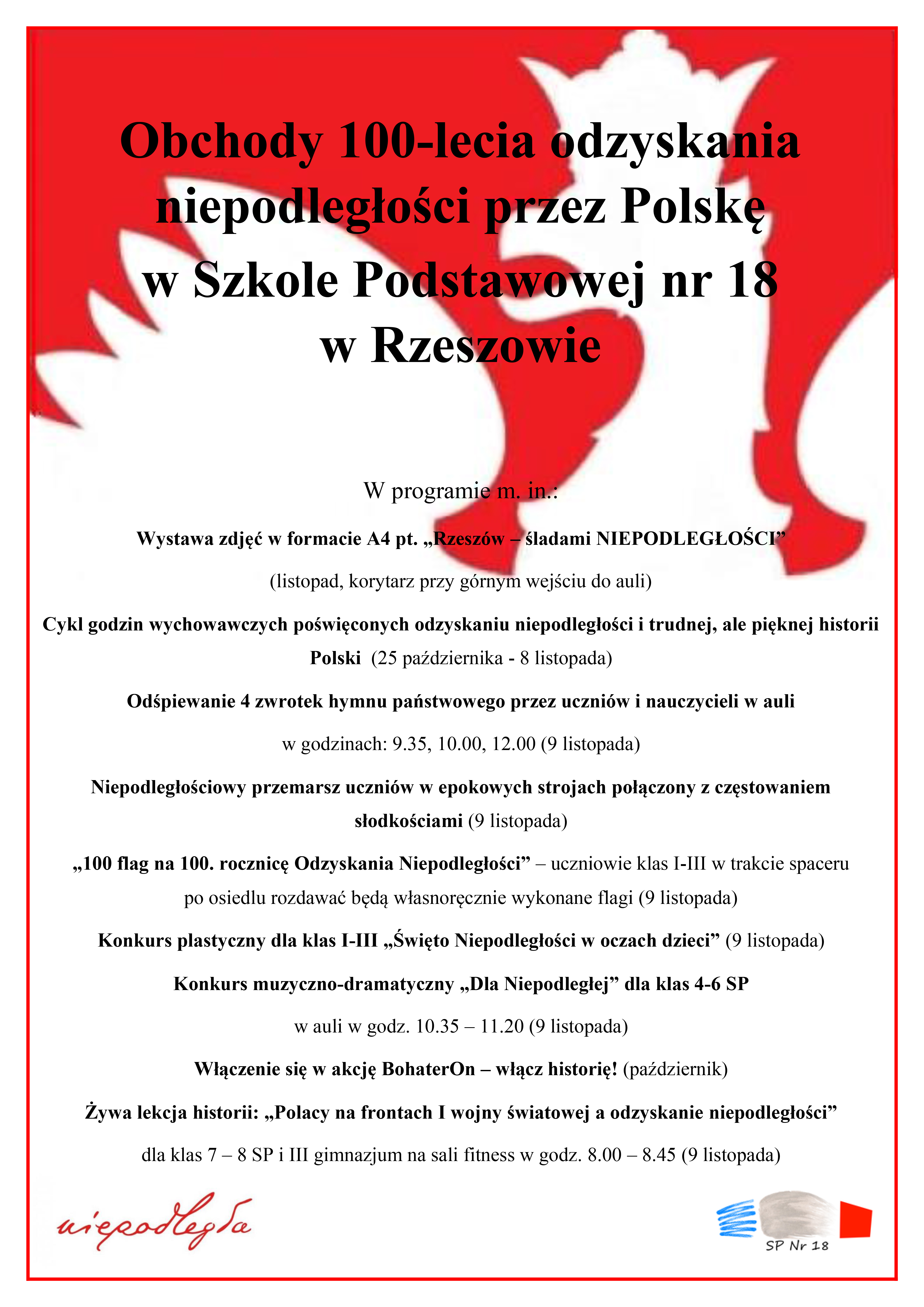 Do tego wyjątkowego święta – Setnej Rocznicy Odzyskania Niepodległości, przygotowujemy się w naszej szkole od dawna. Z tej okazji zorganizowaliśmy wiele wydarzeń – niektóre z nich, jak zbiorowe wyjście do kina na film pt. „Dywizjon 303. Historia prawdziwa”, czy udział w koncercie muzyki filmowej i patriotycznej w Filharmonii Podkarpackiej, miały już miejsce, inne dopiero się zaczęły, a jeszcze inne odbędą się w przededniu Święta Niepodległości – a dokładnie 9 listopada.