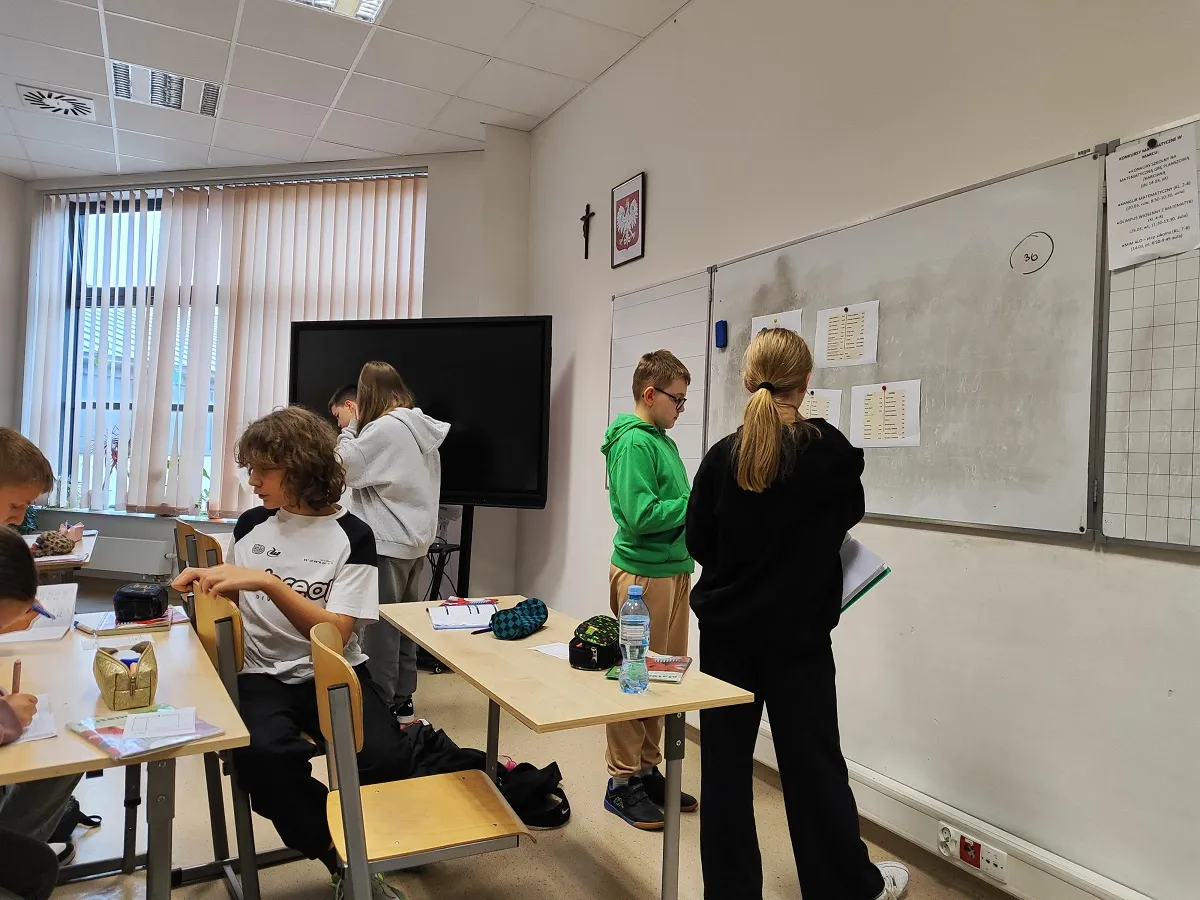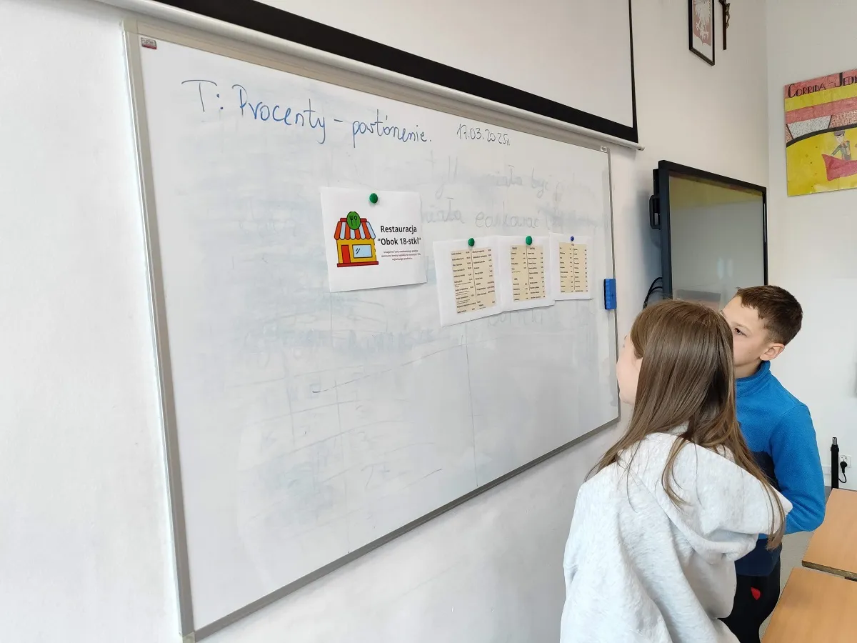 Uczniowie klas 6d, 6e oraz 6f podczas lekcji powtórzeniowej z działu Procenty wybrali się do matematycznego Centrum Handlowego Sala 41, w którym robili zakupy w sklepie odzieżowym „For young”, sklepie papierniczym „Biurex”, pralni „Czyścioch”, kinie „Gwiazda” oraz restauracji „Obok 18-stki”. Ceny produktów oraz usług obliczali zgodnie z podanymi informacjami uwzględniając np. promocje i napiwki. Kwoty wydane w poszczególnych miejscach umieszczali na paragonach na końcu podsumowując swoje zakupy i sprawdzając, czy zmieszczą się w określonym limicie 300 zł oraz czy dokonali zakupów w każdym sklepie.
