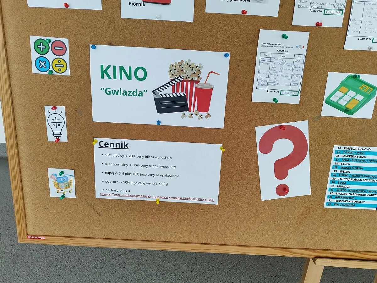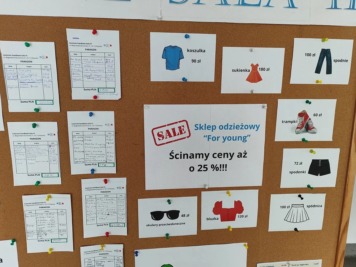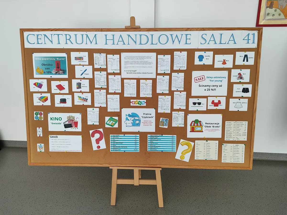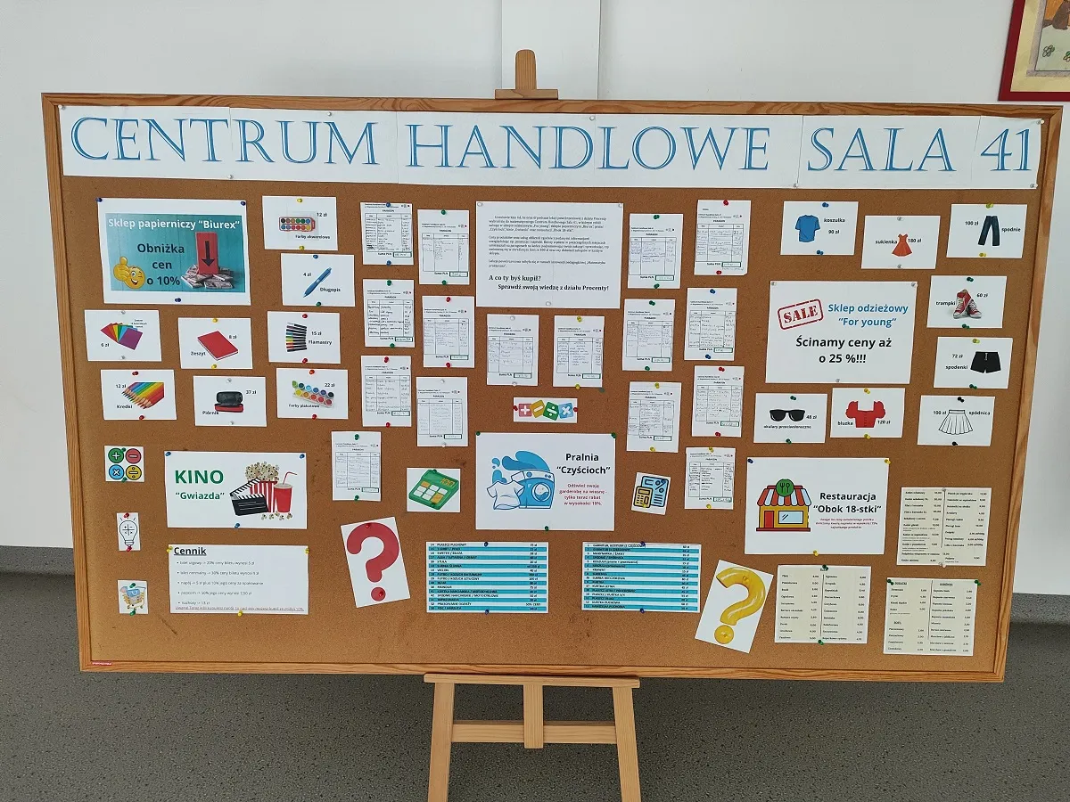 Efekty pracy uczniów w postaci wypełnionych paragonów zostały zaprezentowane w holu głównym szkoły wraz z ofertą Centrum Handlowego Sala 41, gdzie można sprawdzić swoją wiedzę z działu Procentu.