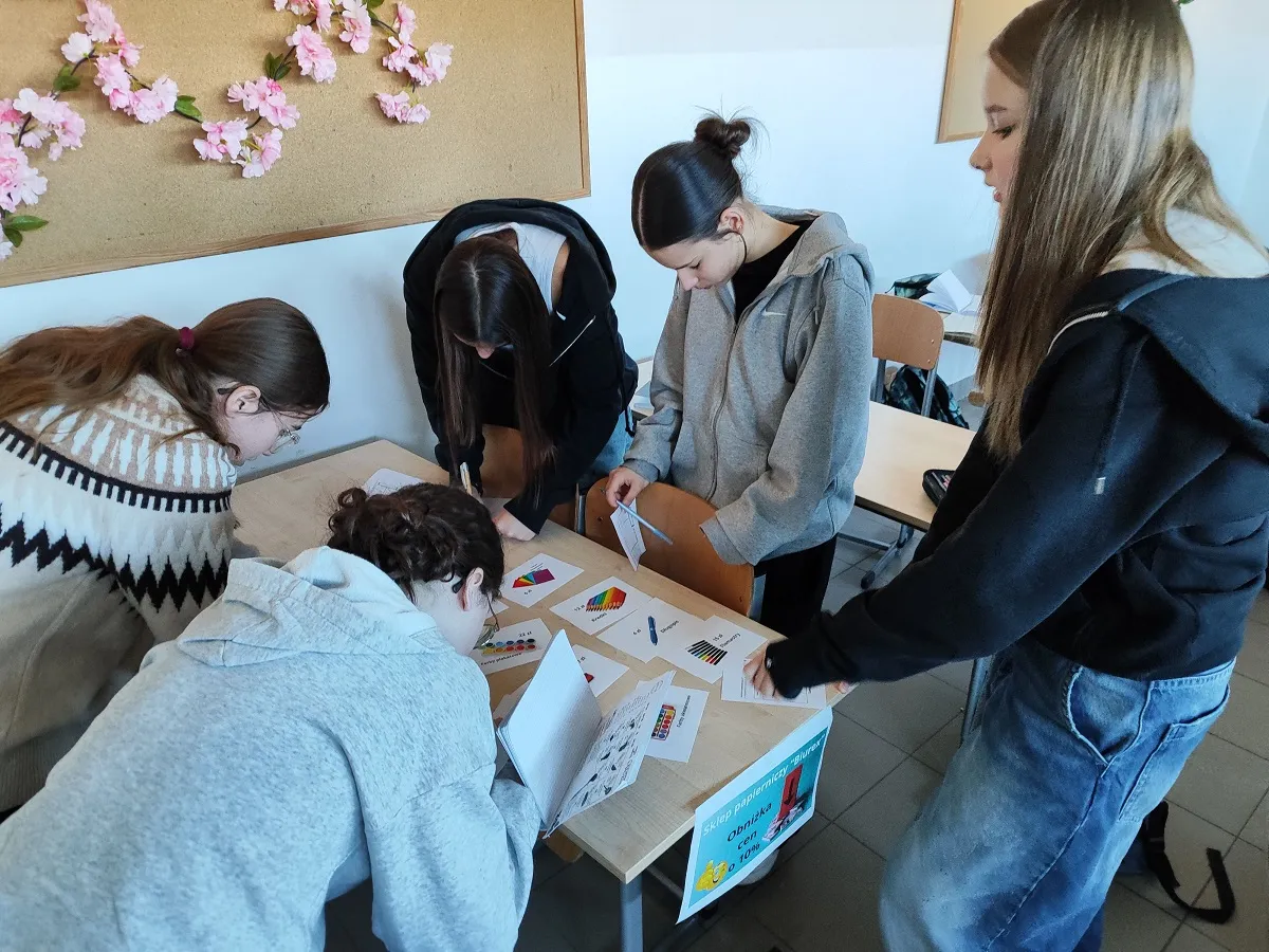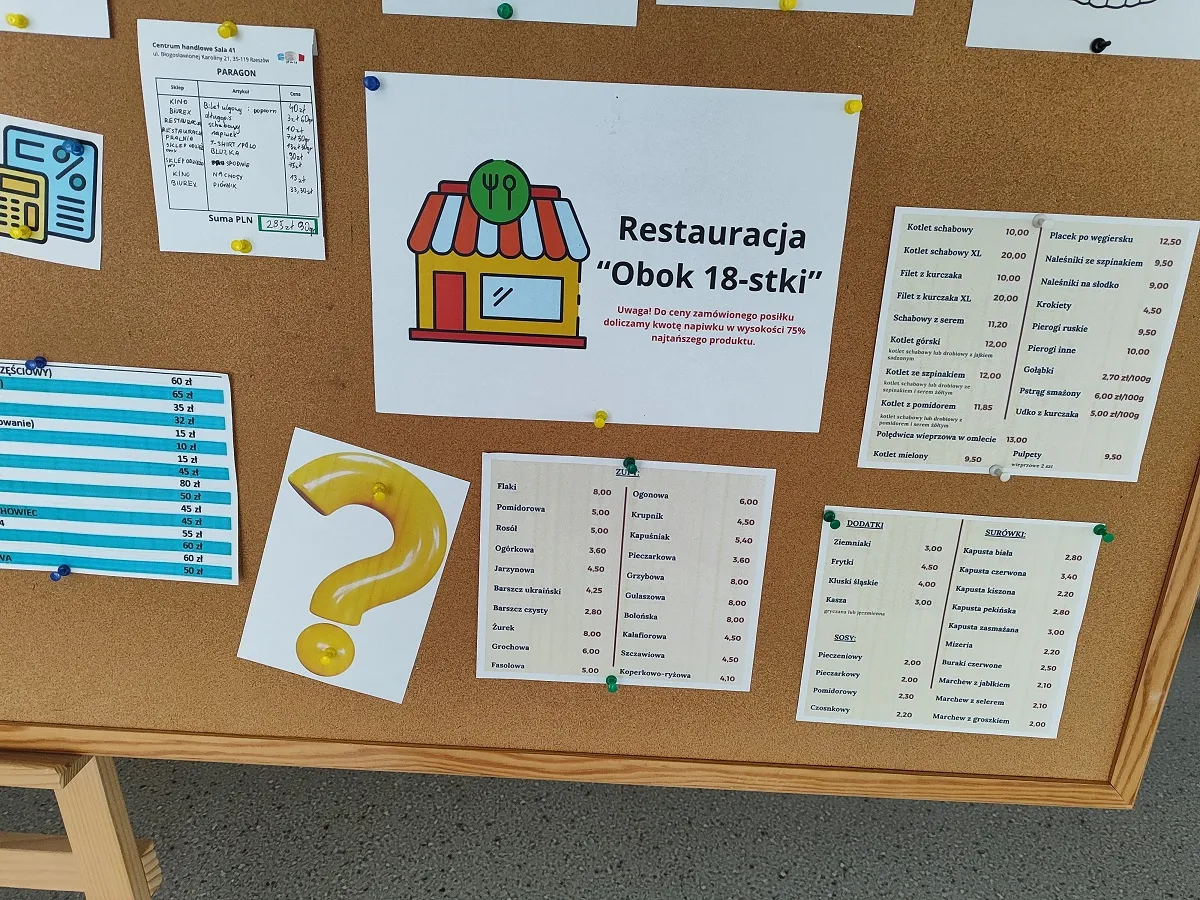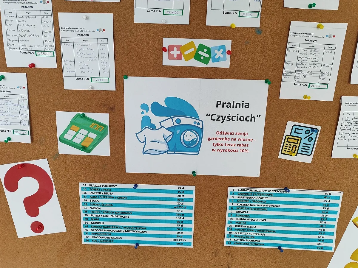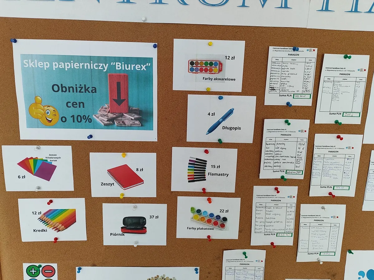 Efekty pracy uczniów w postaci wypełnionych paragonów zostały zaprezentowane w holu głównym szkoły wraz z ofertą Centrum Handlowego Sala 41, gdzie można sprawdzić swoją wiedzę z działu Procentu.