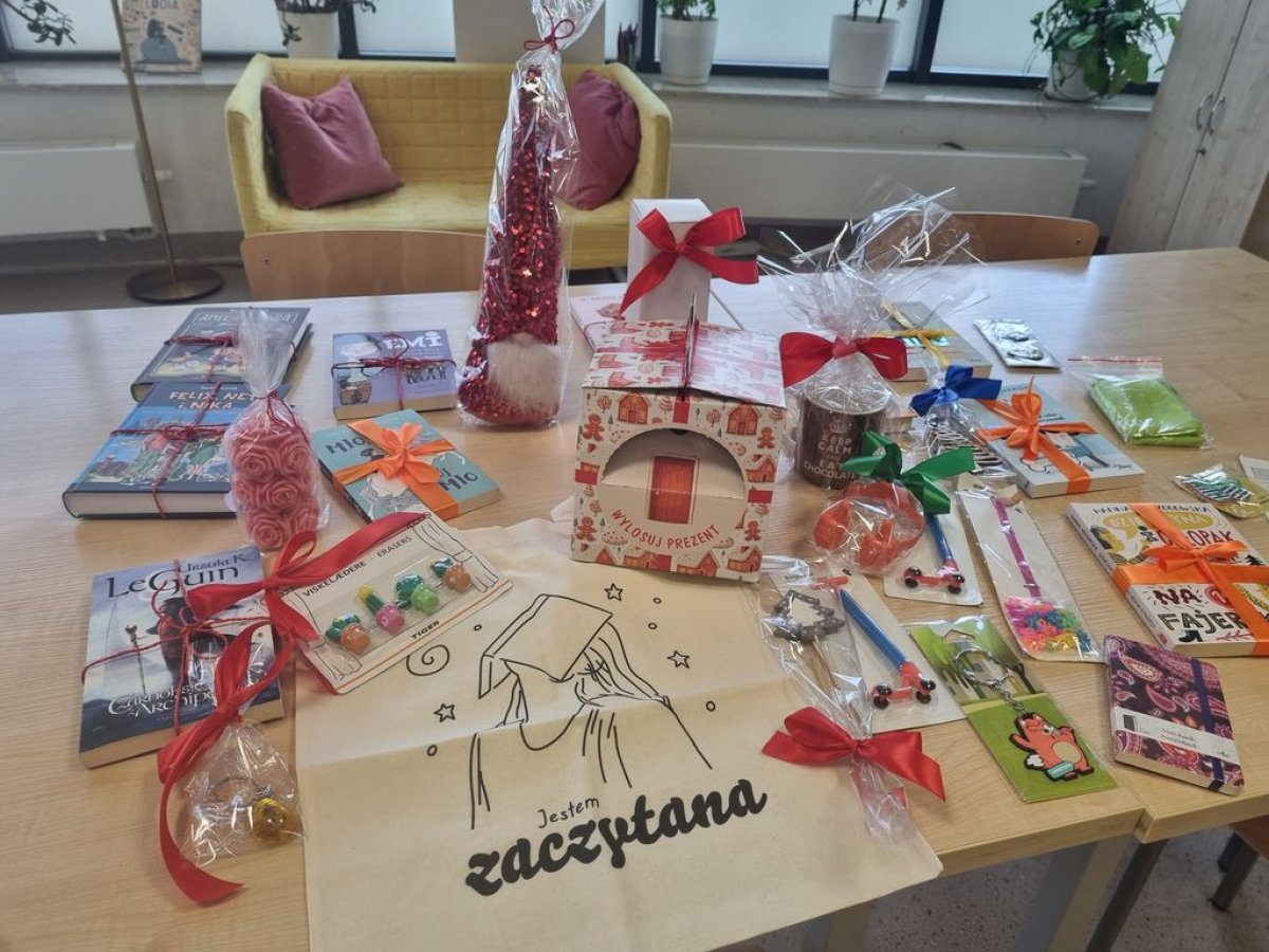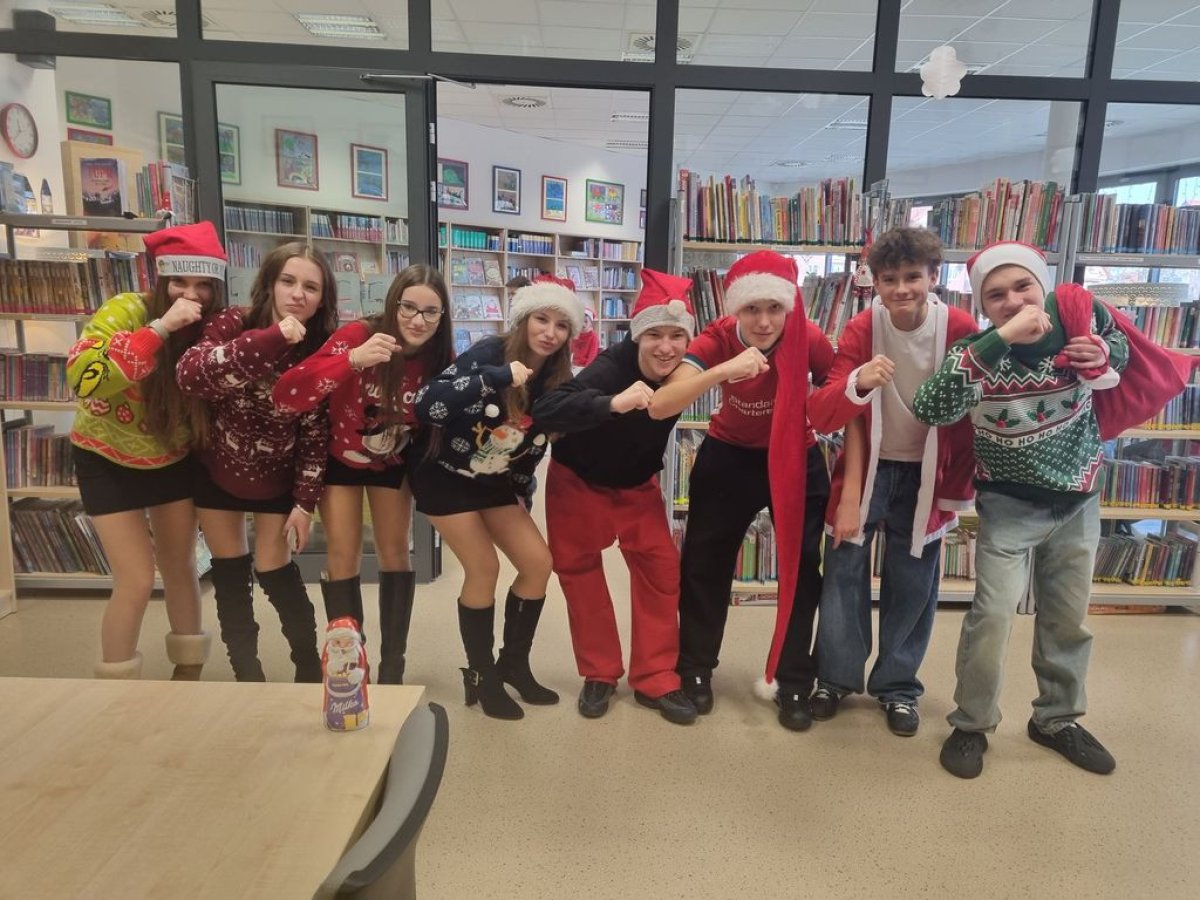 Była też „Loteria św. Mikołaja” dla uczniów biorących udział w „Wyzwaniu czytelniczym”, a w ofercie do wypożyczenia znalazło się wiele książek o tematyce świątecznej.