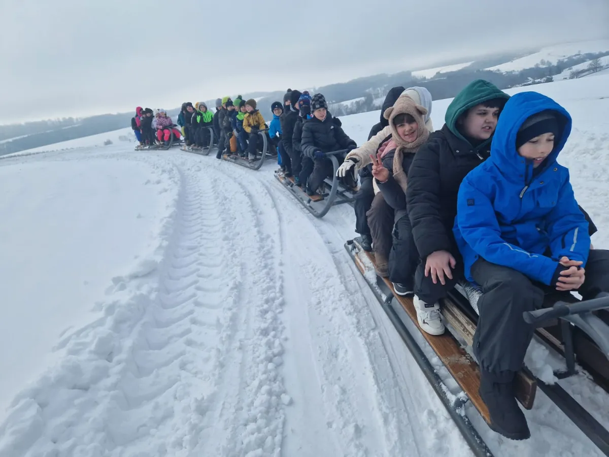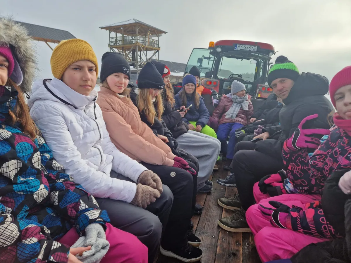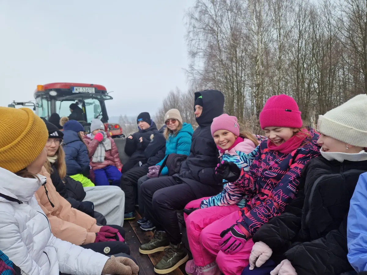 Po przyjeździe rozpoczęliśmy zabawę od zjazdów na torze pontonowym, które dostarczyły wszystkim mnóstwo radości i emocji. Następnie uczniowie przejechali piękną, zimową trasę kuligiem, podziwiając malownicze widoki.