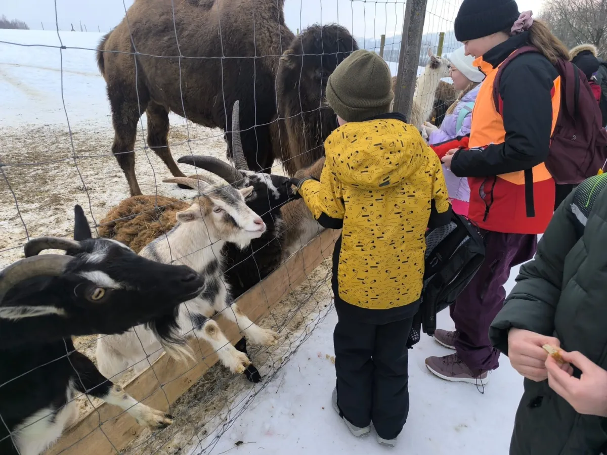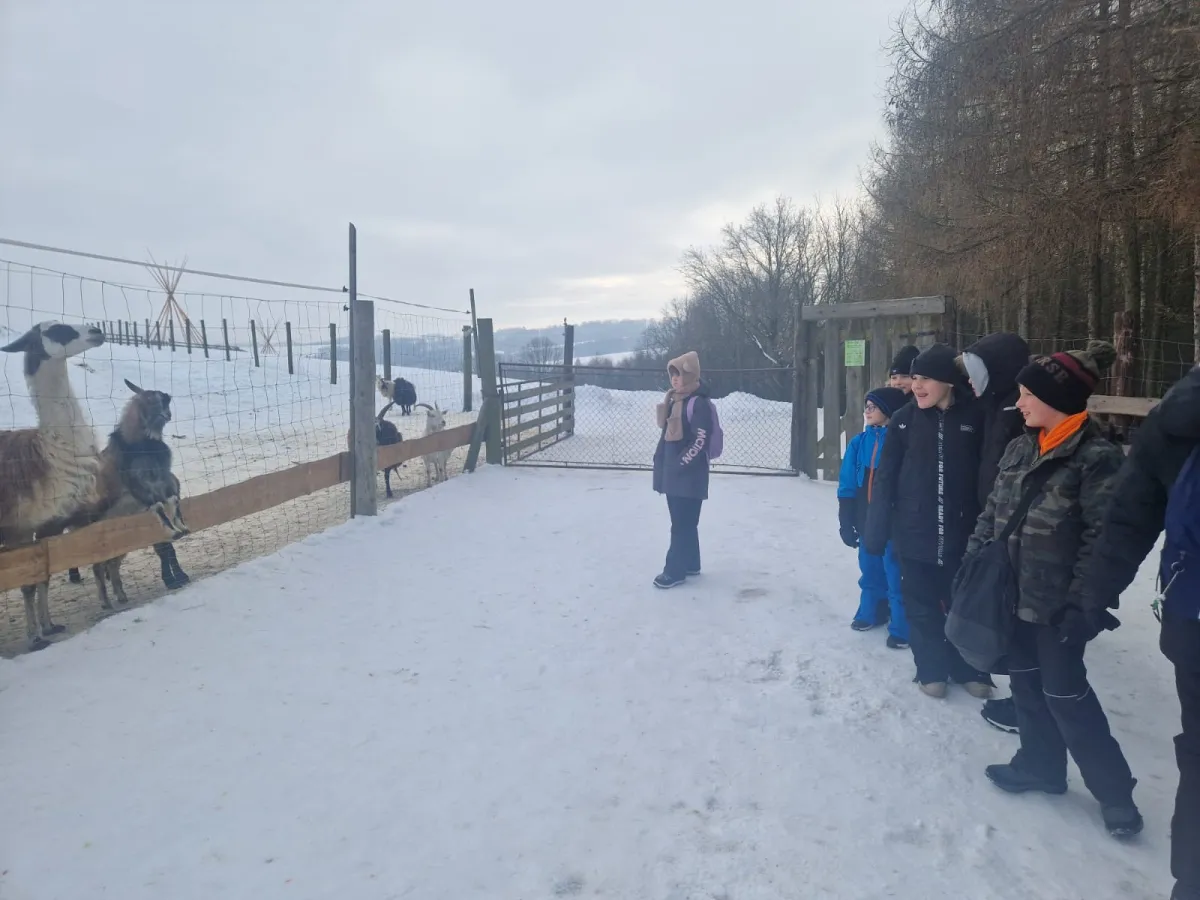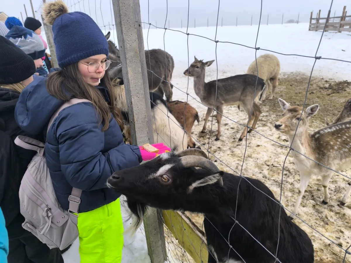 Po tych atrakcjach przyszedł czas na posiłek – pyszną kiełbaskę z grilla oraz ciepłą herbatkę, które idealnie rozgrzały w zimowej aurze. Na zakończenie wyjazdu uczniowie mieli okazję nakarmić i pogłaskać zwierzątka w mini zoo, m.in. kozy oraz wielbłąda.