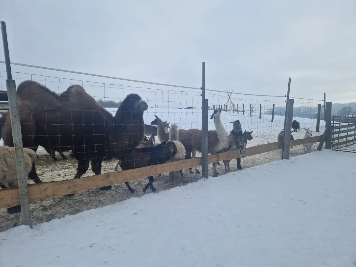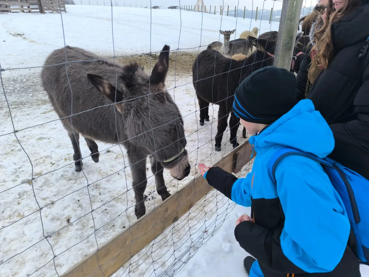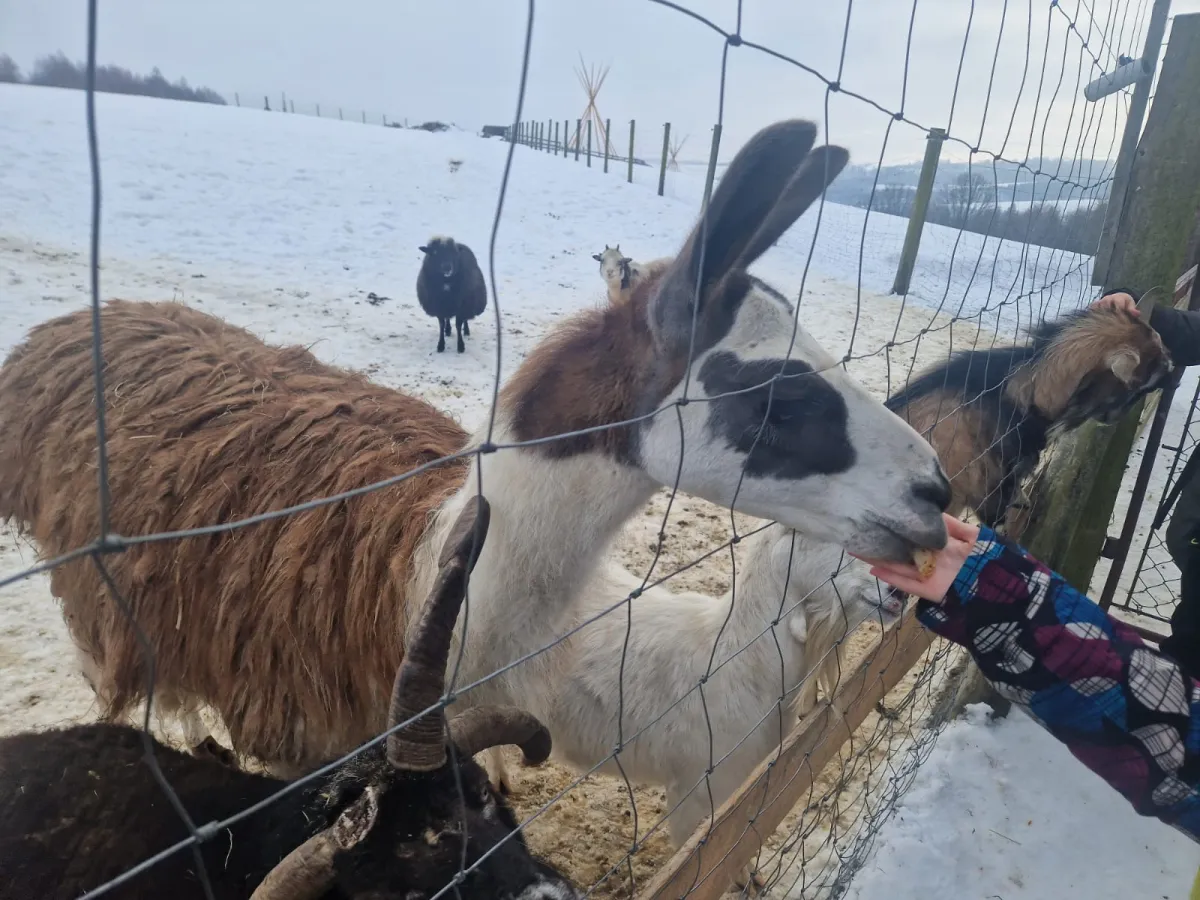Po tych atrakcjach przyszedł czas na posiłek – pyszną kiełbaskę z grilla oraz ciepłą herbatkę, które idealnie rozgrzały w zimowej aurze. Na zakończenie wyjazdu uczniowie mieli okazję nakarmić i pogłaskać zwierzątka w mini zoo, m.in. kozy oraz wielbłąda.