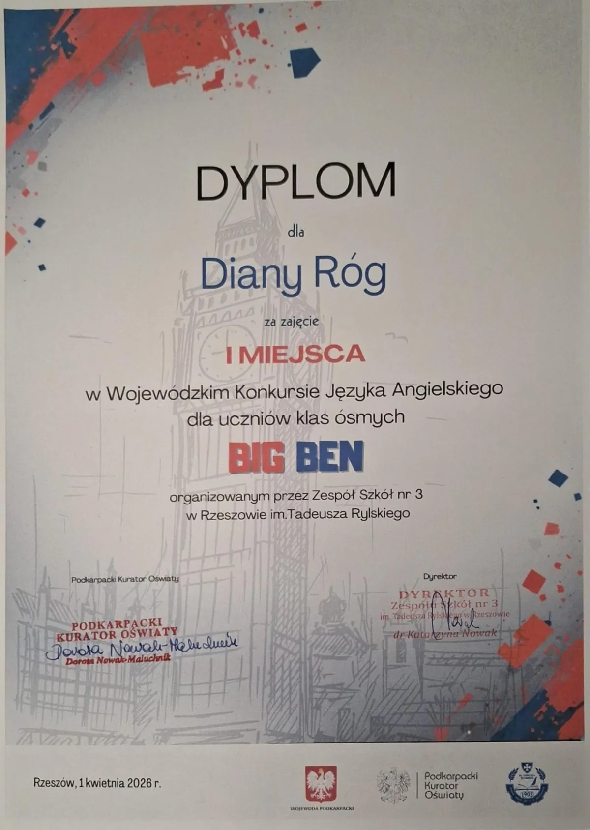 Miło nam poinformować, że uczennica naszej szkoły, Diana Róg – uczennica klasy 8a – zdobyła I miejsce w Wojewódzkim Konkursie języka angielskiego dla uczniów klas ósmych BIG BEN.