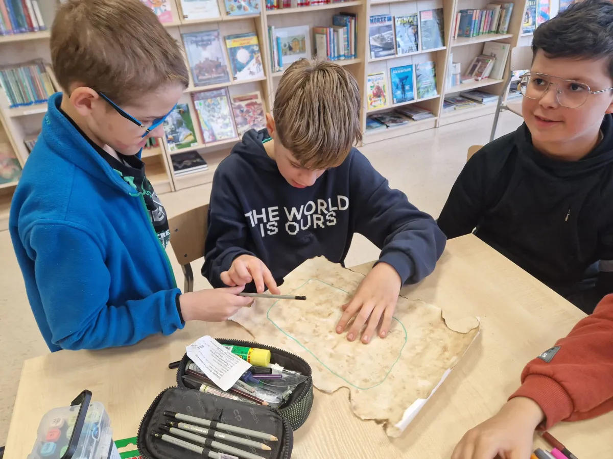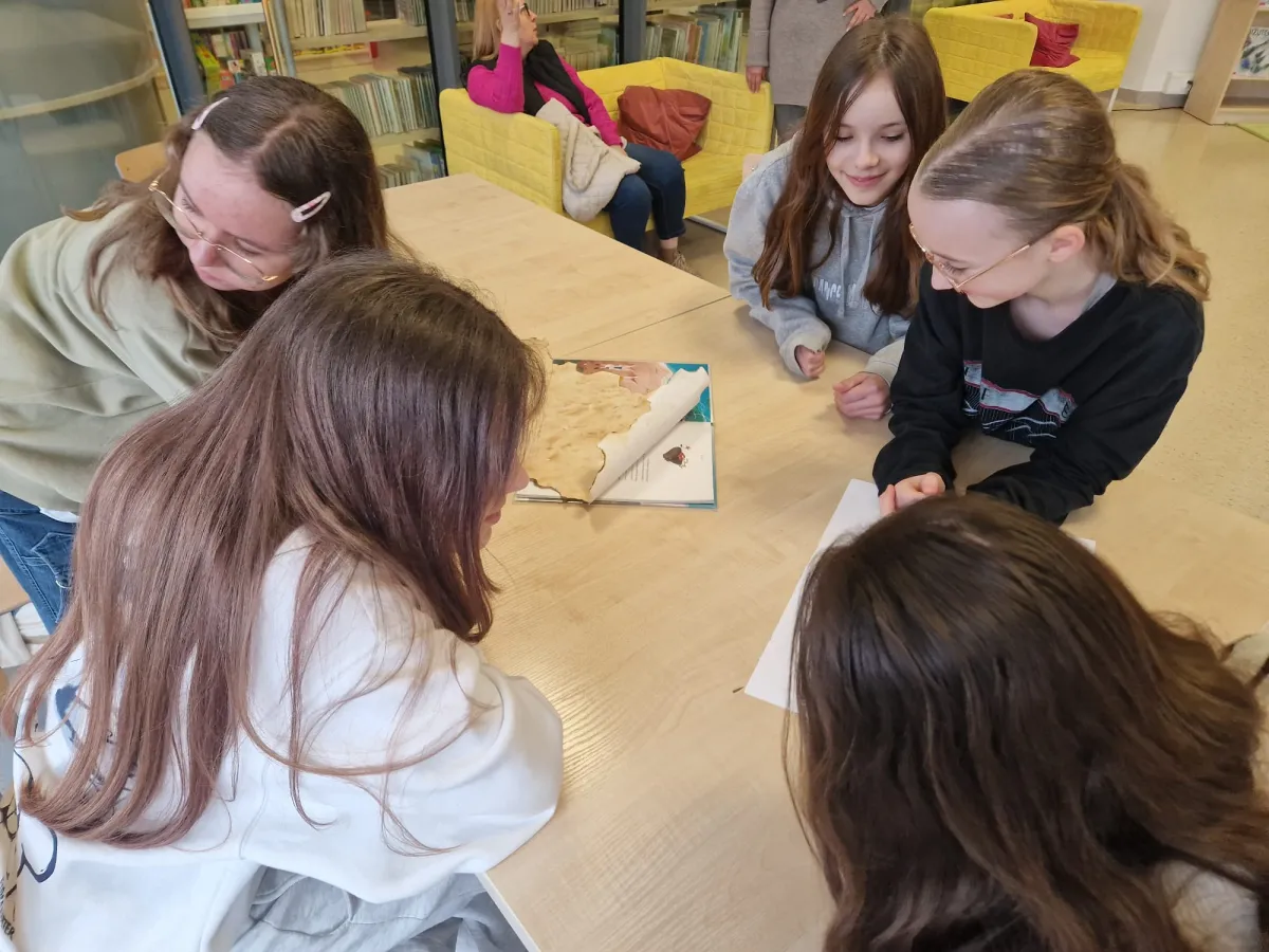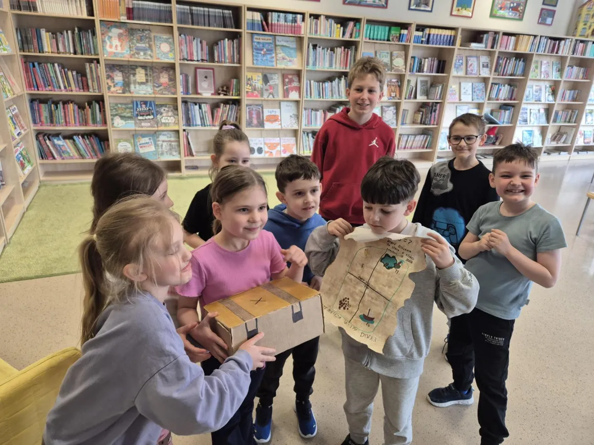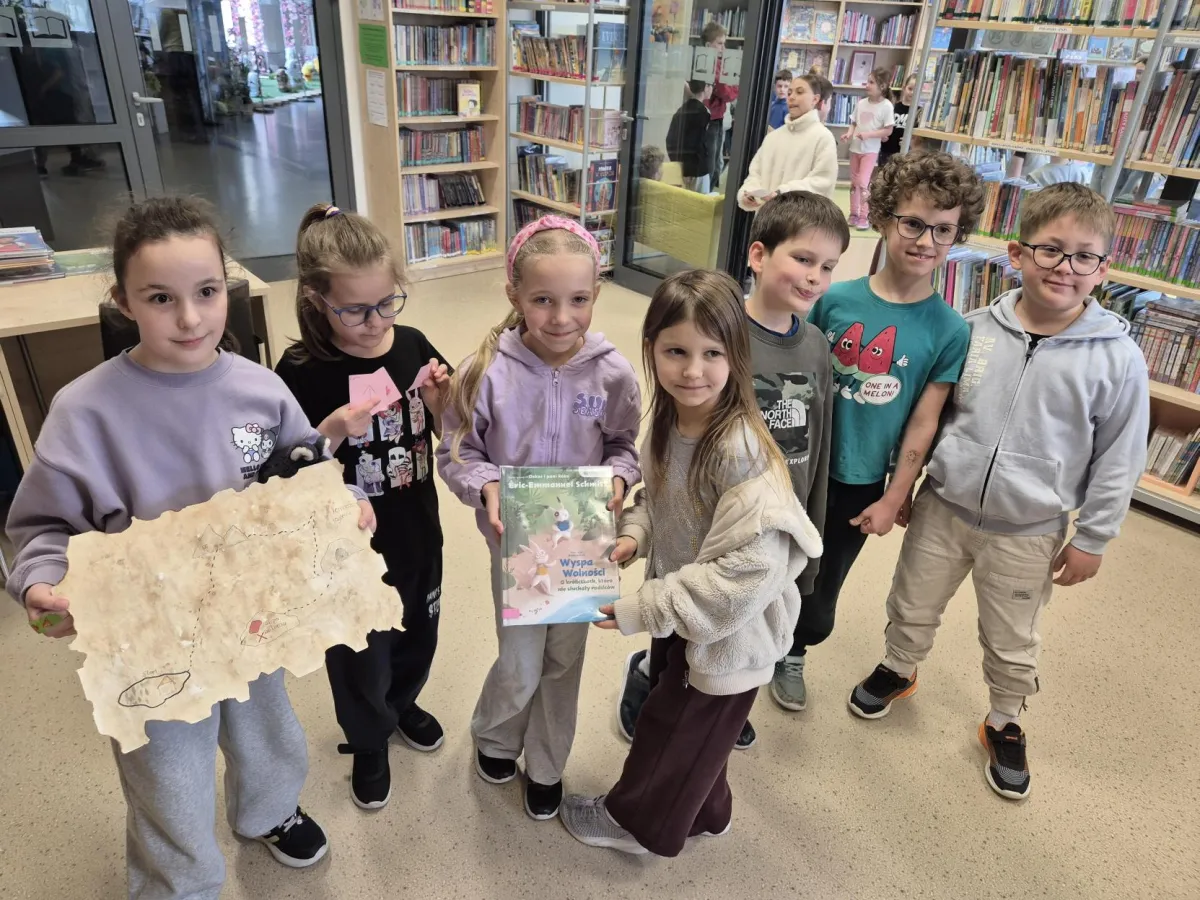 Uczniowie klasy 5b otrzymali również ważne zadanie – przygotowanie zajęć bibliotecznych dla młodszych kolegów z klasy 1a. Starsi uczniowie opracowali mapy prowadzące do ukrytych w bibliotece i czytelni „skarbów”: książki „Wyspa wolności. O króliczkach, które nie słuchały rodziców” Érica-Emmanuela Schmitta (autora powieści „Oskar i pani Róża”), złotych monet oraz gadżetów do wykonania „wyspiarskich” fotografii.