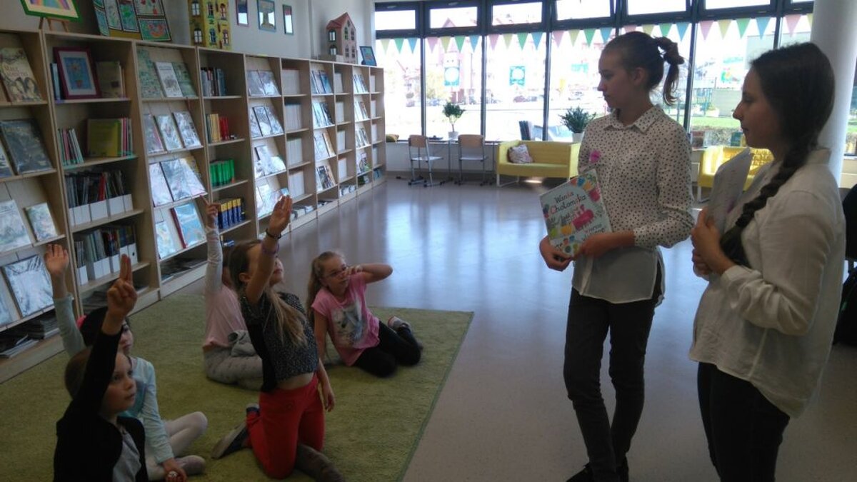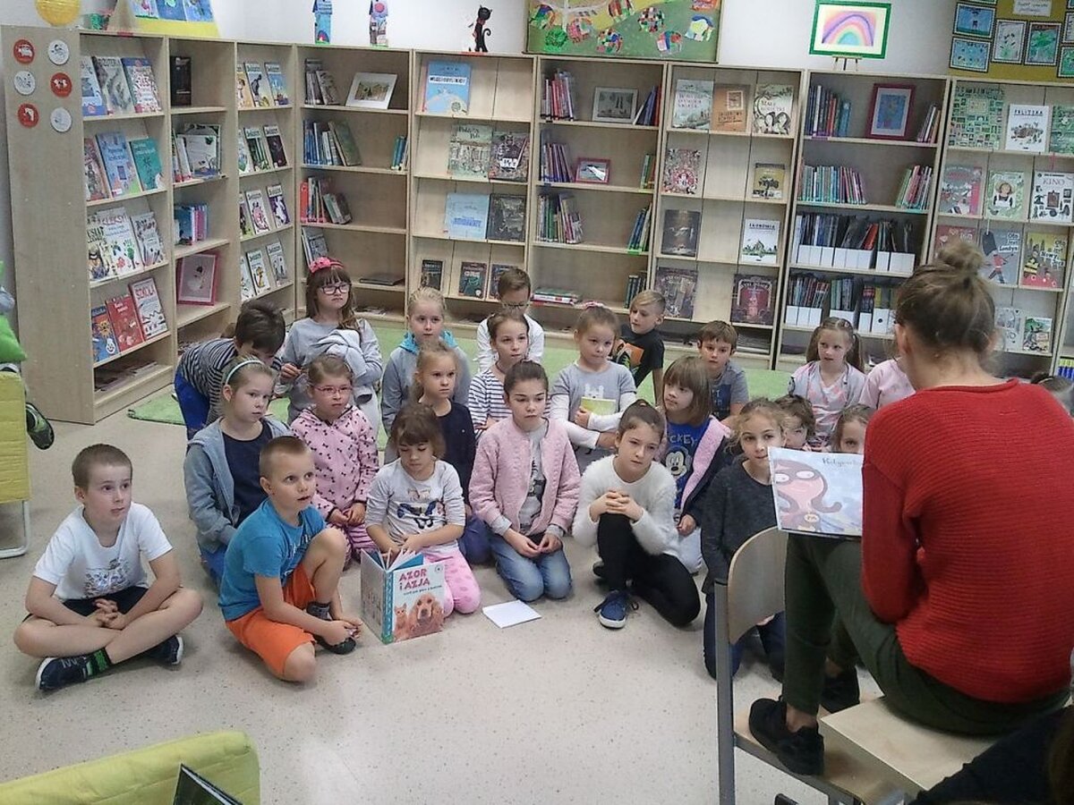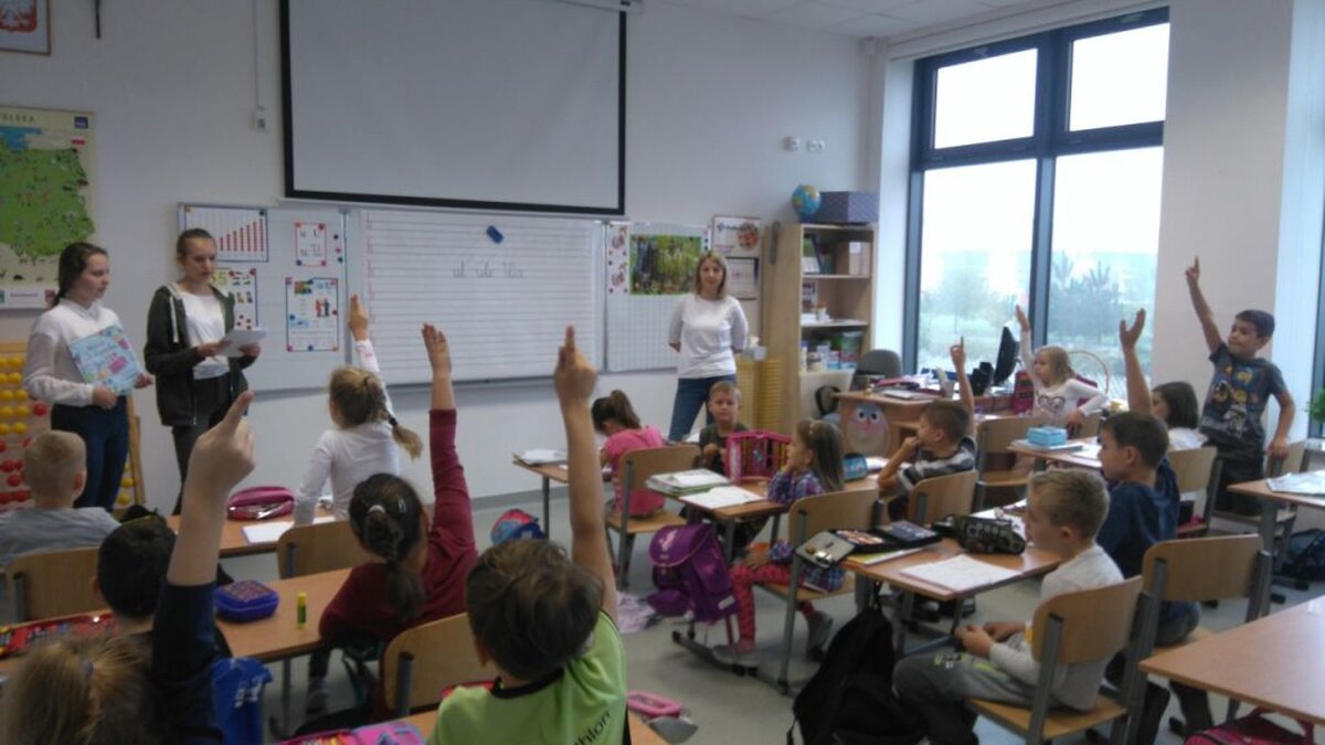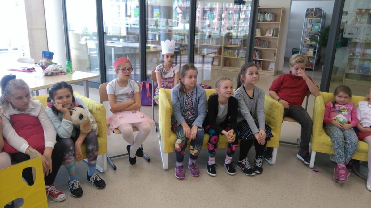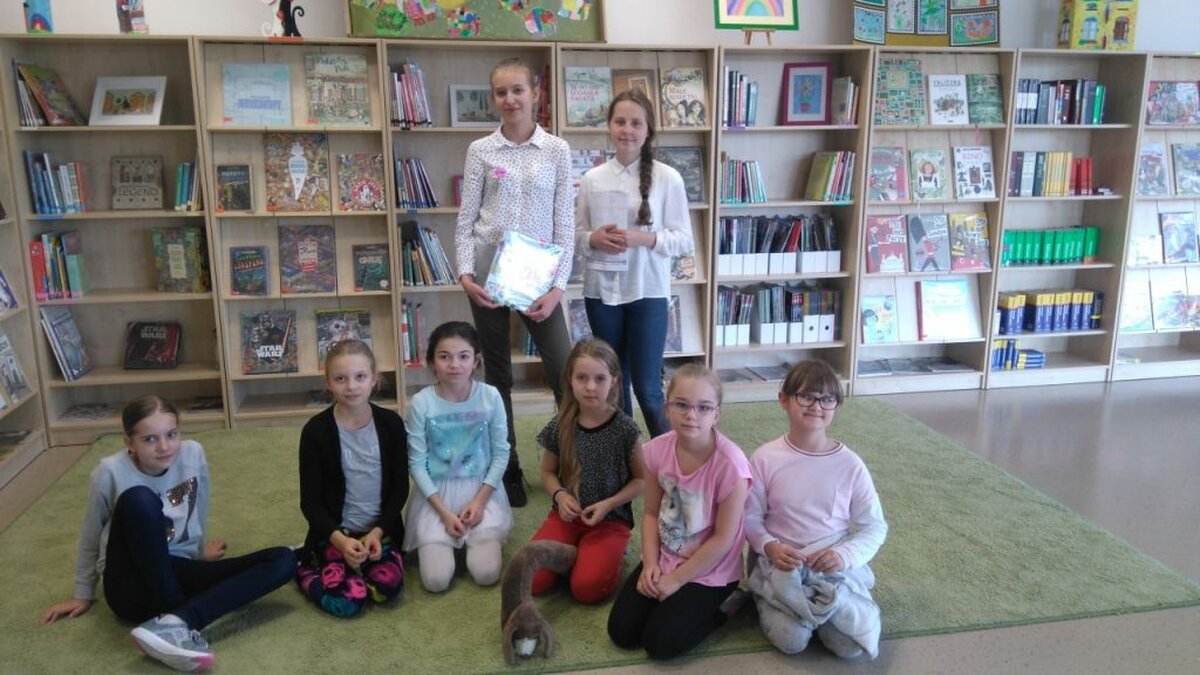 Dopełnieniem były quizy o wierszach W. Chotomskiej prowadzone przez gimnazjalistki z kl.2DG: Klaudię Luderę i Laurę Liptak; na przerwach w czytelni oraz w klasach 1-4 w czasie lekcji. Dzieciaki z dużym zaangażowaniem brały udział w zagadkowych potyczkach za co w nagrodę otrzymały słodkości.