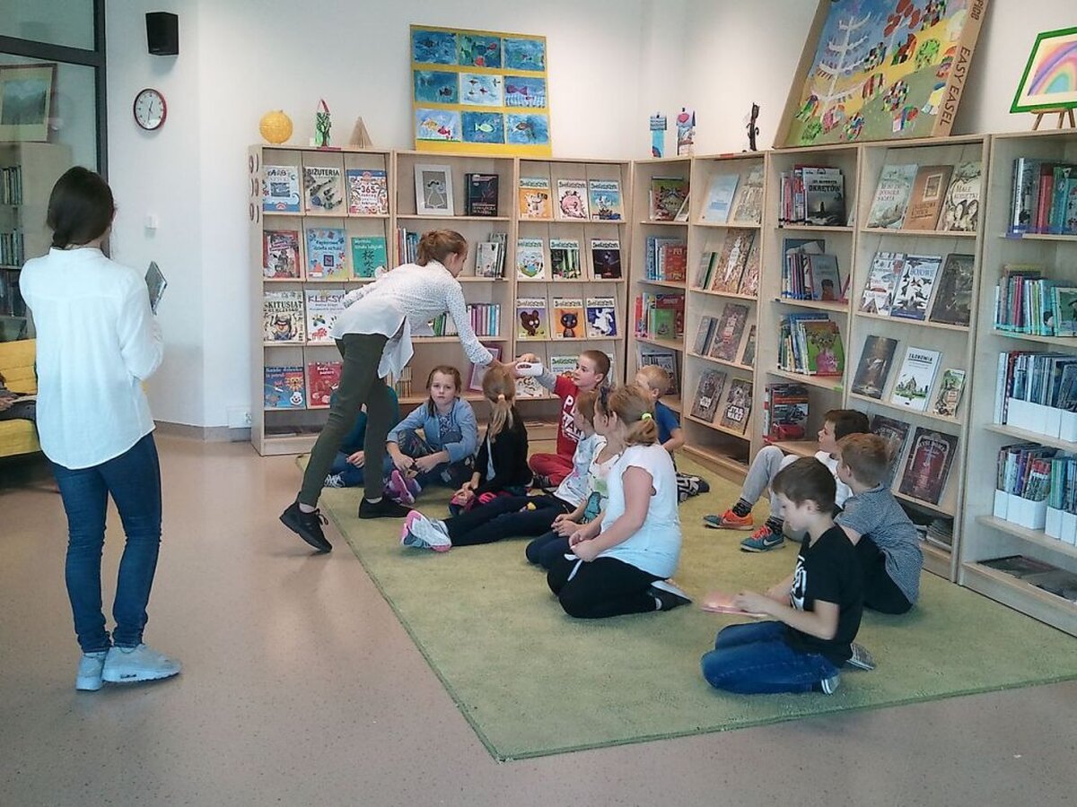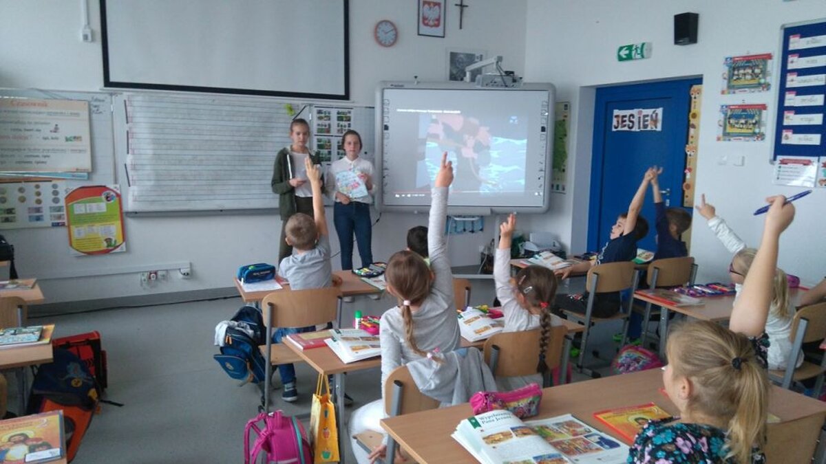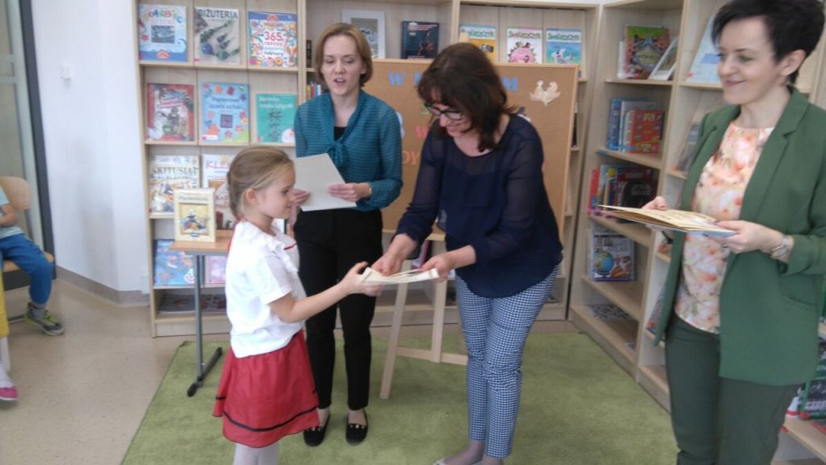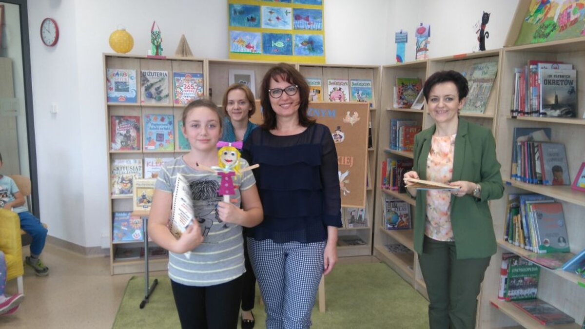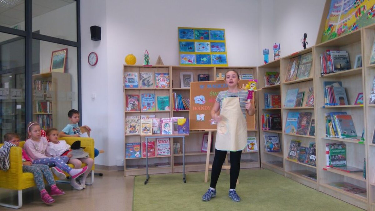 Dopełnieniem były quizy o wierszach W. Chotomskiej prowadzone przez gimnazjalistki z kl.2DG: Klaudię Luderę i Laurę Liptak; na przerwach w czytelni oraz w klasach 1-4 w czasie lekcji. Dzieciaki z dużym zaangażowaniem brały udział w zagadkowych potyczkach za co w nagrodę otrzymały słodkości.