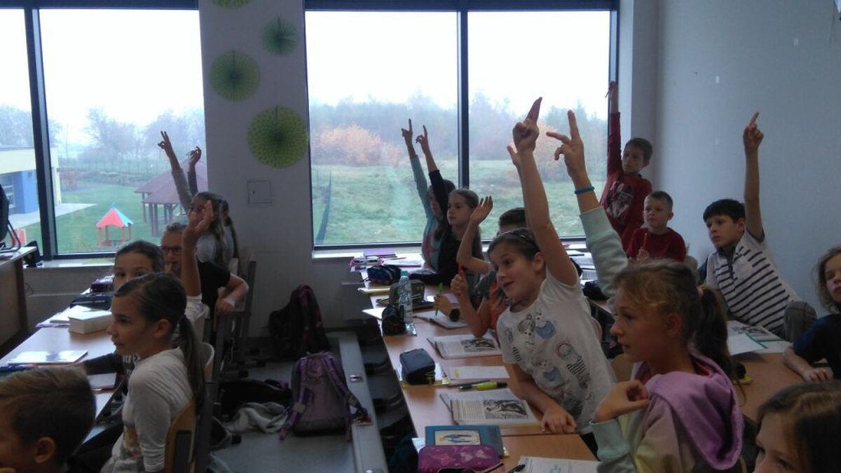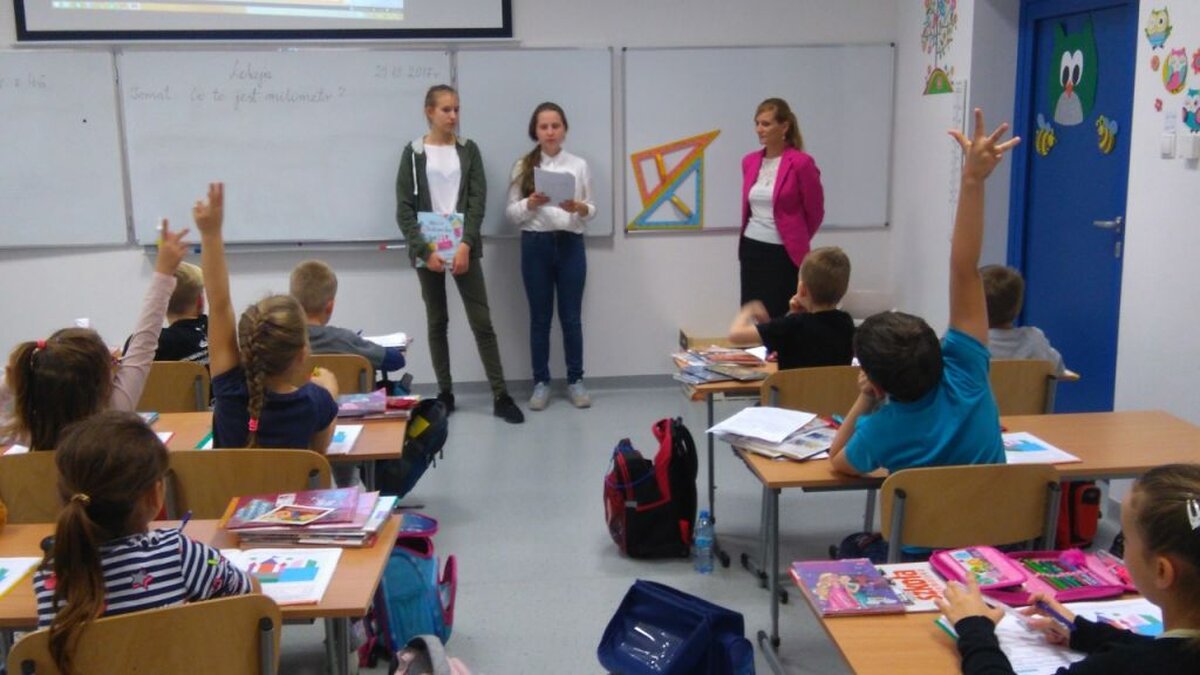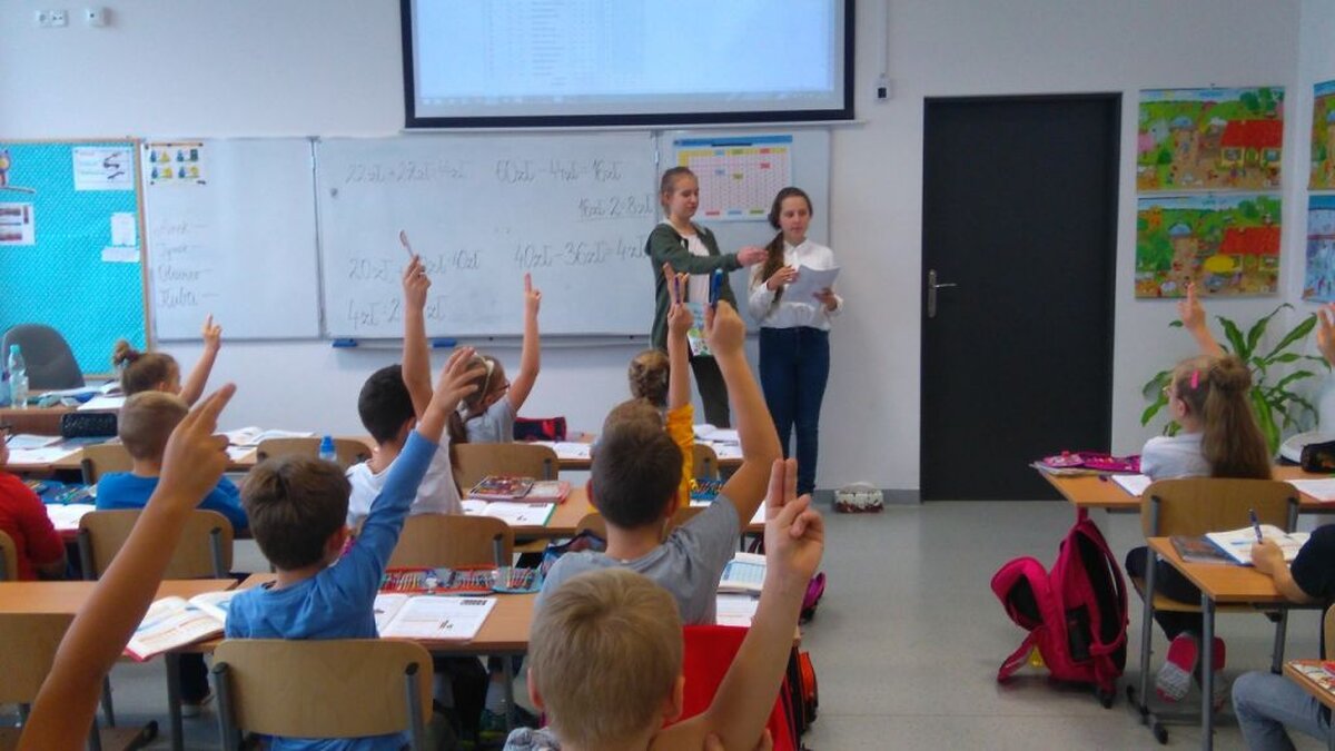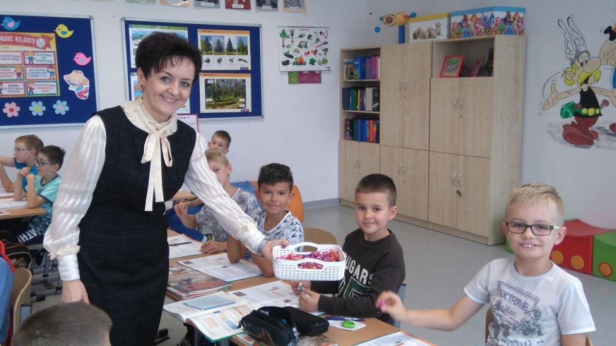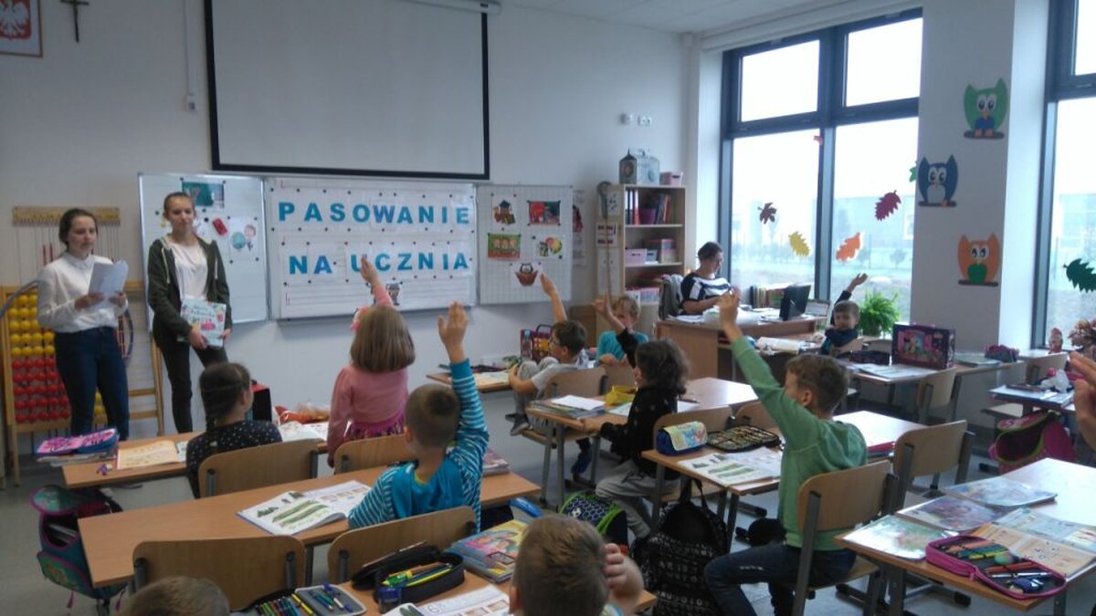Dopełnieniem były quizy o wierszach W. Chotomskiej prowadzone przez gimnazjalistki z kl.2DG: Klaudię Luderę i Laurę Liptak; na przerwach w czytelni oraz w klasach 1-4 w czasie lekcji. Dzieciaki z dużym zaangażowaniem brały udział w zagadkowych potyczkach za co w nagrodę otrzymały słodkości.