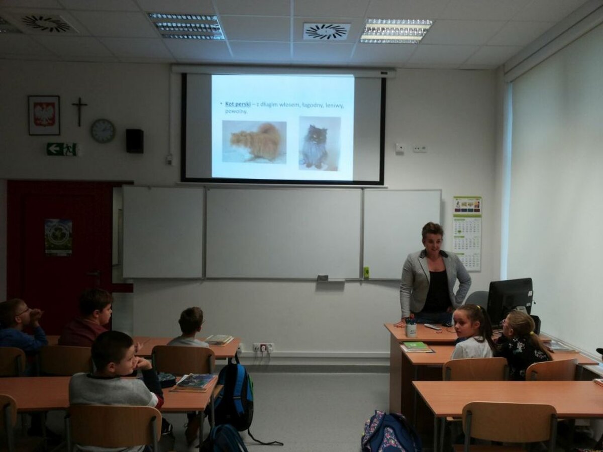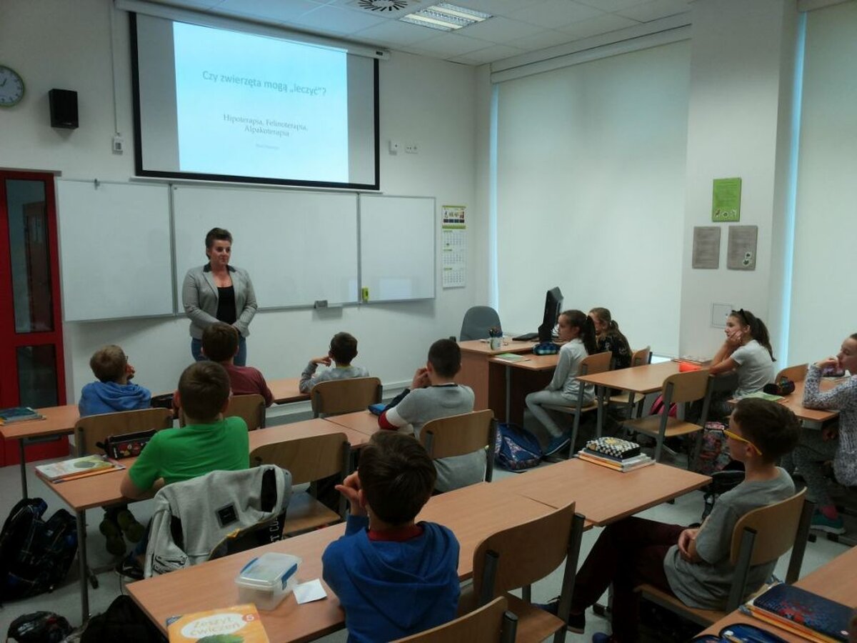 W dniu 7 listopada klasa 5b wzięła udział w warsztatach edukacyjnych pn. Czy zwierzęta mogą „leczyć”? Warsztaty te poprowadziła Pani dr Daria Sawaryn, adiunkt w Katedrze Turystyki i Rekreacji oraz w Katedrze Zdrowia Publicznego Wyższej Szkoły Informatyki i Zarządzania w Rzeszowie. Głównym tematem zajęć była zooterapia. Piątoklasiści dowiedzieli się, iż w Polsce najczęściej spotykane formy zooterapii to: hipoterapia – (konie), felinoterapia – (koty), kynoterapia – (psy). Hipoterapia jest jedną z form rehabilitacji wieloprofilowej, czyli oddziałującej jednocześnie ruchowo, sensorycznie, psychicznie i społecznie. Stosowana jest zarówno u dzieci, u młodzieży, jak i u dorosłych. Konie stosowane w hipoterapii dobiera się starannie pod kątem pożądanych cech (przede wszystkim cech charakteru). Muszą one być m.in.: łagodne, posłuszne, o odpowiedniej budowie i wieku. Uczniowie z zaciekawieniem słuchali opowiadań o kocie, który pomaga chorym dzieciom. Jest on bardzo łagodny, je z łyżeczki i reaguje na różne komendy. Podczas zajęć piątoklasiści wykazali się dużą aktywnością, a nasz gość odpowiedział na wszystkie pytania uczniów.