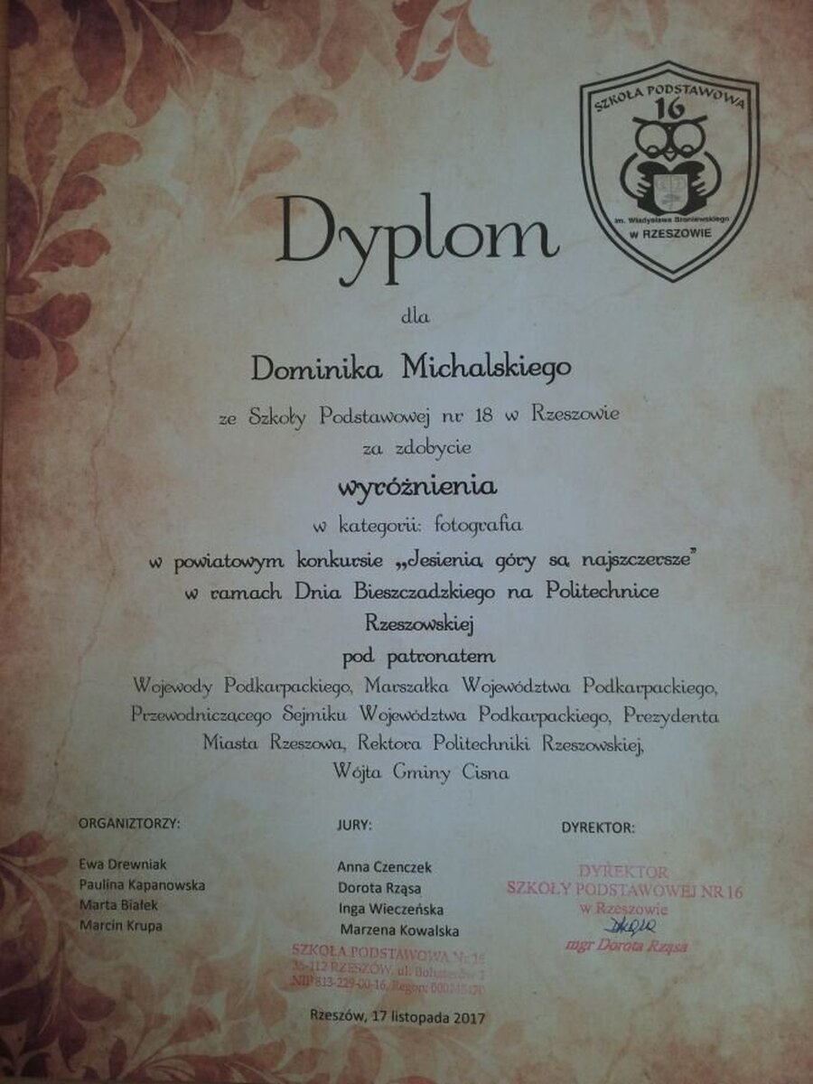 Uczeń klasy 4a Dominik Michalski zdobył wyróżnienie w powiatowym konkursie pt. „Jesienią góry są najszczersze”. Patronat nad tegorocznym konkursem sprawował Wojewoda Podkarpacia, Marszałek Województwa Podkarpackiego, Prezydent Miasta Rzeszowa oraz Rektor Politechniki Rzeszowskiej. Czwartoklasista wykonał bardzo ciekawą fotografię przedstawiającą góry jesienną porą. Wręczenie nagród odbyło się podczas Dnia Bieszczadzkiego organizowanego przez Stowarzyszenie „Natchnieni Bieszczadem”, Szkołę Podstawową nr 16 w Rzeszowie, Politechnikę Rzeszowską oraz Ruch Miejski „Rzeszów Smart Citi”.