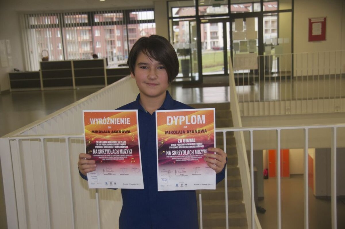 Nasz uczeń z klasy 6a Mikołaj Asanow został wyróżniony w konkursie wokalnym „Na skrzydłach muzyki”. Konkurs ten cieszy się dużym zainteresowaniem wśród dzieci i młodzieży. Cieszymy się i życzymy dalszych sukcesów Mikołajowi.