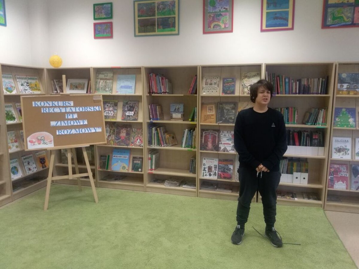 Wielkimi krokami zbliża się jedna z najpiękniejszych pór roku – zima. Z tej okazji, nauczycielki języka polskiego: Patrycja Durka i Natalia Kaleta-Bodzenta, zorganizowały konkurs recytatorski dla klas 4-7 pod tytułem „Zimowe rozmowy”. Uczestnicy, którzy zgłosili się do udziału w konkursie mieli utrudnione zadanie, ponieważ nie tylko musieli nauczyć się wiersza na pamięć. Musieli również samodzielnie wyszukać taki, którego tematem jest zima. 14 uczestników wspaniale poradziło sobie z tym wyzwaniem i w trakcie konkursu, który odbył się 20 grudnia, usłyszeć można było wiele pięknych wierszy o zimie.