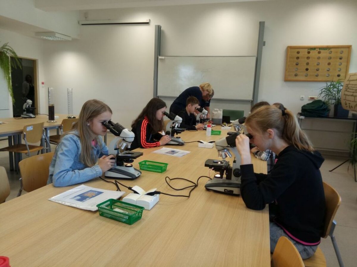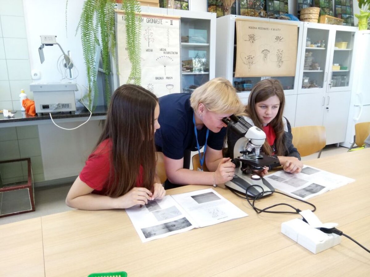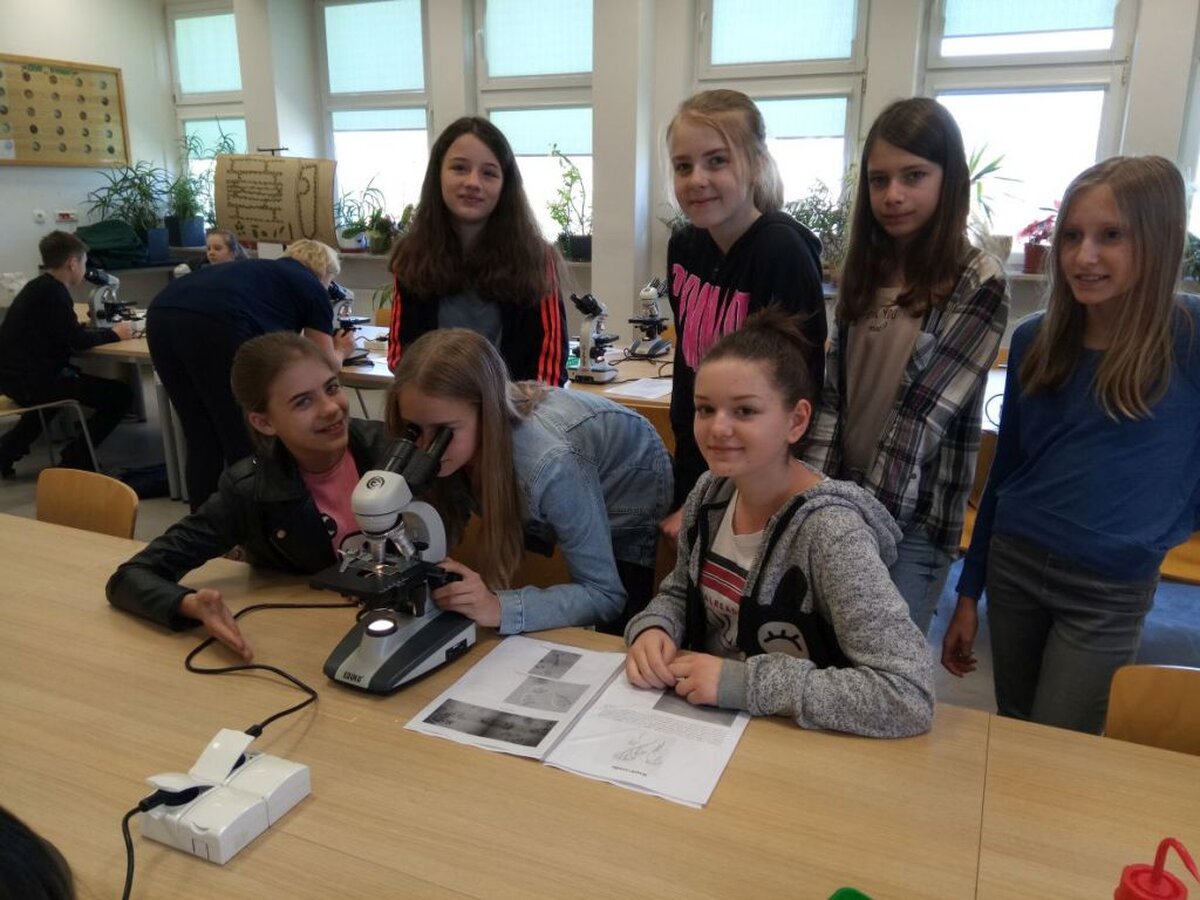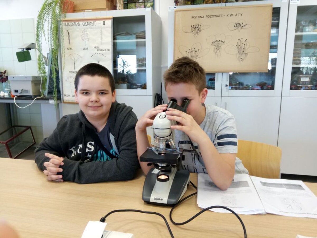 Rozpoczęliśmy od warsztatów pt. „Co zjada brud z Twoich skarpetek?”. Po zapoznaniu się z wyposażeniem laboratorium prowadzący przedstawił podstawowe grupy mikroorganizmów żyjących w wodzie oraz omówił sposoby oczyszczania ścieków. Po teorii przyszedł czas na praktykę. Każdy z uczestników warsztatów miał możliwość samodzielnej obserwacji mikroorganizmów pod mikroskopem. Naszym szóstoklasistom udało się dostrzec m.in. orzęski np. Vorticella.