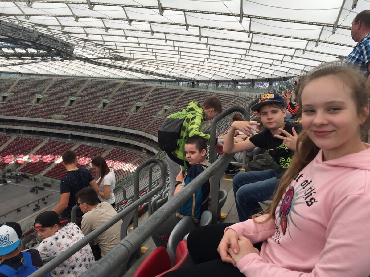 Pierwszy dzień zaczął się bardzo wcześnie, bo już po godz. 5.30 rano wyruszyliśmy w trasę. Dzięki temu koło południa dojechaliśmy do celu podróży i rozpoczęliśmy nasze zwiedzanie. Najpierw odwiedziliśmy Stadion Narodowy, weszliśmy na trybuny, zajrzeliśmy do szatni oraz poznaliśmy wiele zakamarków tego obiektu, który zrobił na wszystkich ogromne wrażenie.
