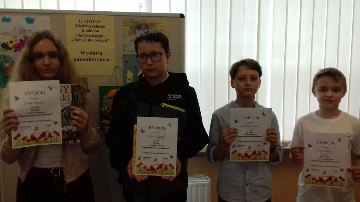 „Pożyteczne pszczoły” – to temat międzyszkolnego konkursu plastycznego w którym wzięli udział nasi uczniowie. Powstały przepiękne prace – malarskie i przestrzenne. Młodzi twórcy z wielkim zaangażowaniem podeszli do tematu i wynik ich starań zachwycił konkursowe jury. I miejsce zajął Dawid Drymajło z klasy 7 b, II miejsce – Mikołaj Baran z 6 a i Paulina Misiaszek z 7 a, wyróżnienie otrzymał Maciej Szeliga z 5 b.