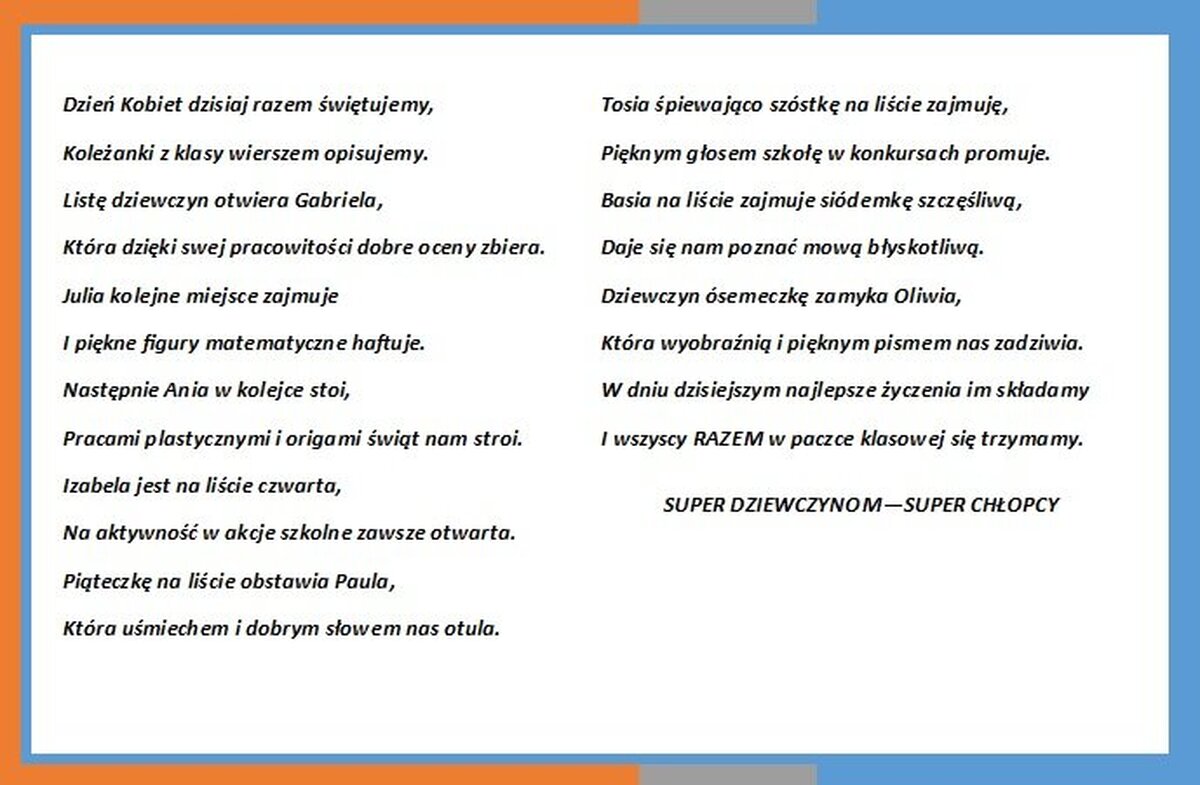 Dzień Kobiet to bardzo przyjemny dzień dla kobiet tych dużych i tych małych. W ten wyjątkowy czas chłopcy z klasy 4a zorganizowali miłą niespodziankę dla swoich koleżanek z klasy. Przygotowali okolicznościowy wiersz, wręczyli kwiaty, ciekawe breloczki z imionami oraz słodkości. Dziewczynki wraz panią wychowawczynią serdecznie podziękowały wszystkim chłopcom. Na koniec z uśmiechem robiliśmy fotki do albumu klasowego. Ten dzień spędziliśmy w miłej i radosnej atmosferze.