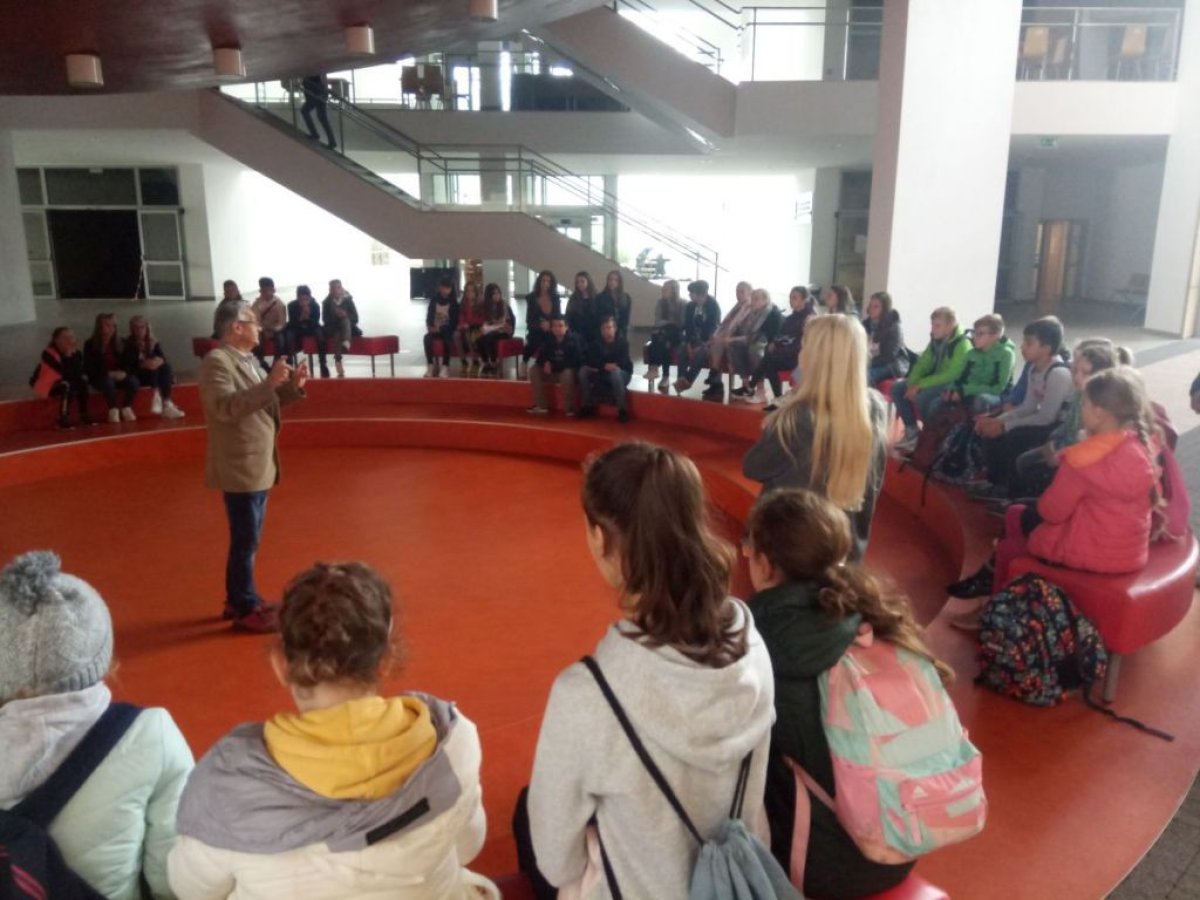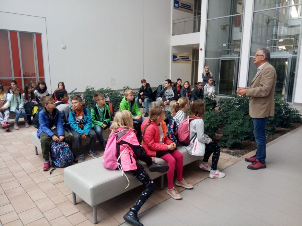 Pobyt na uczelni rozpoczął się od wspólnego spaceru, podczas którego uczniowie poznali logo Uniwersytetu, zaobserwowali rozwiązania proekologiczne zastosowane w budynku.