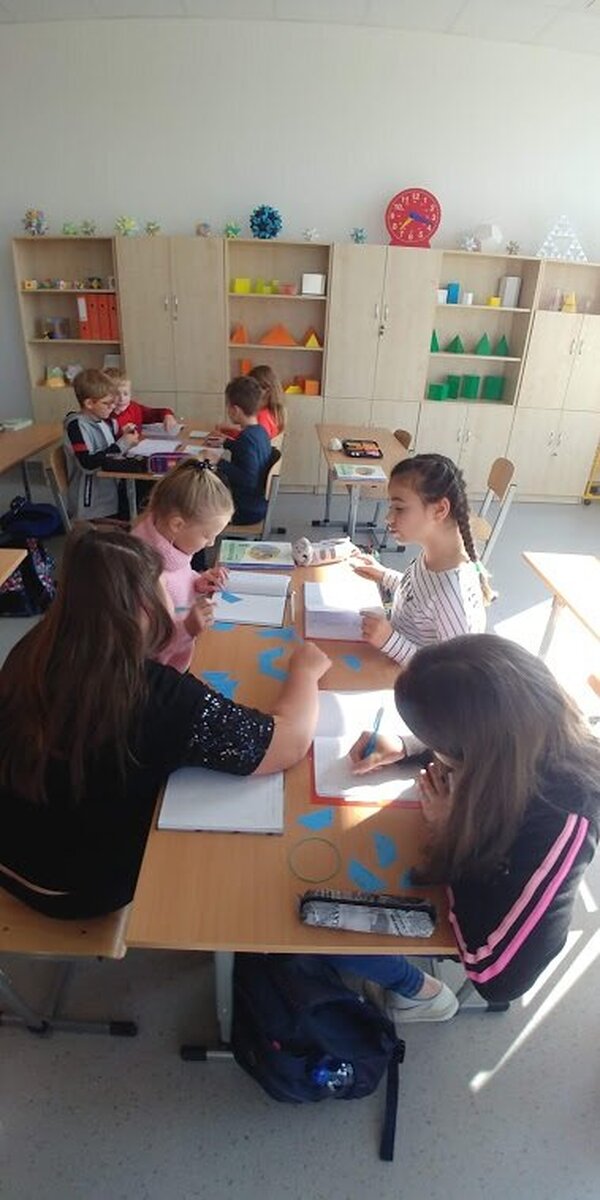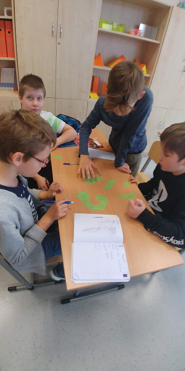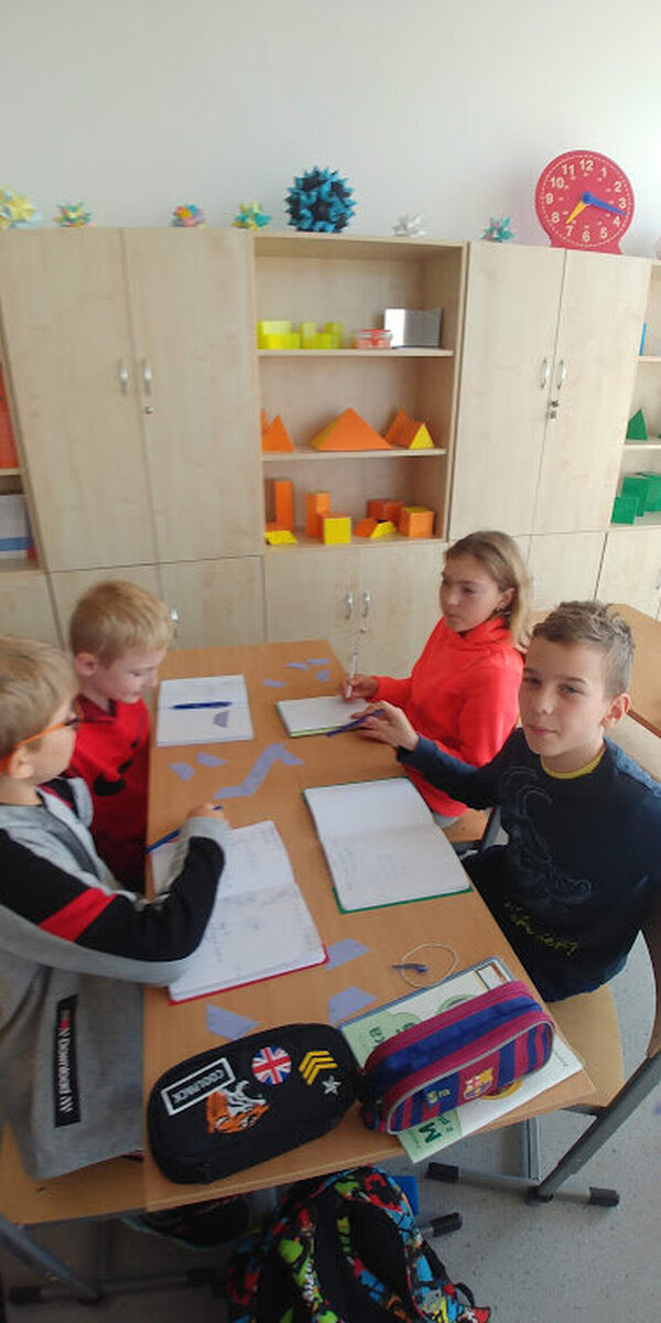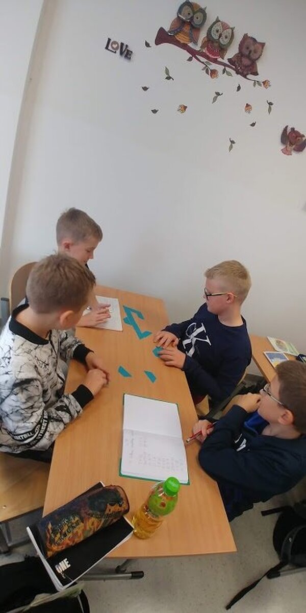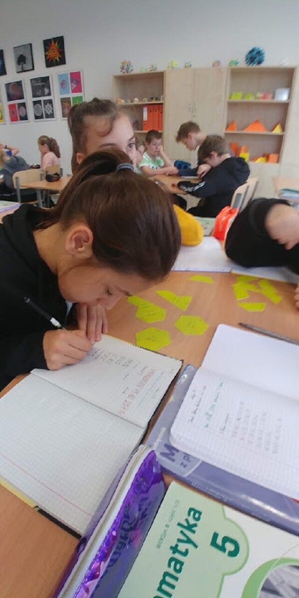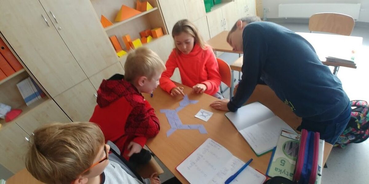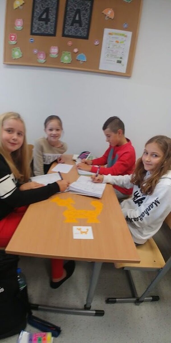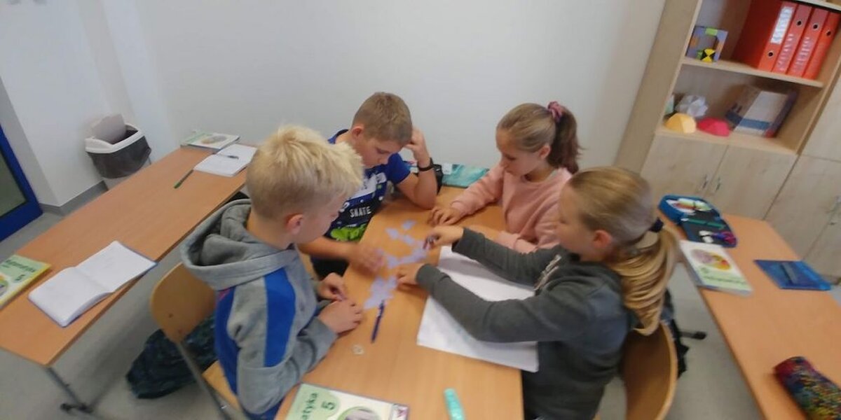 Od wieków wiadomo, że zmuszanie dziecka do nauki poprzez rozwiązywanie wielu przykładów w zeszycie jest mało efektywne i nieciekawe. Natomiast, jeżeli dziecko robi coś co lubi i jednocześnie uczy się, to ma to o wiele większe skutki. Dlatego uczniowie klasy 5a, 5c i 5e przekonali się, że naukę matematyki można połączyć z zabawą. W grupach 4 osobowych układali domino matematyczne, którego plansze miały kształt trapezów równoramiennych. Dzięki grze uczniowie lepiej wyćwiczyli umiejętność wykonywania czterech działań na liczbach, która w życiu codziennym jest niezbędna. Podczas układania domina ciekawość poznawcza uczniów była bardzo duża, każda drużyna chciała jako pierwsza ułożyć swoje domino. Dodatkową atrakcją było, że każde domino po ułożeniu przedstawiało obraz i tak powstały okulary, pies, statek, żuk, koń, mucha, ślimak itd. Gry dydaktyczne podczas lekcji są bardzo przydatne i sprawiają, że nauka matematyki jest przyjemna.