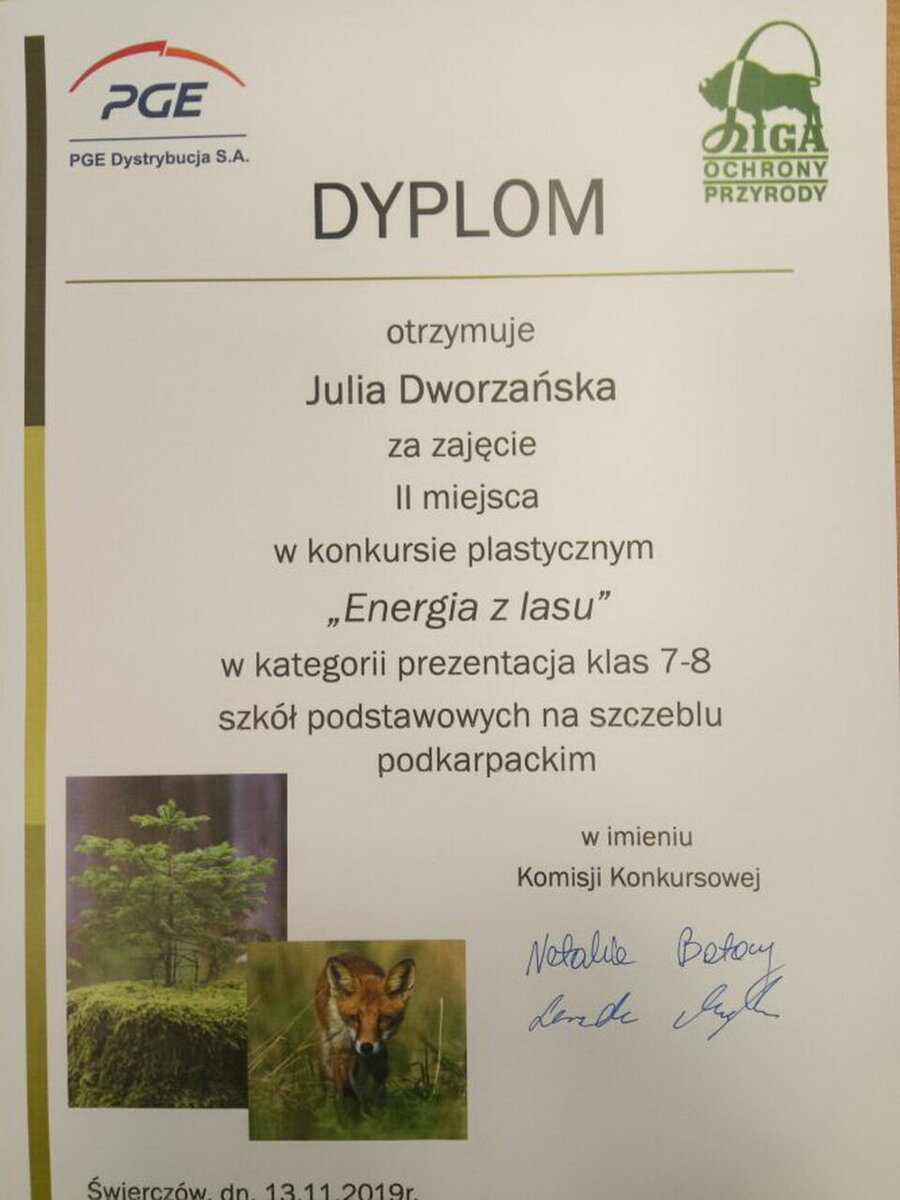 W dniu 13 listopada 2019 r. w Centrum Edukacji Ekologicznej przy Nadleśnictwie Kolbuszowa odbyło się uroczyste wręczenie nagród w Wojewódzkim Konkursie dla młodzieży szkolnej "ENERGIA Z LASU" zorganizowanym przez Okręg Podkarpacki Ligi Ochrony Przyrody w Rzeszowie oraz PGE Dystrybucja S.A. Oddział Rzeszów.