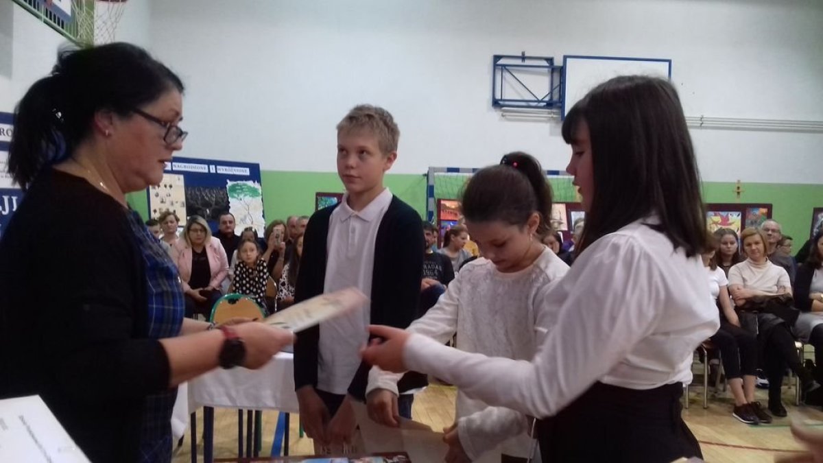 Na uroczystej gali rozdania nagród nie zabrakło także naszych uczniów, którzy wykonali prace plastyczne związane z twórczością Henryka Sienkiewicza lub popisali się kunsztem literackim, redagując karki z pamiętnika Sienkiewiczowskich bohaterów i wywiady z postaciami z powieści naszego noblisty.