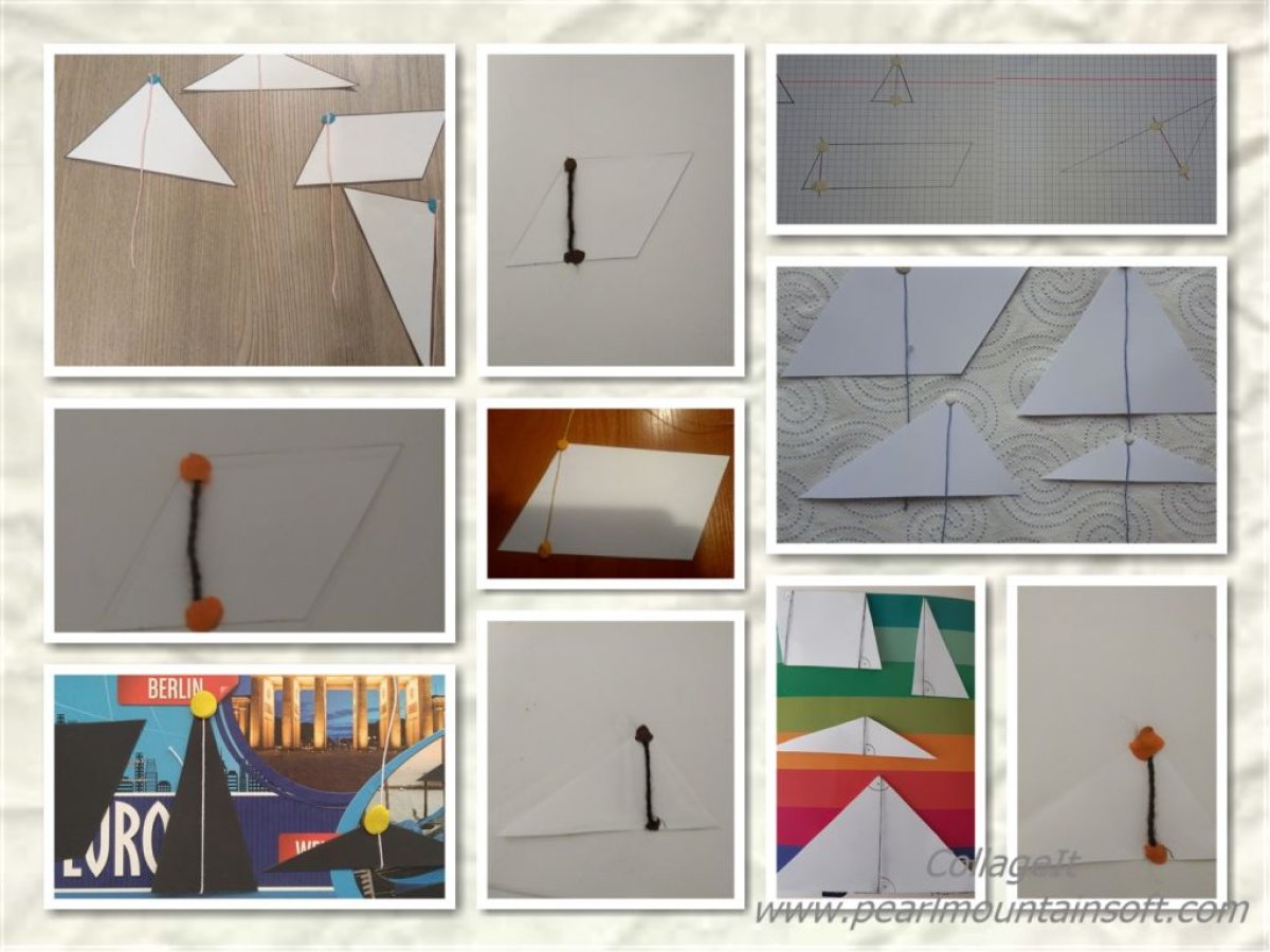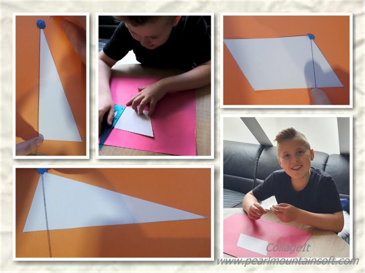 Lekcje matematyki nawet podczas nauczania zdalnego opierają się na doświadczeniu z wykorzystywaniem modeli. Aby zrozumieć pojęcie pola równoległoboku, trójkąta czy trapezu trzeba opanować umiejętność rysowania i wyznaczania wysokości danej figury. Uczniowie klasy 5a, 5c i 5e uczą się wyznaczać wysokość równoległoboku i trójkąta za pomocą modeli figur wyciętych z kartonu oraz nitki lub sznurka. Jeśli model równoległoboku lub trójkąta przytrzymamy i postawimy pionowo na biurku to przyczepiona nitka ułoży się jako wysokość. Zapraszamy do obejrzenia zdjęć naszych uczniów.
