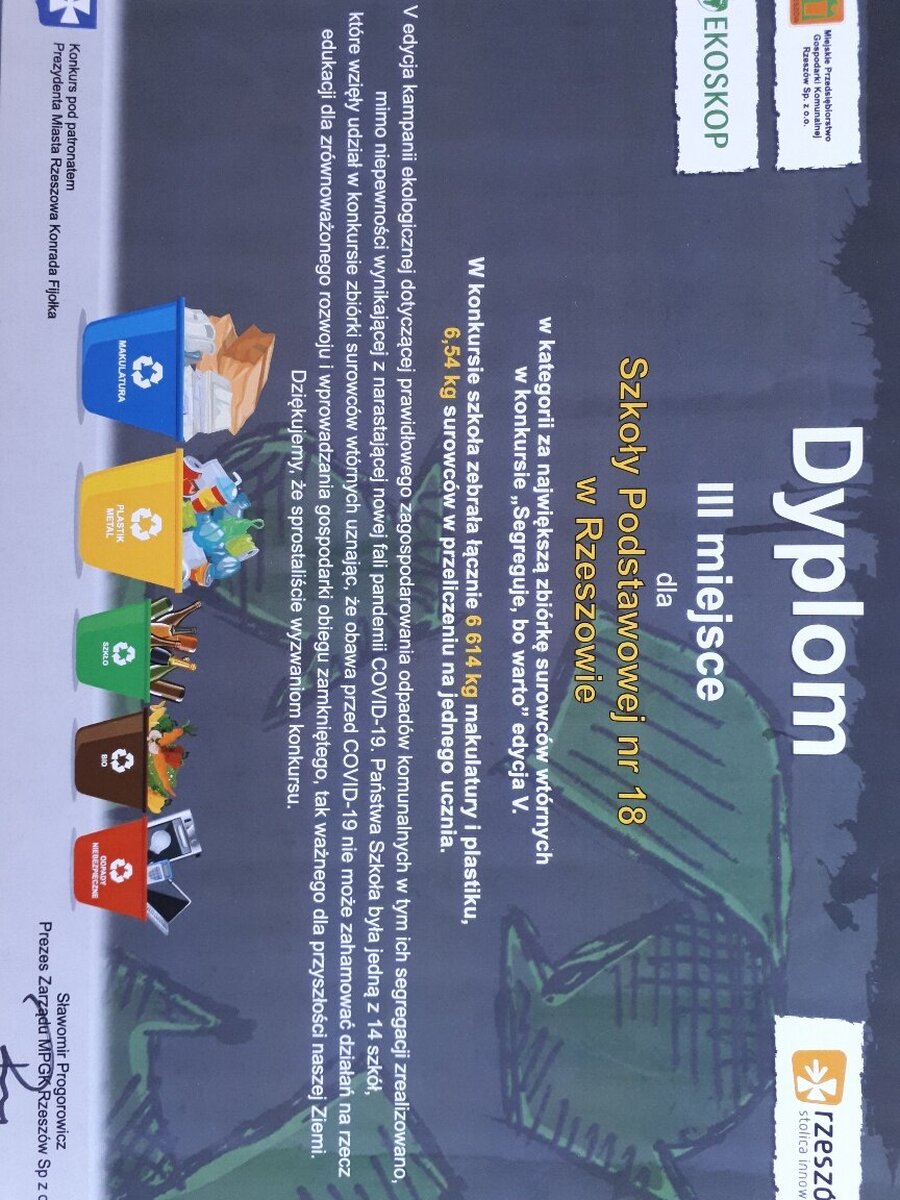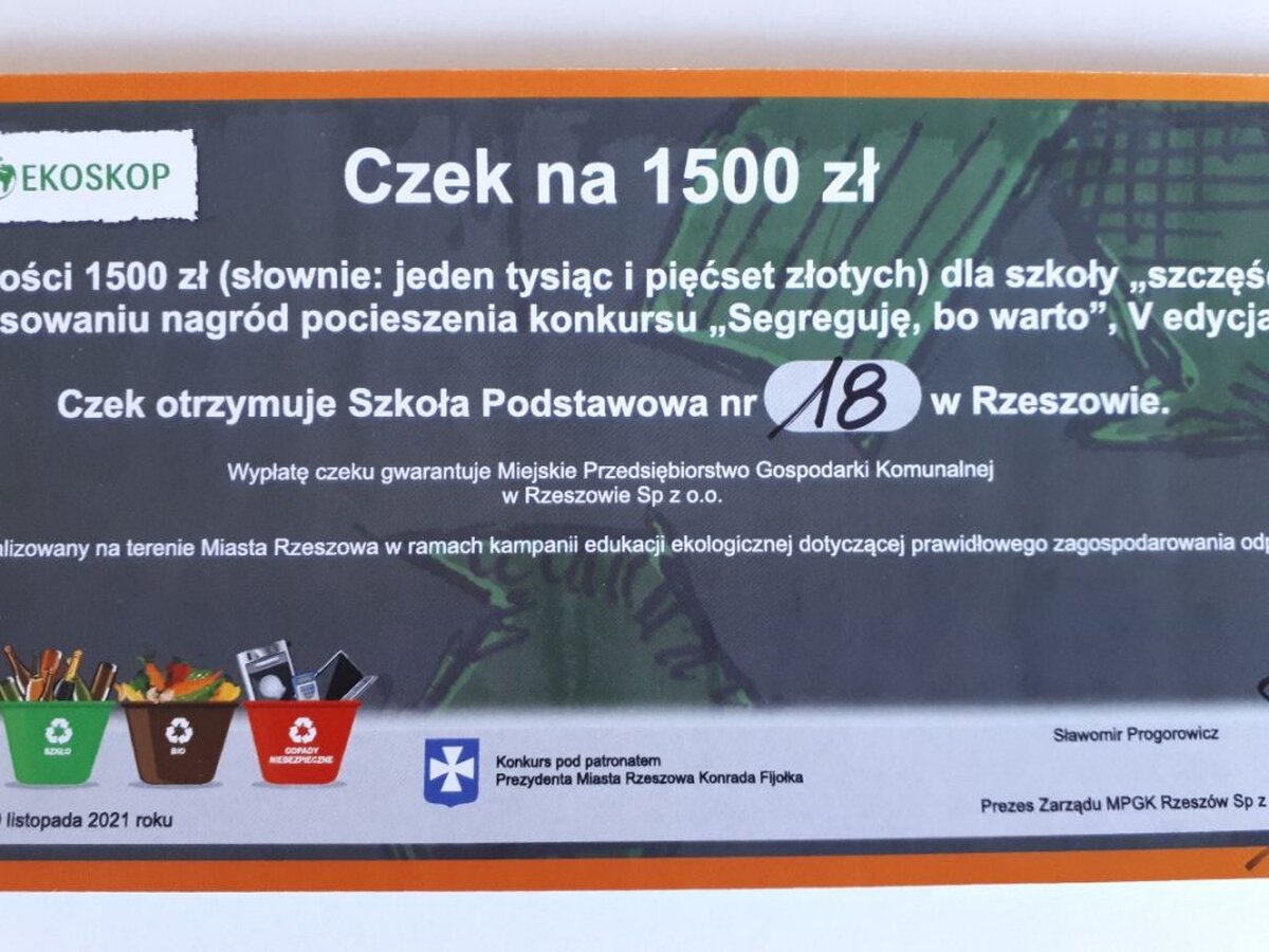 Nasza szkoła wzięła udział w piątej edycji konkursu „Segreguję, bo warto” organizowanego przez Miejskie Przedsiębiorstwo Gospodarki Komunalnej w Rzeszowie i Stowarzyszenie EKOSKOP.
