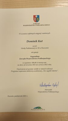 Dominik Kut z klasy 7a stypendystą programu stypendialnego "Nie zagubić talentu"