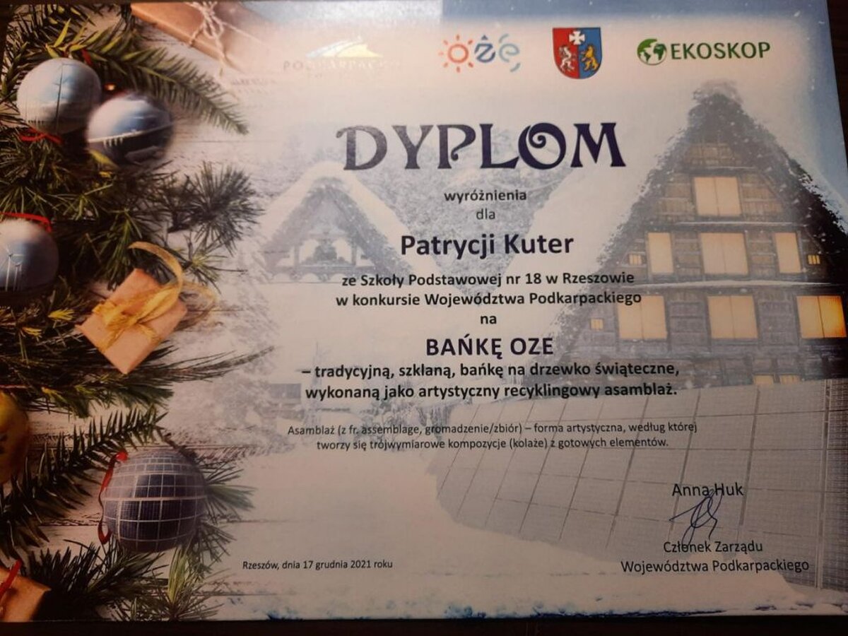 Miło nam poinformować, że nasza uczennica Patrycja Kuter z klasy 5c, otrzymała nagrodę wyróżnienia w konkursie na "recyklingową" bożonarodzeniową bańkę na choinkę promującą technologie OZE (odnawialne źródła energii) tzw.: BAŃKĘ OZE.