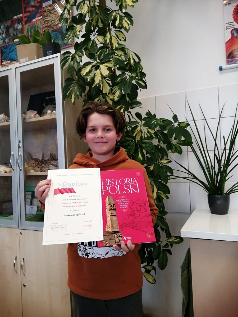 Tuż przed świętami miła niespodzianka spotkała Jeremiasza Jędrusika z kl. 7d, który został wyróżniony w IV Międzyszkolnym Konkursie Literackim, zorganizowanym z okazji 103. rocznicy odzyskania przez Polskę niepodległości. Zadaniem Jeremiasza było napisanie opowiadania inspirowanego słowami poetki Wisławy Szymborskiej: "Można nie kochać cię – i żyć, ale nie można owocować". Spośród wielu uczestników praca została doceniona z czego bardzo się cieszymy i gratulujemy, życząc dalszych sukcesów literackich.