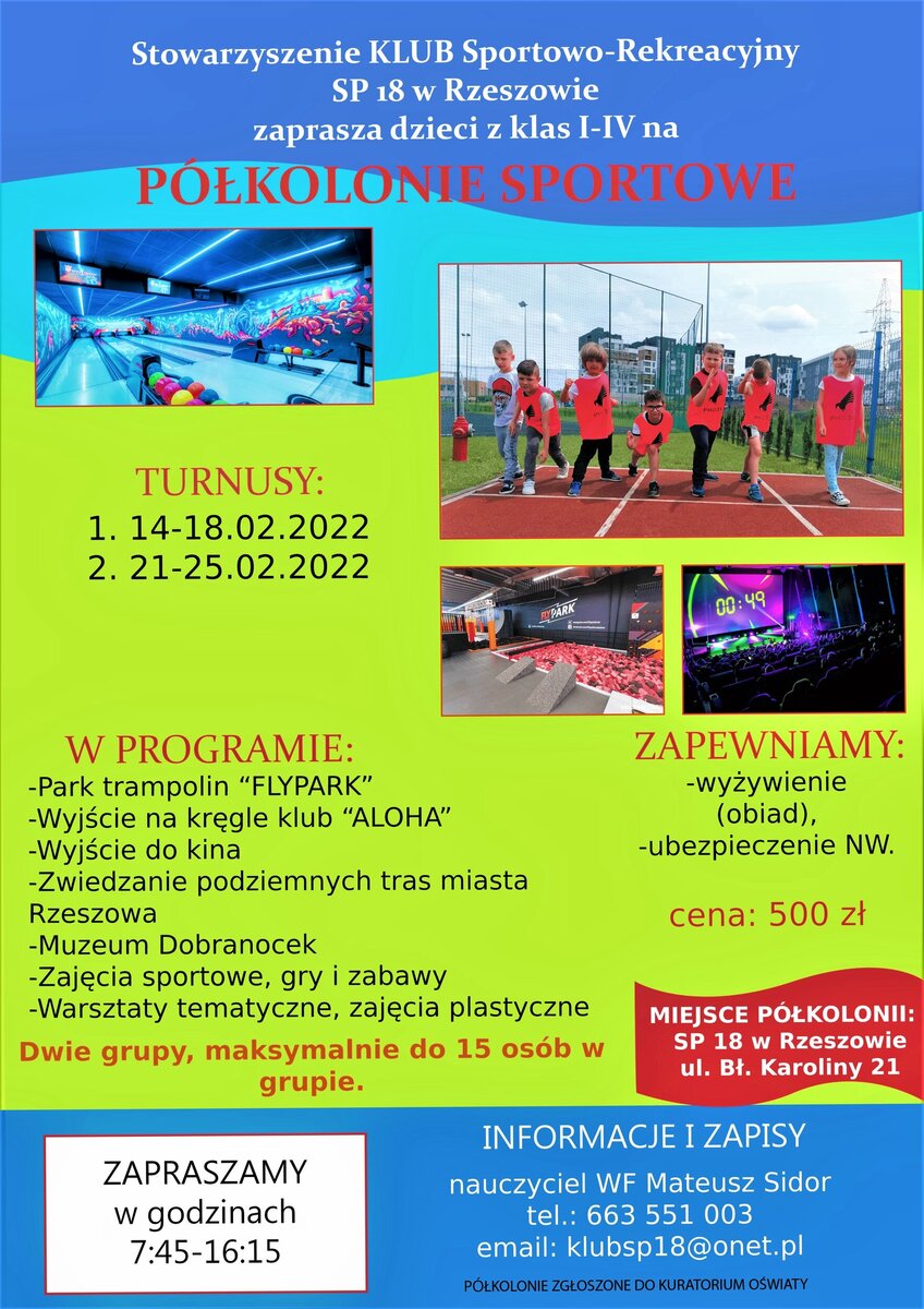 Stowarzyszenie KLUB Sportowo - Rekreacyjny SP 18 w Rzeszowie serdecznie zaprasza na półkolonie sportowe odbywające się na obiektach SP 18, półkolonie odbywają się podczas ferii zimowych. Więcej informacji na plakatach.