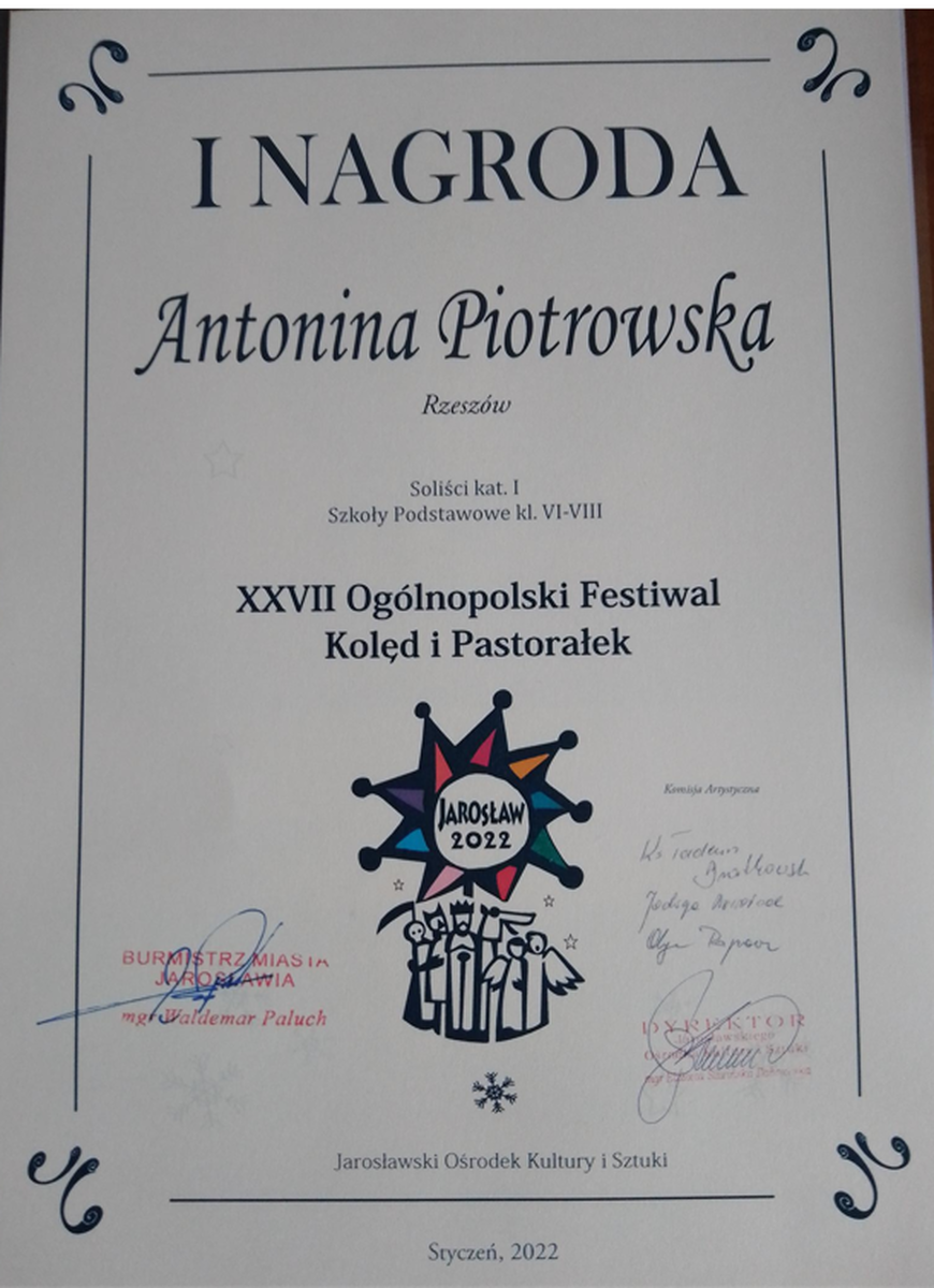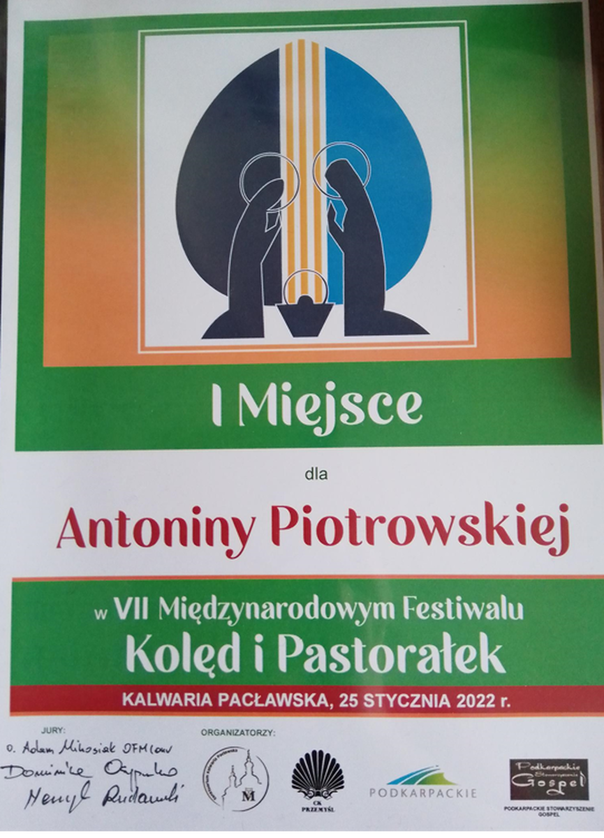 Kolejno 23 stycznia 2022 roku wystąpiła w Jarosławiu w Koncercie Galowym Laureatów XXVII Ogólnopolskiego Festiwalu Kolęd i Pastorałek, w którym zdobyła I nagrodę w swojej kategorii wiekowej. Następnie 25 stycznia 2022 roku Antonina zajęła I miejsce w VII Międzynarodowym Festiwalu Kolęd i Pastorałek w Kalwarii Pacławskiej.