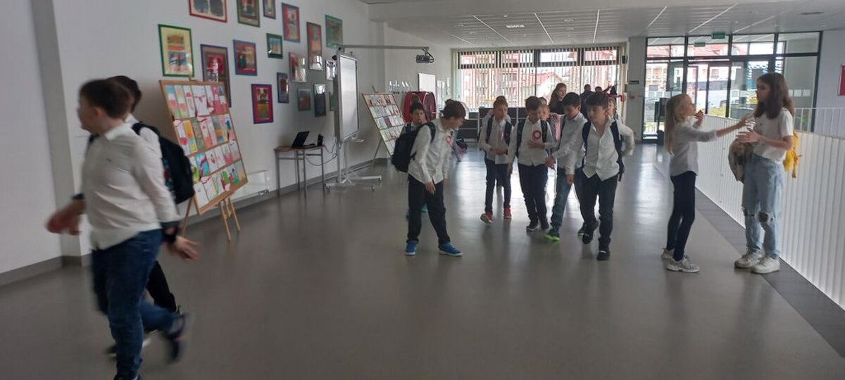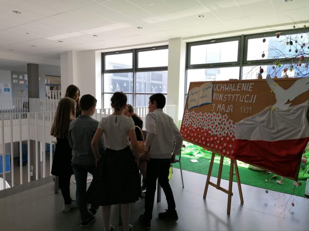 W dniu 29 kwietnia obchodziliśmy w Naszej szkole 231 rocznicę uchwalenia Konstytucji 3 maja. Z tej okazji wszyscy uczniowie, nauczyciele i pracownicy szkoły założyli odświętne stroje, a na piersiach zawisły biało-czerwone kotyliony. Hol szkoły ozdobiły prace plastyczne przygotowane przez uczniów z klas 1-3 przedstawiające polskie symbole narodowe i scenki okolicznościowe prezentujące uchwalenie Konstytucji. Można też było obejrzeć prezentację multimedialną na temat okoliczności zwołania Sejmu Wielkiego, jego pracy i reform jakie w Rzeczpospolitej wprowadzała Konstytucja 3 maja. Przedstawiono też sylwetki zasłużonych dla dzieła reform działaczy patriotycznych tego okresu. Wszystko to zostało okraszone muzyką patriotyczną. Dodatkowo uczniowie mogli wziąć udział w konkursie poetyckim i przygotowali na niego krótkie utwory rymowane o tematyce świąt obchodzonych na początku maja w naszym kraju. Wszystkie wierszyki przygotowane przez dzieci świadczą o dużej ich wyobraźni, inwencji twórczej i znajomości świąt majowych. Jednak największym powodzeniem cieszył się quiz historyczny związany z Konstytucją. Ilość uczestników jacy wzięli w nim udział zaskoczył organizatorów, a opracowanie jego wyników potrwa zapewne jeszcze kilka najbliższych dni.