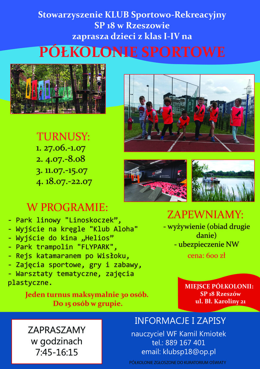 KLUB SPORTOWO-REKREACYJNY SP 18 Rzeszów serdecznie zaprasza dzieci z klas I-IV na PÓŁKOLONIE SPORTOWE organizowane w naszej szkole. Więcej informacji na plakatach oraz pod numerem telefonu organizatora.