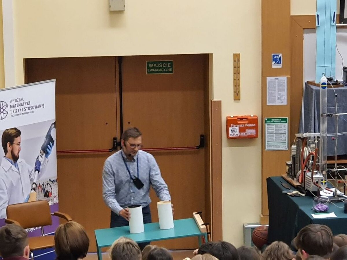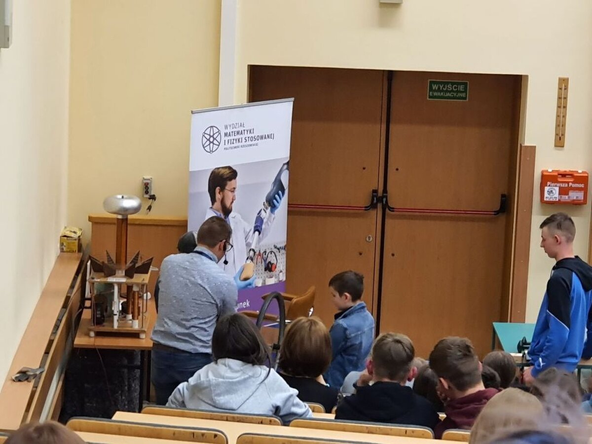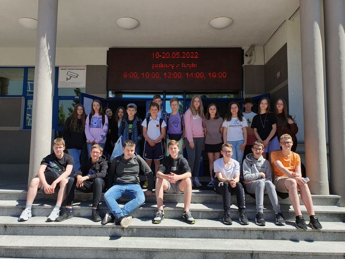 W dniu 19 maja 2022 uczniowie z klas 7c, 7a i 7d uczestniczyli w pokazach fizycznych zorganizowanych przez Politechnikę Rzeszowską. Program pokazów obejmował następujące zagadnienia: zasady zachowania, fale i akustyka, ciśnienie i elektromagnetyzm.