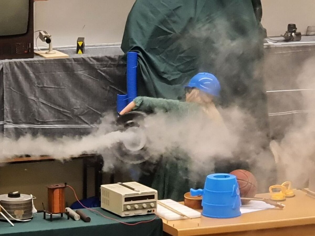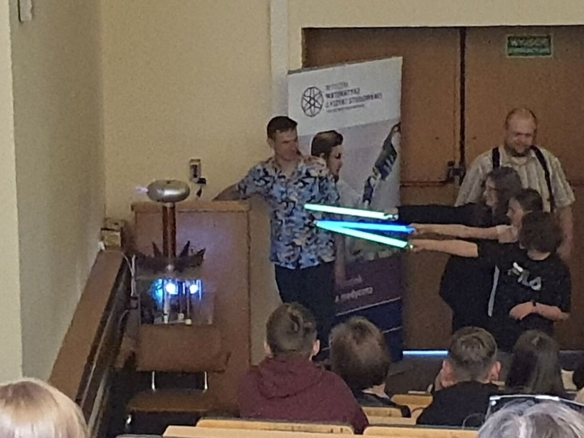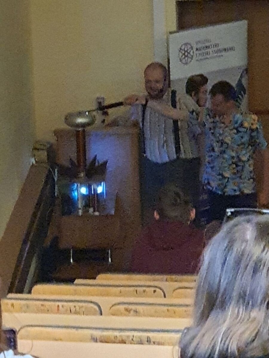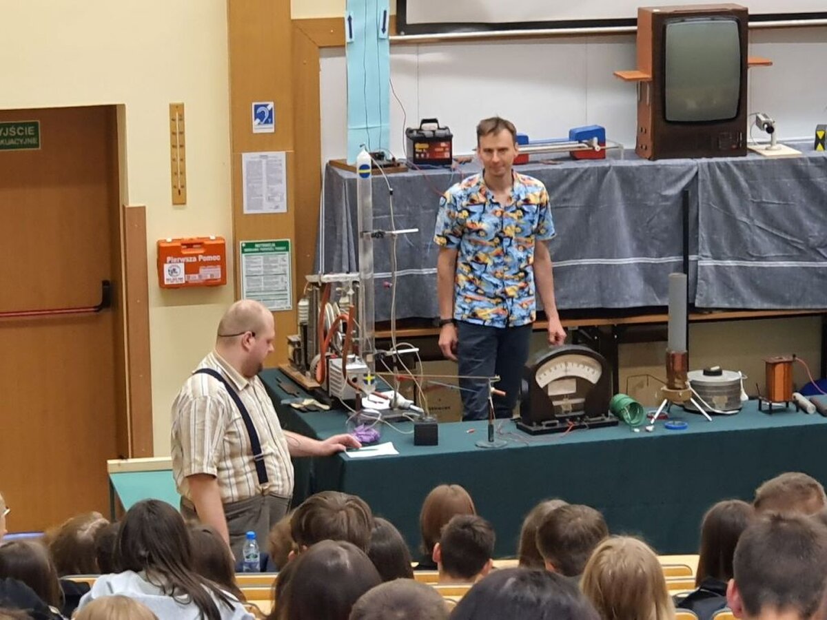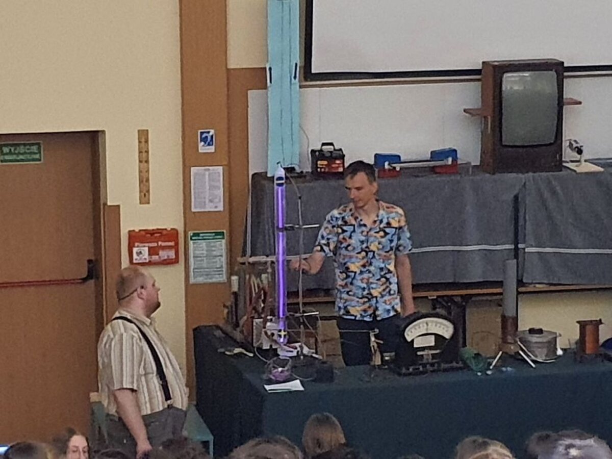 Zaczęło się imponująco, bo od bardzo efektownych eksperymentów potwierdzających zasady zachowania energii, pędu, momentu pędu. W doświadczeniach czynny brali również udział uczniowie przybyli na pokazy, w tym z naszej szkoły.