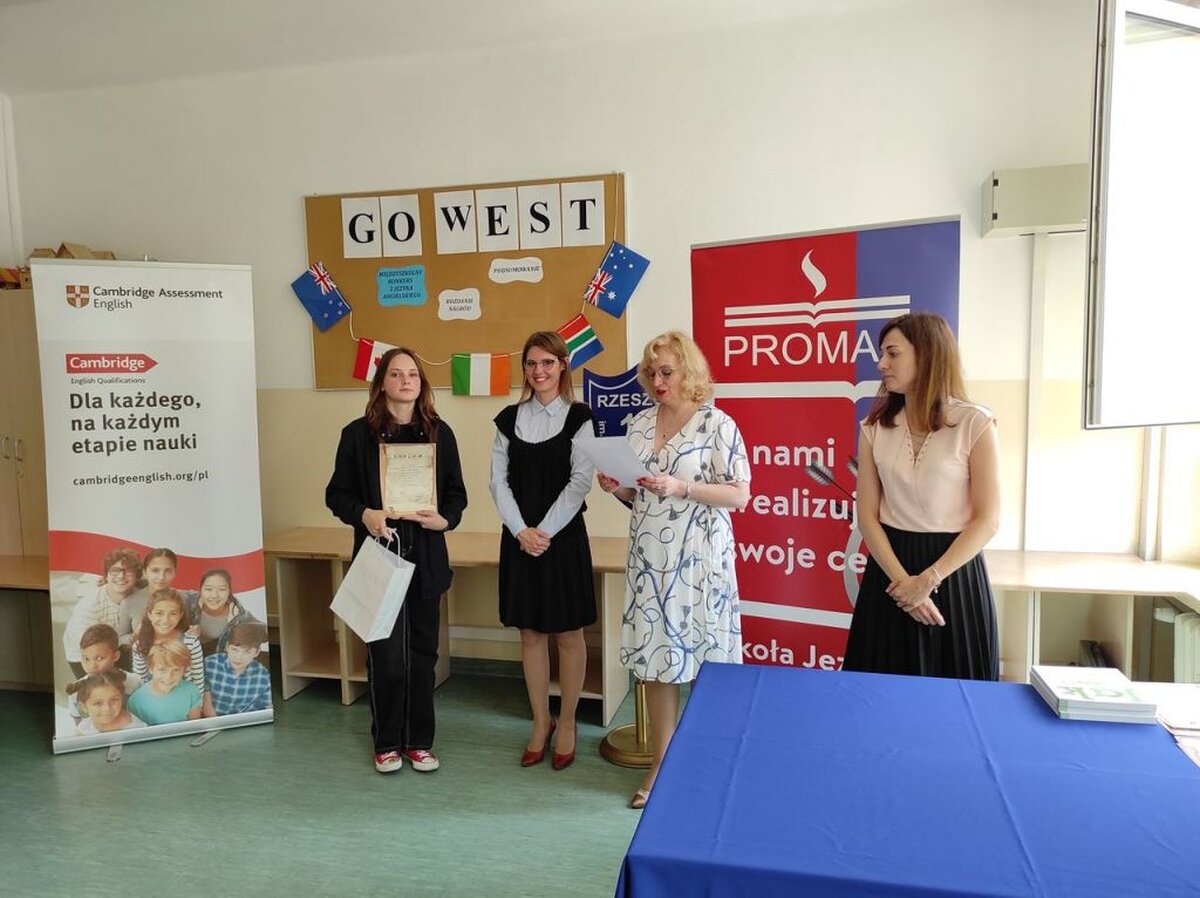 Z ogromną radością informujemy, że uczennica oddziału dwujęzycznego klasy 8b, Agata Lemiech, zdobyła tytuł Laureata w Międzyszkolnym Konkursie z języka angielskiego "Go West". Konkurs organizowany był przez Szkołę Podstawową nr 16 a patronat nad konkursem objął Prezydent Miasta Rzeszowa oraz Szkoła Językowa "Promar International".