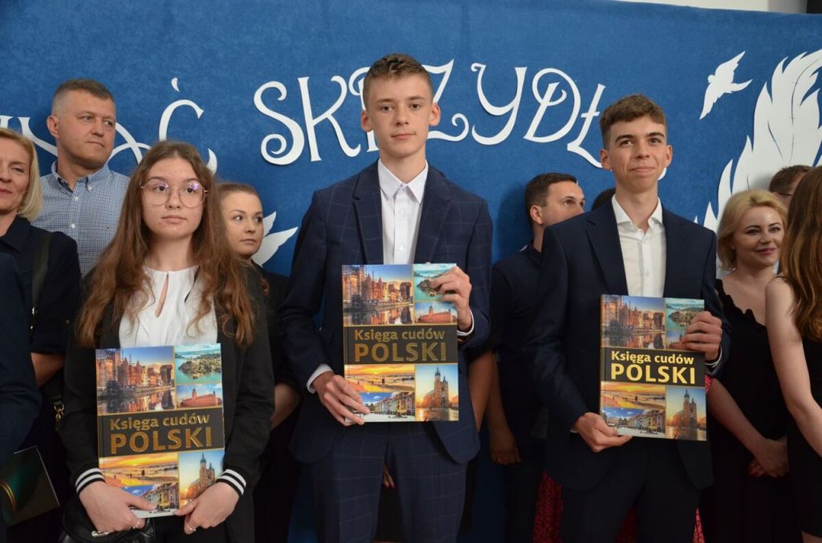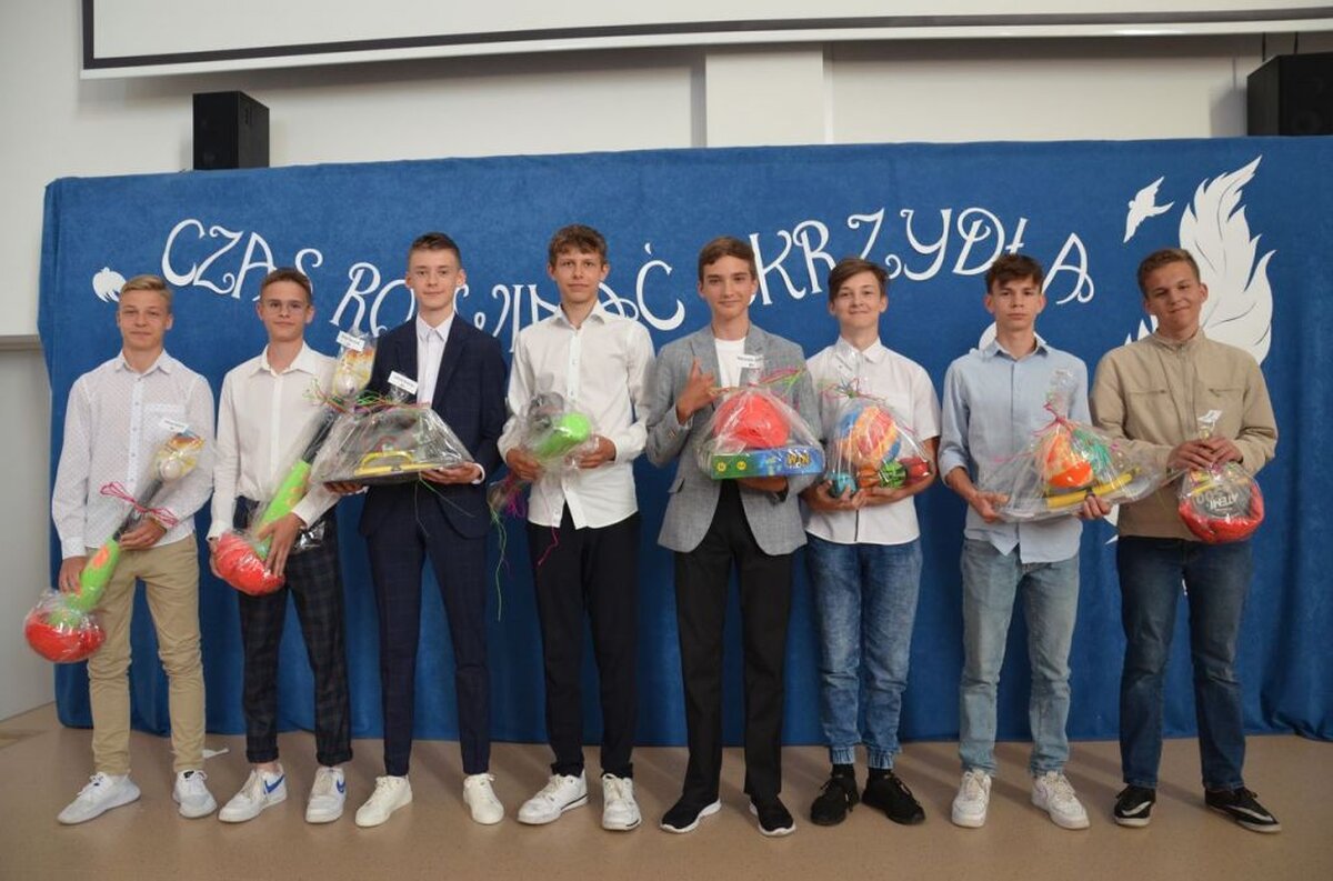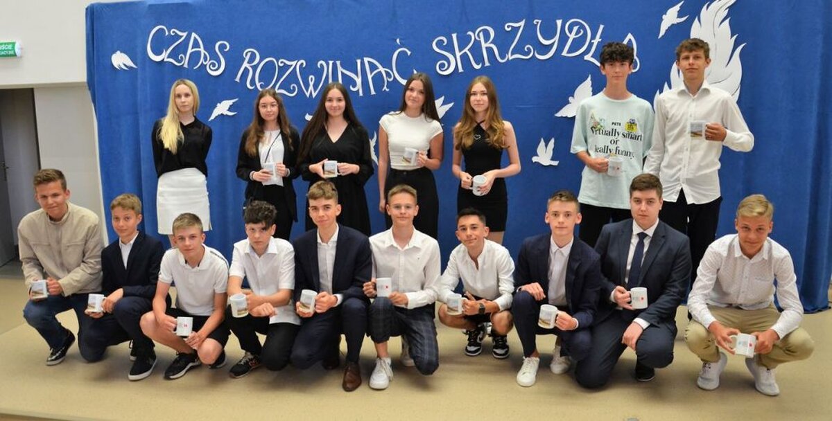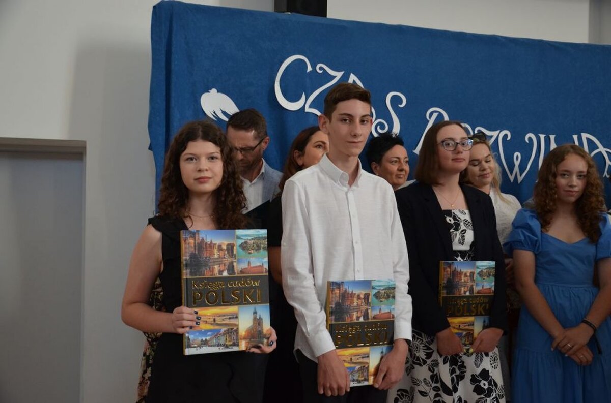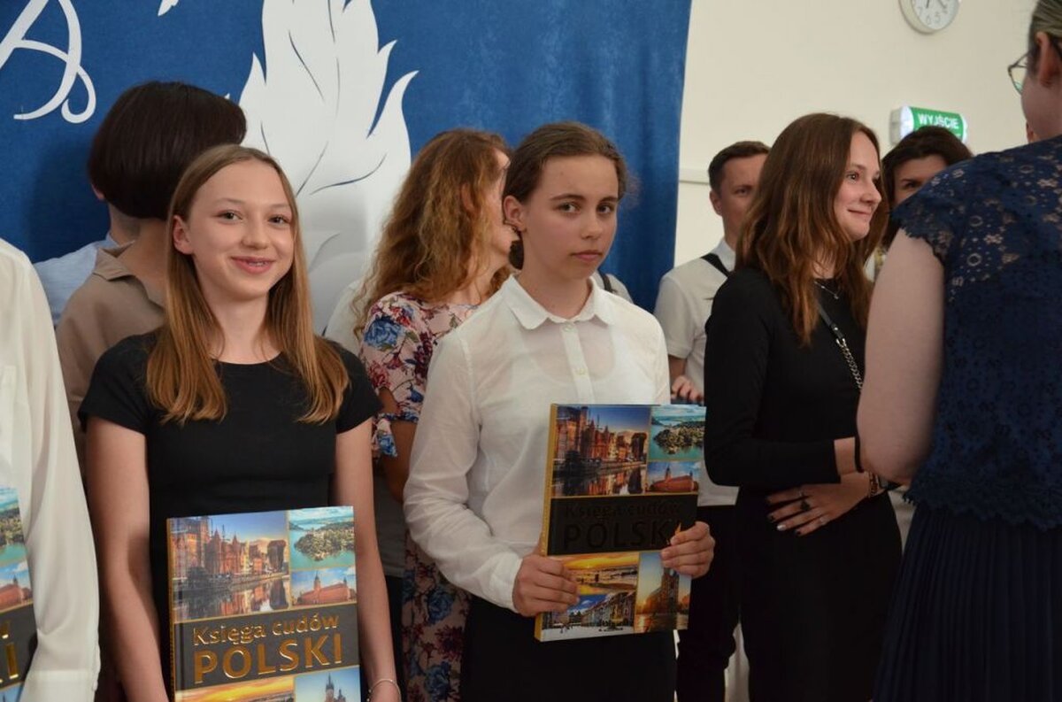 Następnie nadszedł moment wręczania dyplomów, wyróżnień i podziękowań dla uczniów oraz ich rodziców. Na scenie pojawili się ci, którzy w ósmej klasie uzyskali najwyższe średnie oraz zdobyli wysokie miejsca w konkursach przedmiotowych, artystycznych i sportowych.