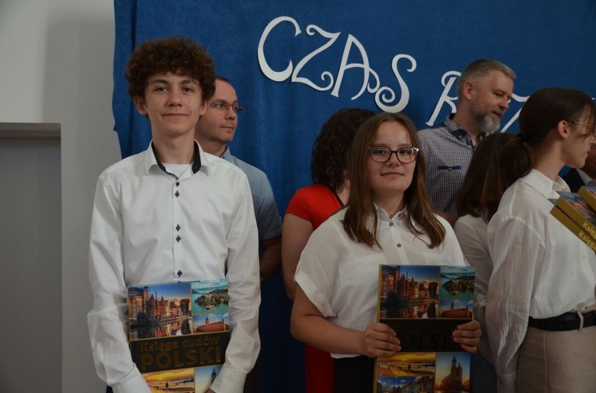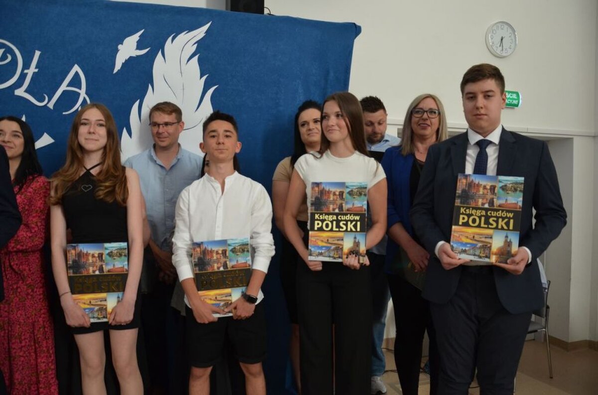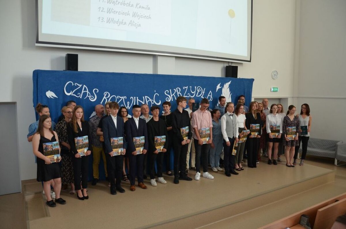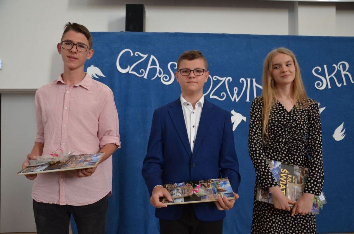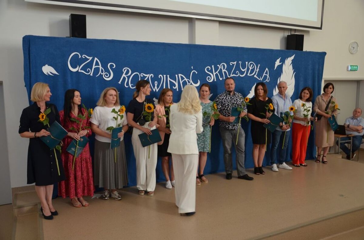 Następnie nadszedł moment wręczania dyplomów, wyróżnień i podziękowań dla uczniów oraz ich rodziców. Na scenie pojawili się ci, którzy w ósmej klasie uzyskali najwyższe średnie oraz zdobyli wysokie miejsca w konkursach przedmiotowych, artystycznych i sportowych.