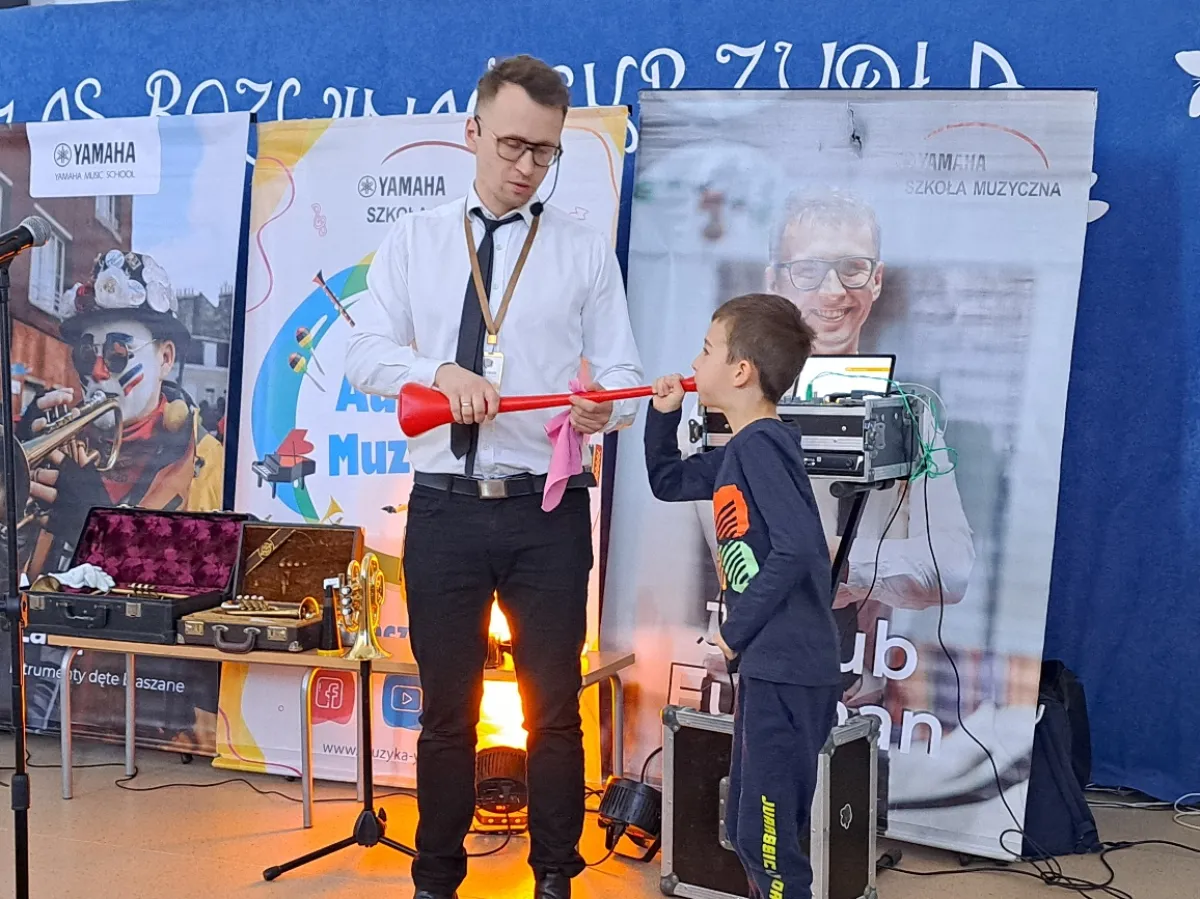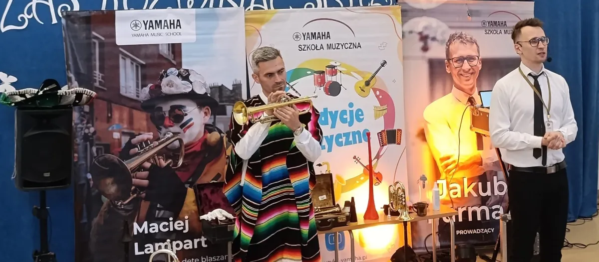 13 marca uczniowie z klas 1-3 po raz kolejny mieli okazję uczestniczyć w lekcji muzyki z Yamahą. Tym razem poznali historię instrumentów dętych blaszanych. A zaczęło się od rogu bydlęcego. Następnie muzycy zaprezentowali między innymi: trąbke piccollo, trąbkę kieszonkową, trąbkę flügelhorn oraz nie produkowaną już trąbkę skrzydłową. Dzieci miały okazję spróbować gry na trąbce i wuwuzeli. Przekonały się, że niełatwo jest zadąć w ustnik i otrzymać czysty dźwięk. Prowadzący pokazał również różne rodzaje tłumików, które wyciszają głośną grę trąbki, ale pomagają w trenowaniu umiejętności praktycznych. Uczniowie wysłuchali wiele utworów starszych i współczesnych zagranych na różnych rodzajach trąbek. To była uczta dla naszych uszu.
