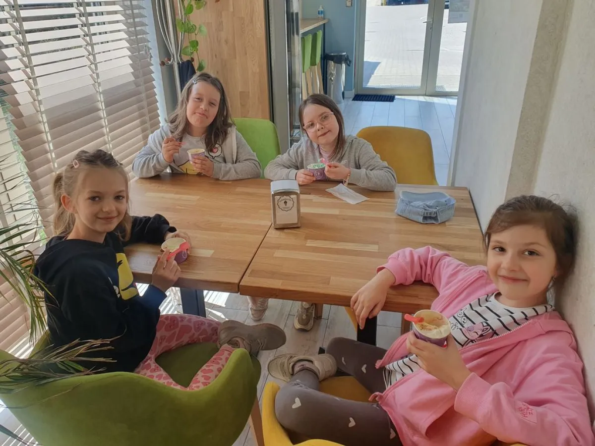 Klasa 1c świętowała zdobycie I miejsca w szkolnym konkursie z okazji Dnia Życzliwości „Podniebny łańcuch” pyszną nagrodą – wspólnym wyjściem na lody! Przy stole nie brakowało śmiechu, rozmów i oczywiście pysznych lodów. Uczniowie mieli możliwość spróbowania różnych smaków w kawiarni – owocowe, śmietankowe, czekoladowe – wszystkie były wyśmienite. Później wybraliśmy się na spacer po naszej osiedlowej okolicy.