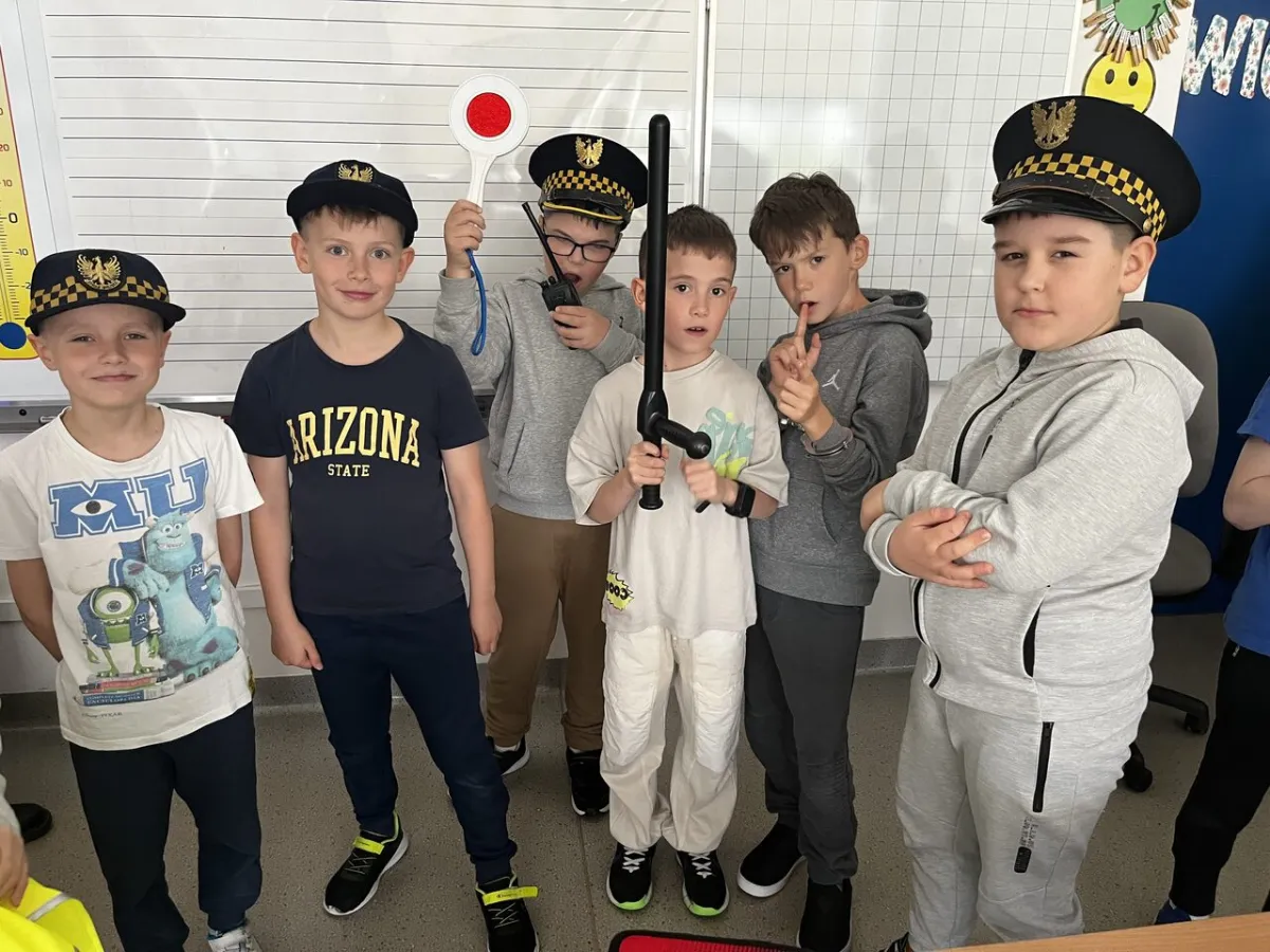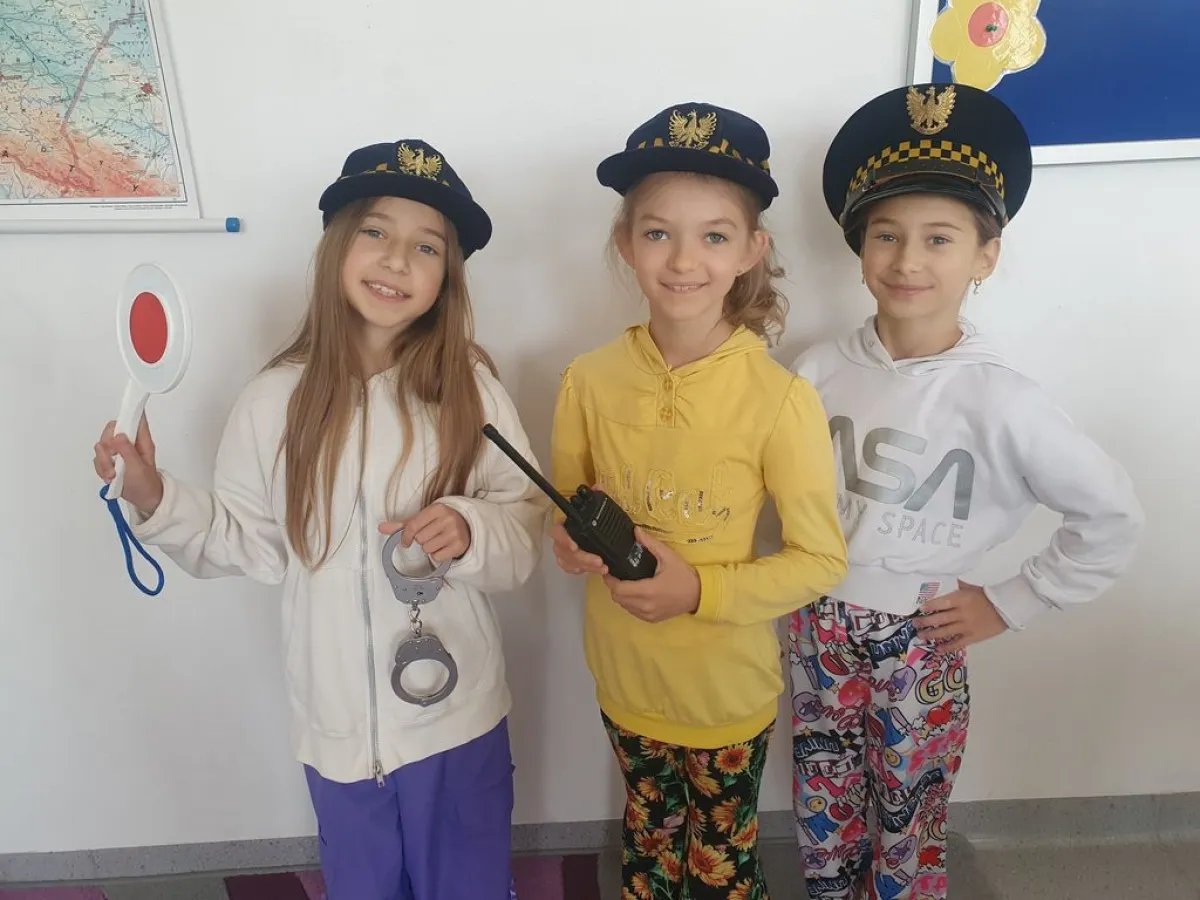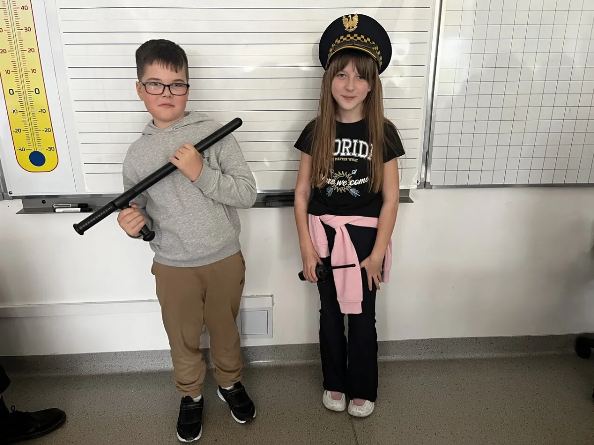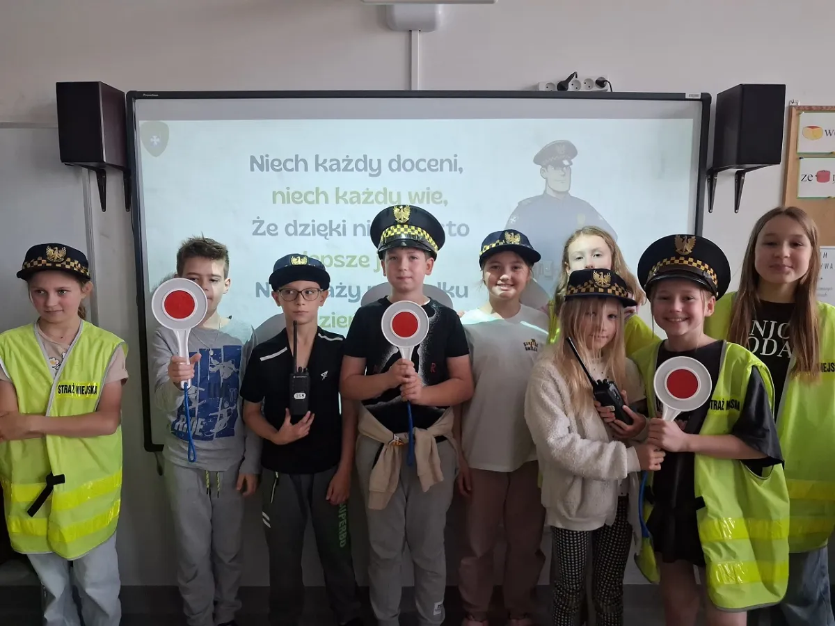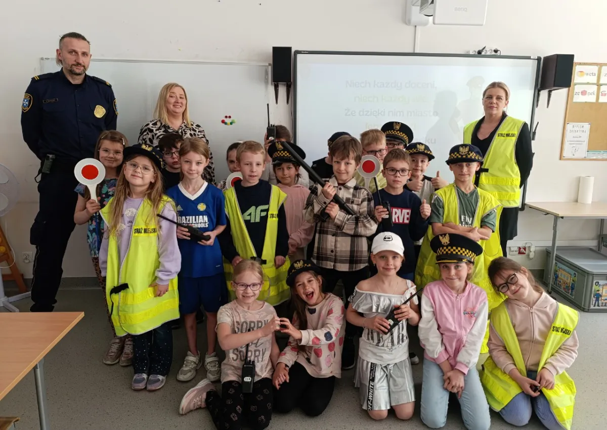 Następnie funkcjonariusze przeprowadzili krótką pogadankę na temat bezpiecznego poruszania się po drogach. Przypomnieli jak prawidłowo przechodzić przez jezdnię, jak ważne jest noszenie odblasków oraz jak zachowywać się w kontaktach z nieznajomymi. Na zakończenie funkcjonariusze zaprezentowali umundurowanie oraz sprzęt, z którego korzystają w pracy. Dzieci z radością je oglądały i przymierzały. Wizyta strażników miejskich była bardzo ciekawa i pouczająca. Uczniowie dowiedzieli się wielu ważnych rzeczy na temat bezpieczeństwa i zrozumieli, że strażnik miejski to osoba, która pomaga i dba o porządek w naszym otoczeniu. Spotkanie na długo zostanie w pamięci naszych uczniów.